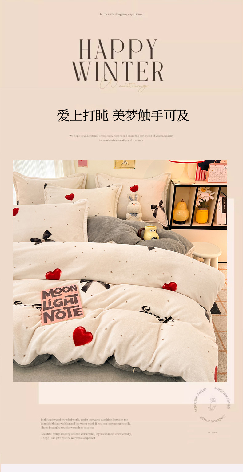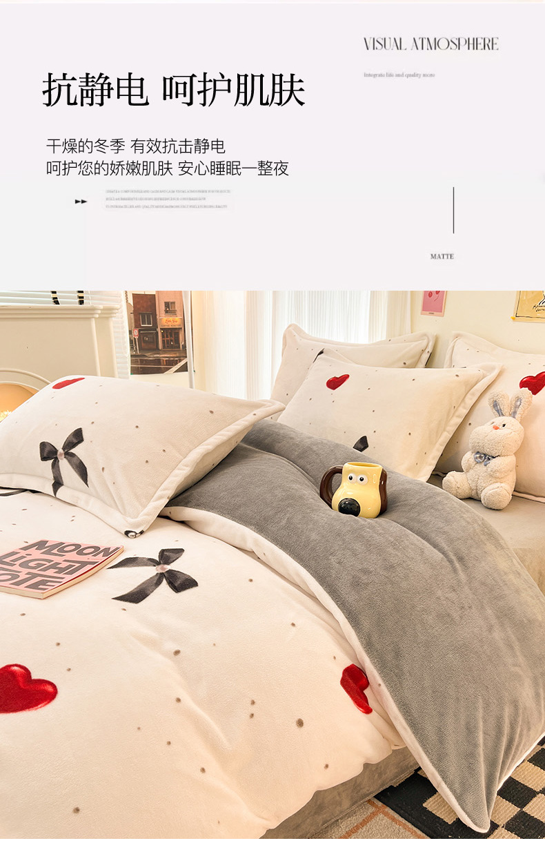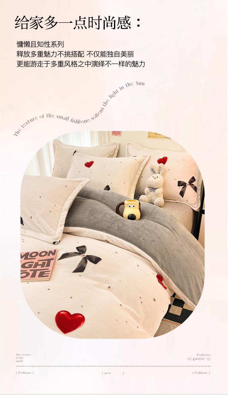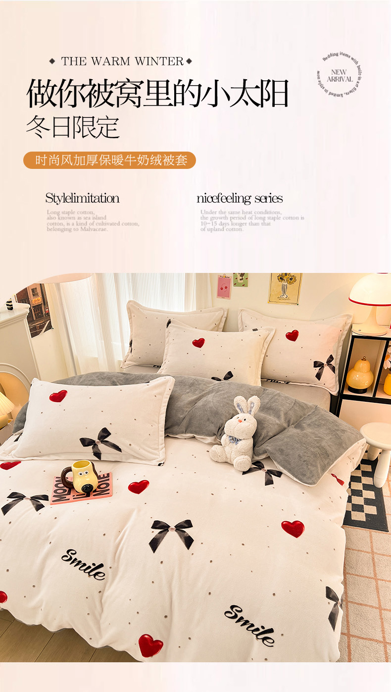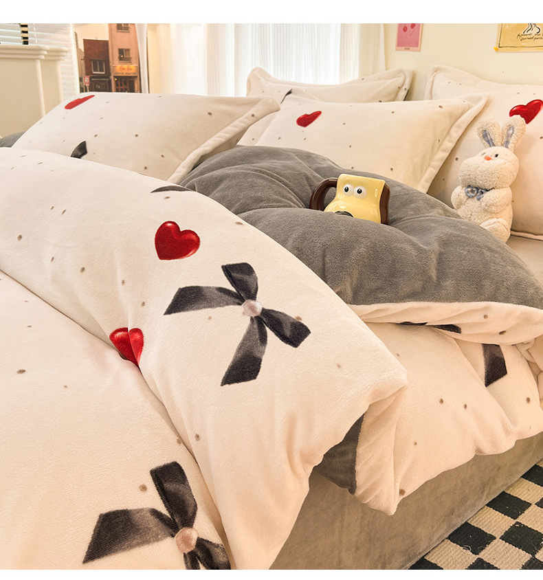 商品名称:2024新款A类高克重时尚风牛奶绒加厚保暖系列套件单品-被套 爱心蝴蝶结