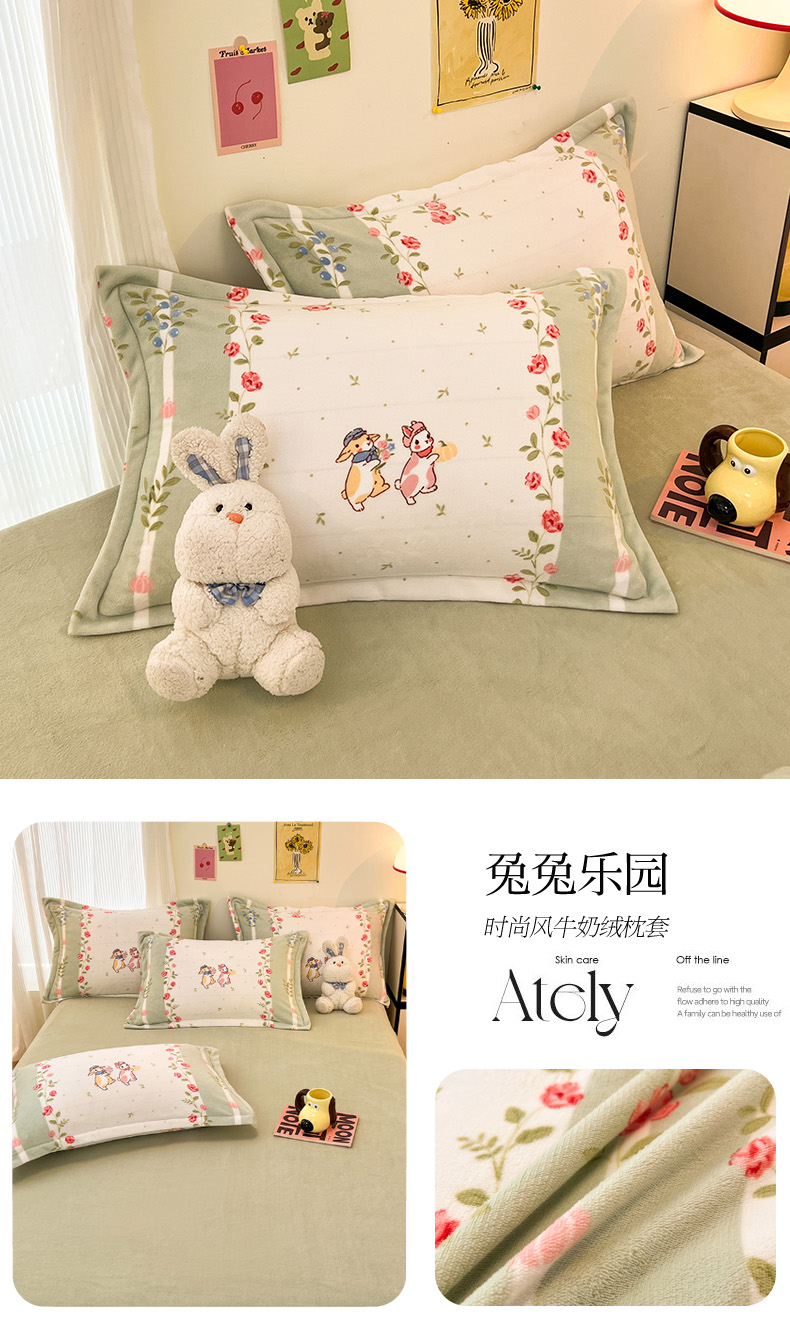 商品名称:2024新款A类高克重时尚风牛奶绒加厚保暖系列--枕套 花花小兔粉