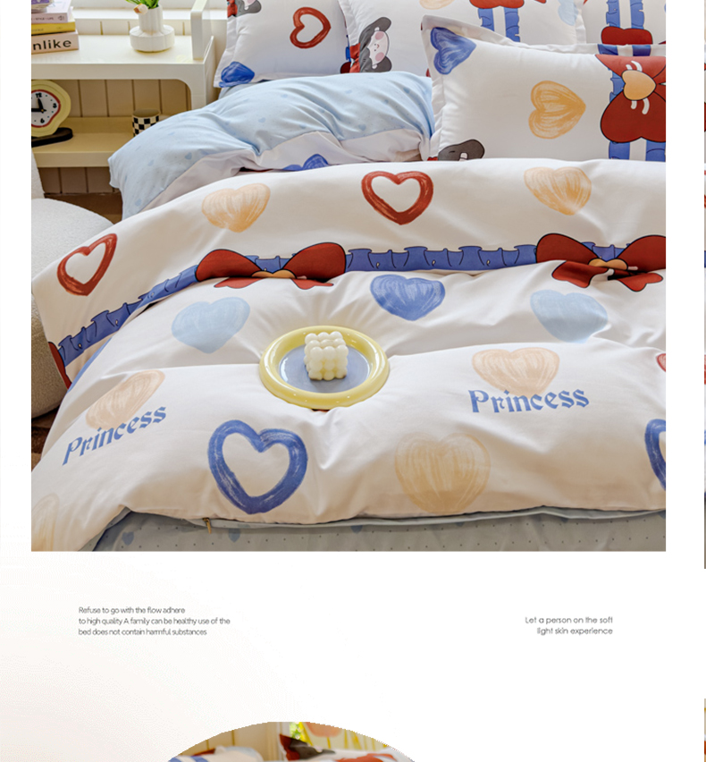 当前位置: 91家纺网 > 商品网购 > 床品套件 > 四件套 > 磨毛活性四件套 > 佑佳家纺 2024新款140克磨毛印花植物羊绒单被套磨毛四件套 爱心女孩