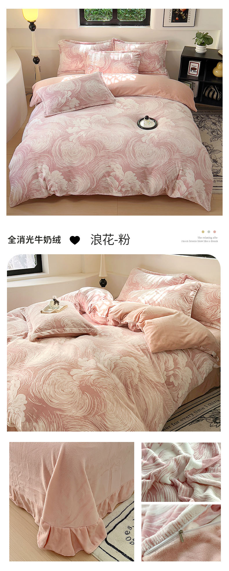商品名称:新印象 2025新款高克重牛奶绒烂花四件套雕花绒四件套浪花-粉