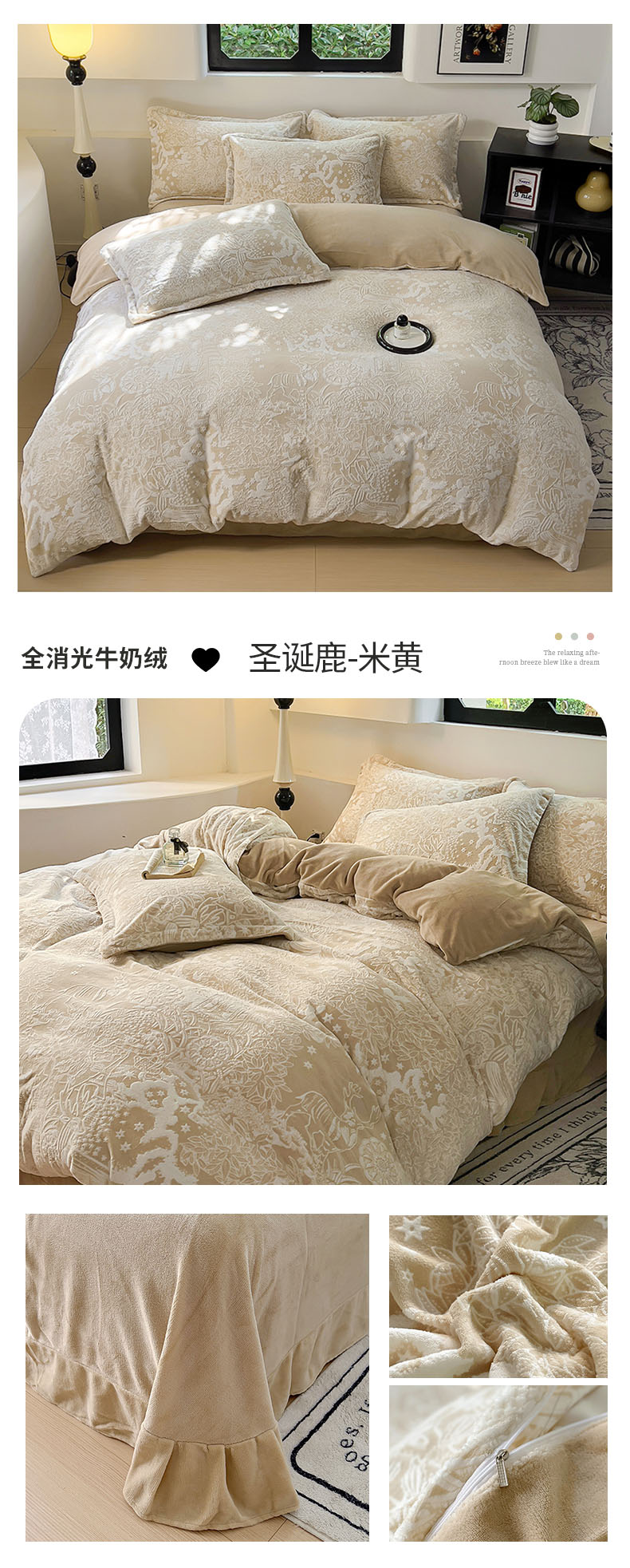 商品名称:新印象 2025新款高克重牛奶绒烂花四件套雕花绒四件套圣诞鹿-米黄