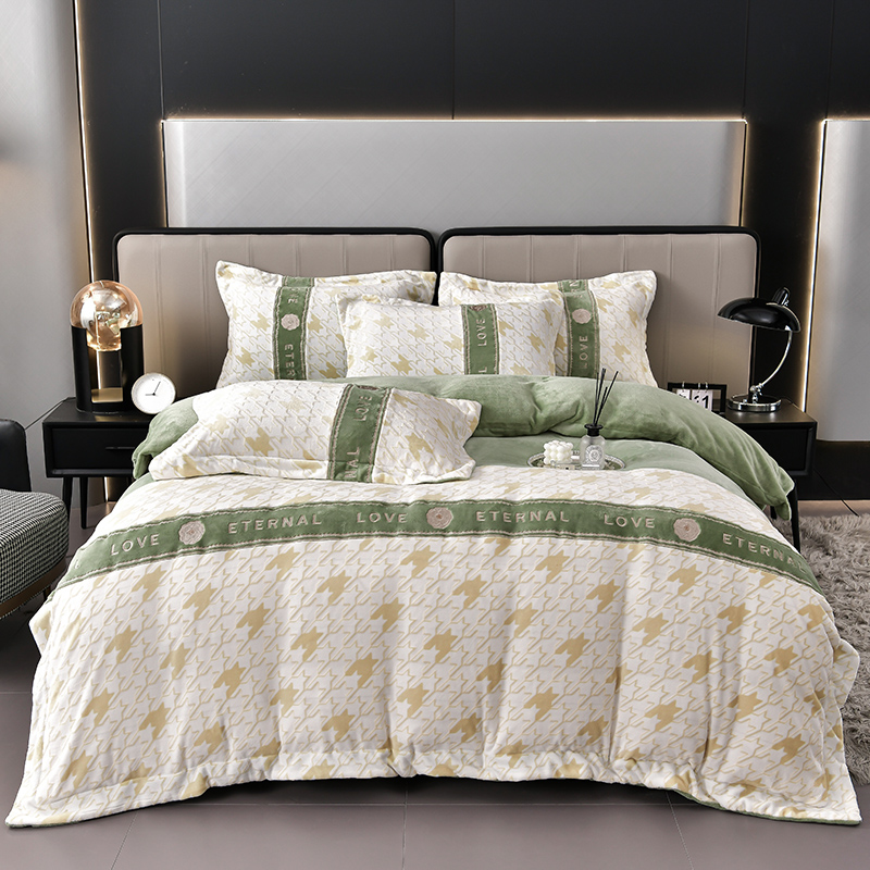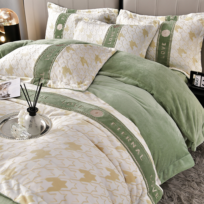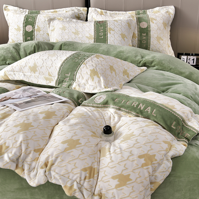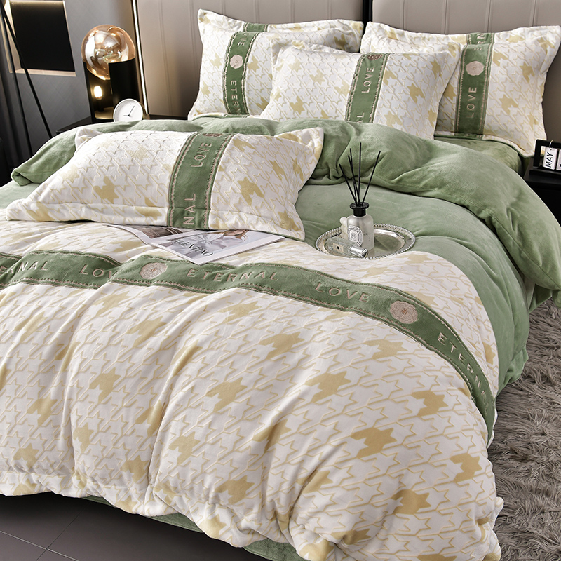 妮恒美 2024新款牛奶绒四件套雕花刺绣千鸟格法莱绒四件套 千鸟格-浅灰绿