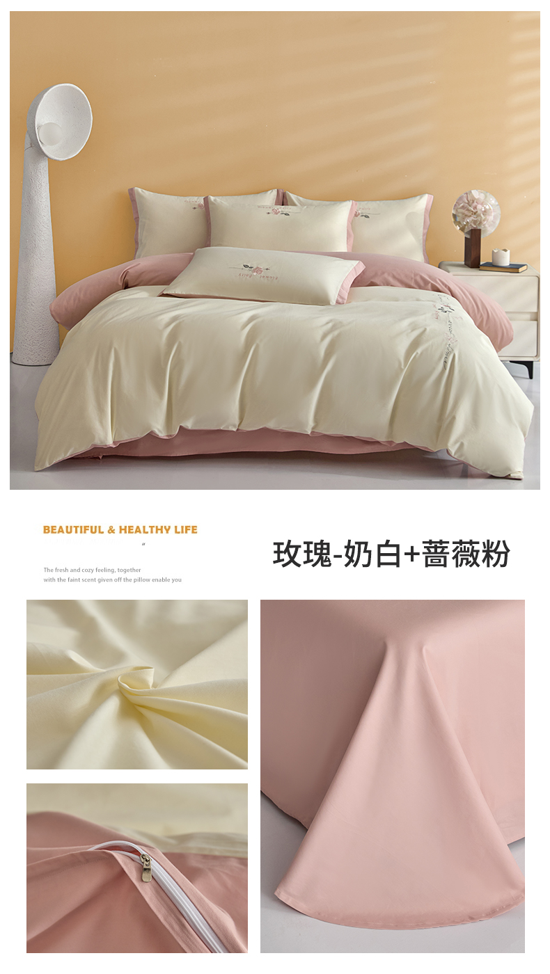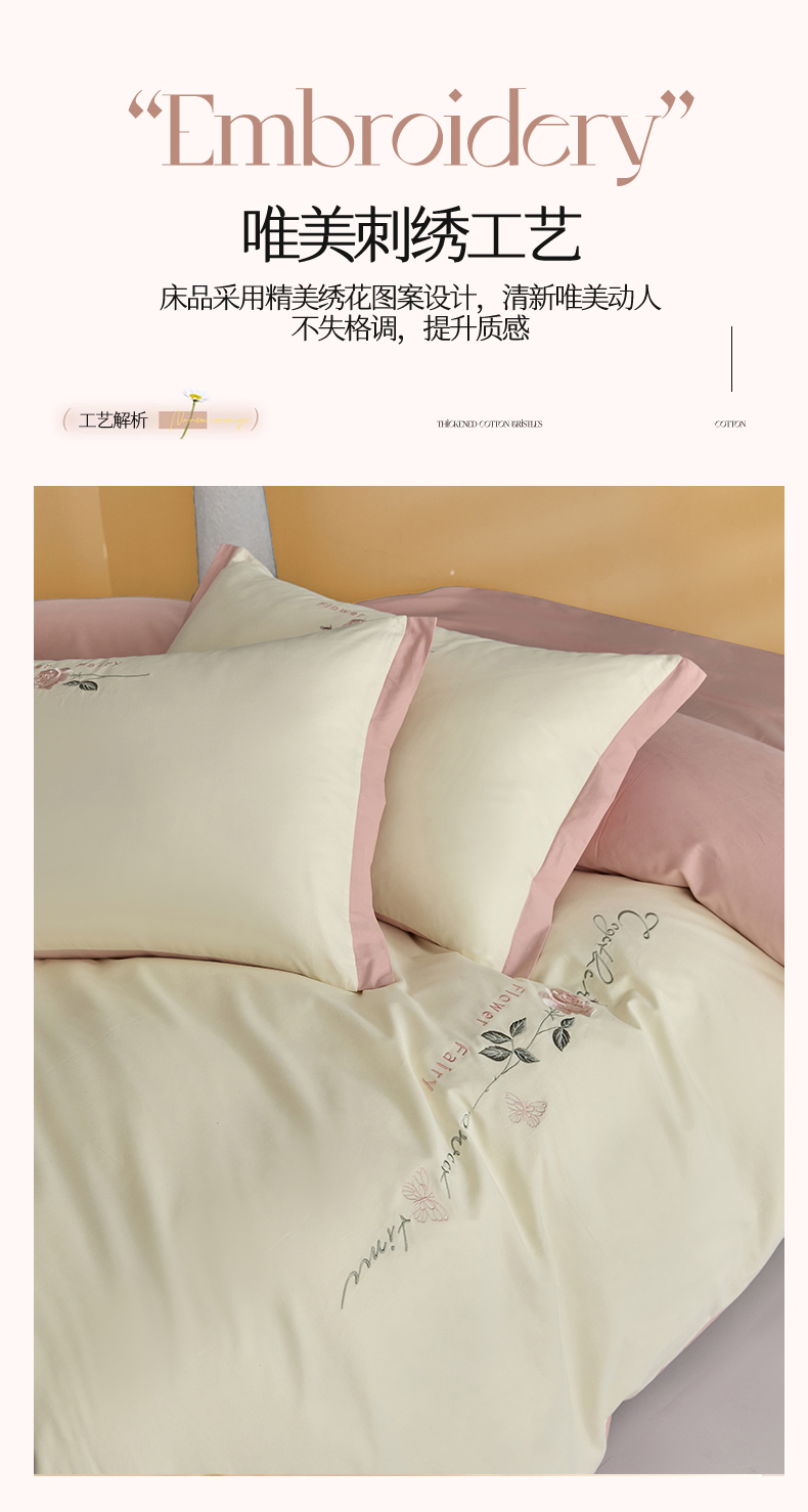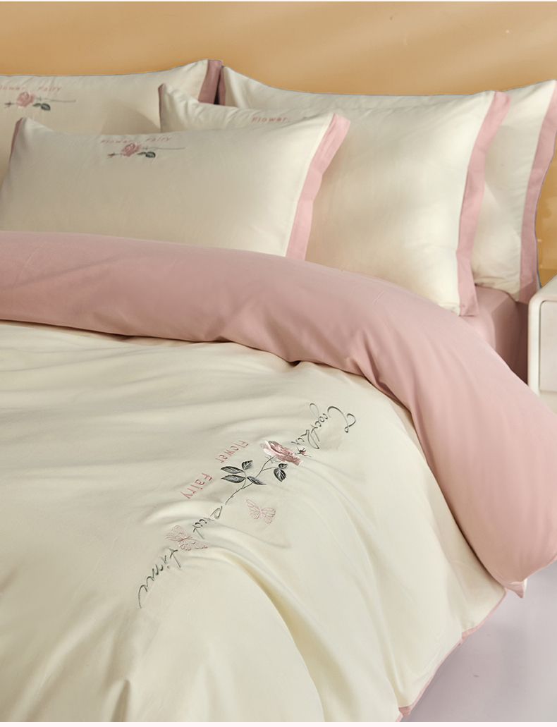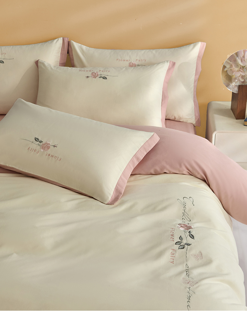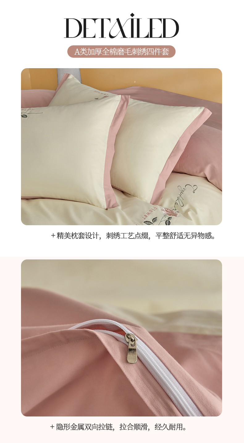 新保暖-秋冬A类加厚全棉磨毛刺绣四件套-玫瑰花香系列(礼盒包装) 玫瑰-奶白+蔷薇粉