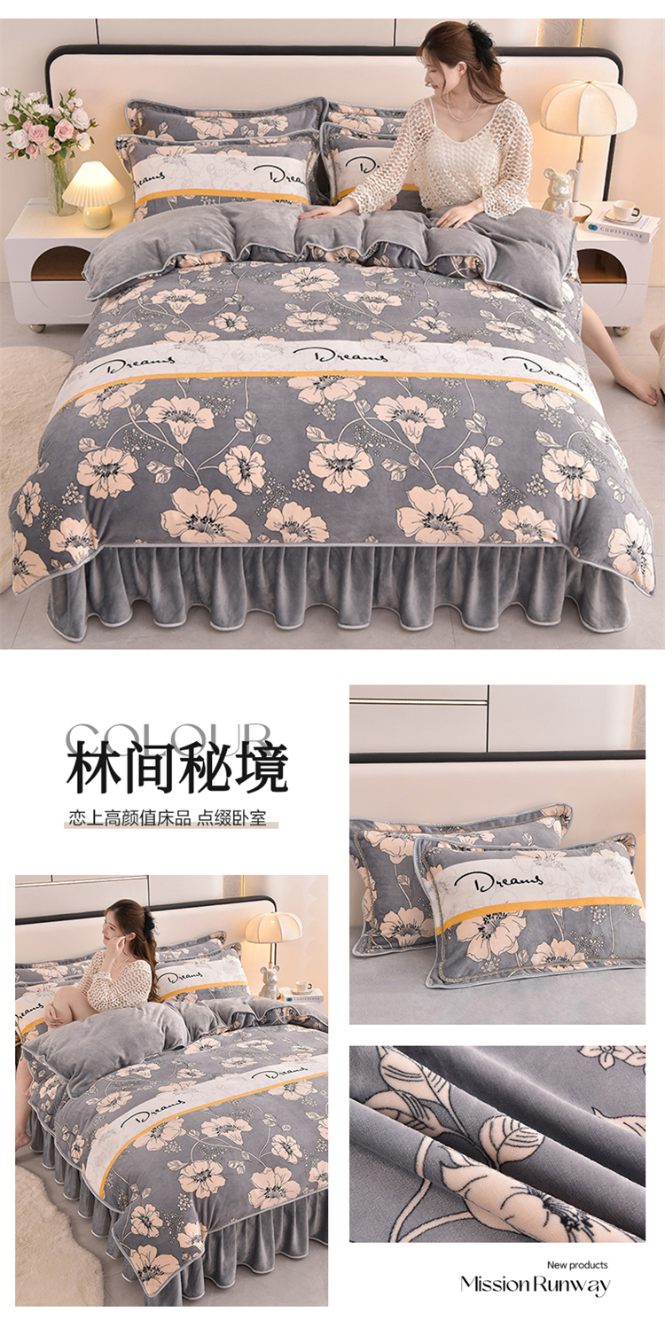 富之航 2024新款8-9斤高克重印花牛奶绒四件套保暖绒套件直播爆款林间秘境
