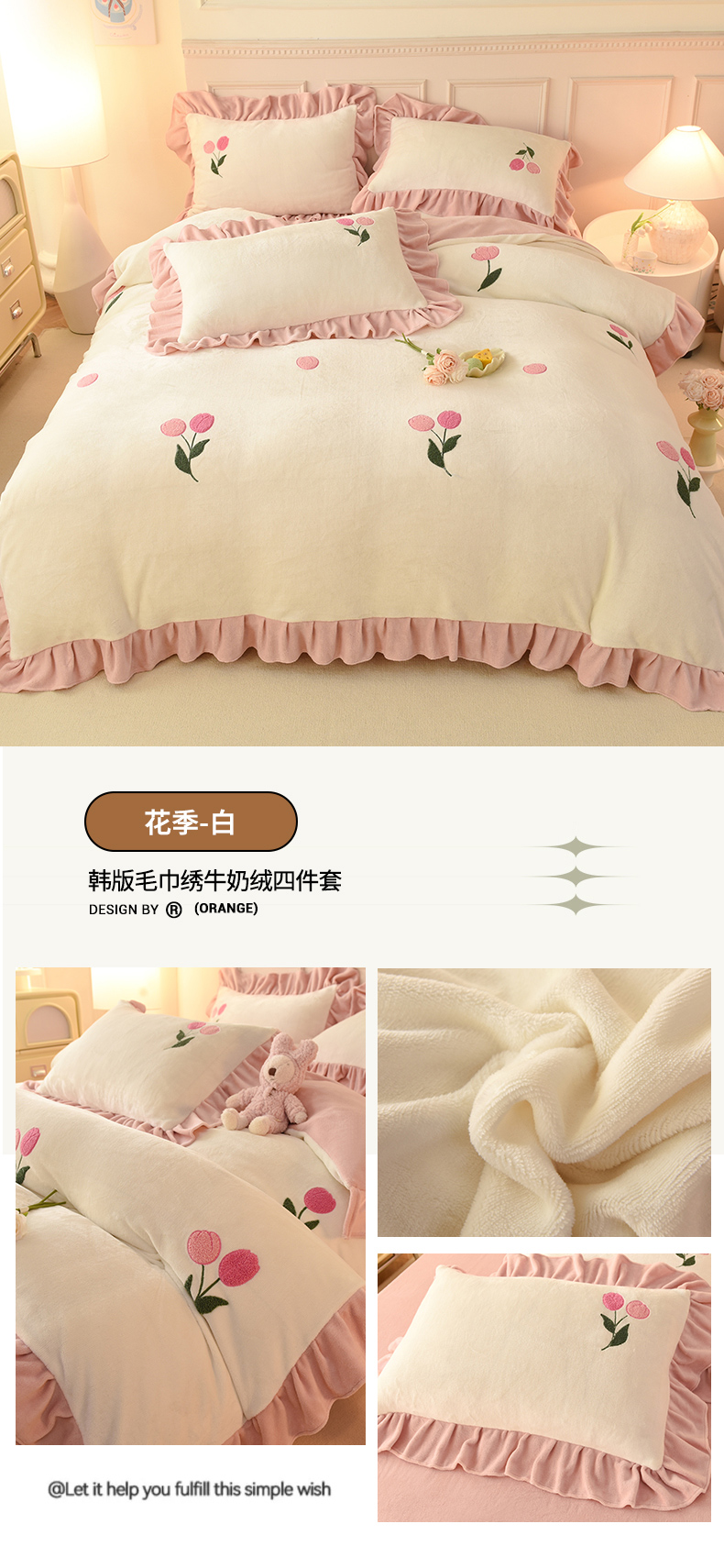 首尔 2024新款牛奶绒韩版毛巾绣四件套 花季-白