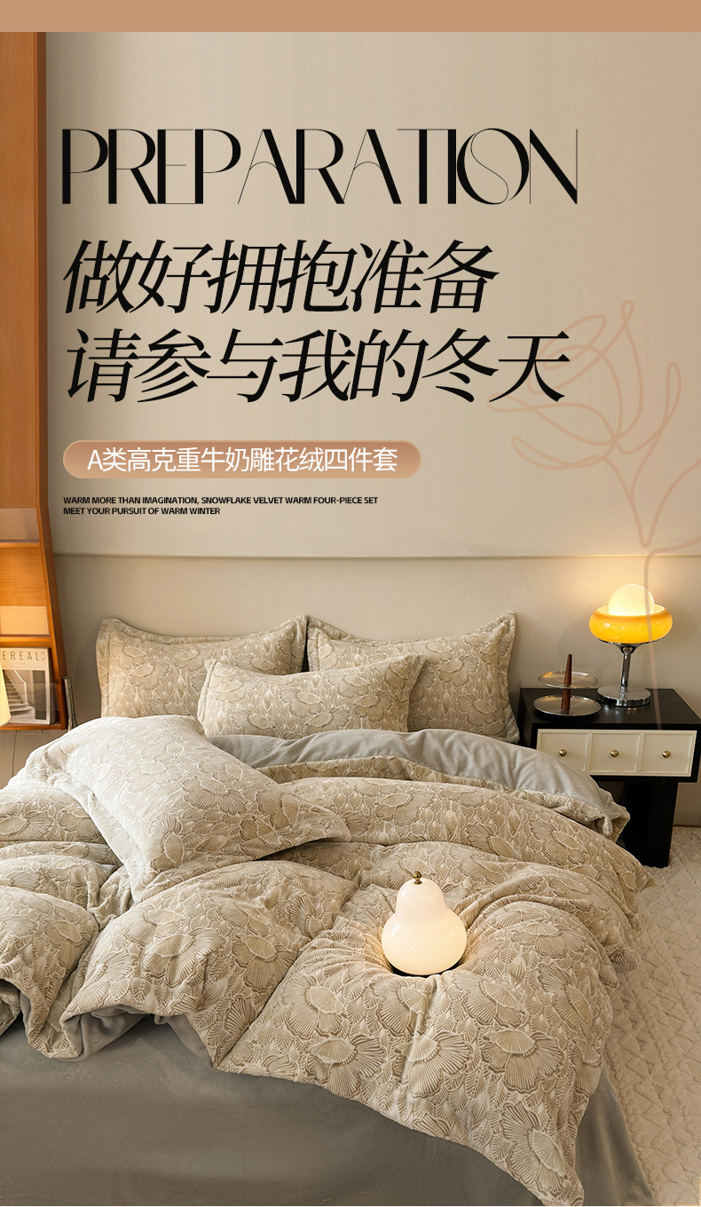 (总)米奈家居 2024新款A类牛奶雕花绒四件套-瑞丽,巴赫(卡其),巴赫(紫粉),花漾(淡雅粉),花漾(香槟),水墨(豆沙),水墨(卡其),邂逅(咖色),邂逅(绿色)