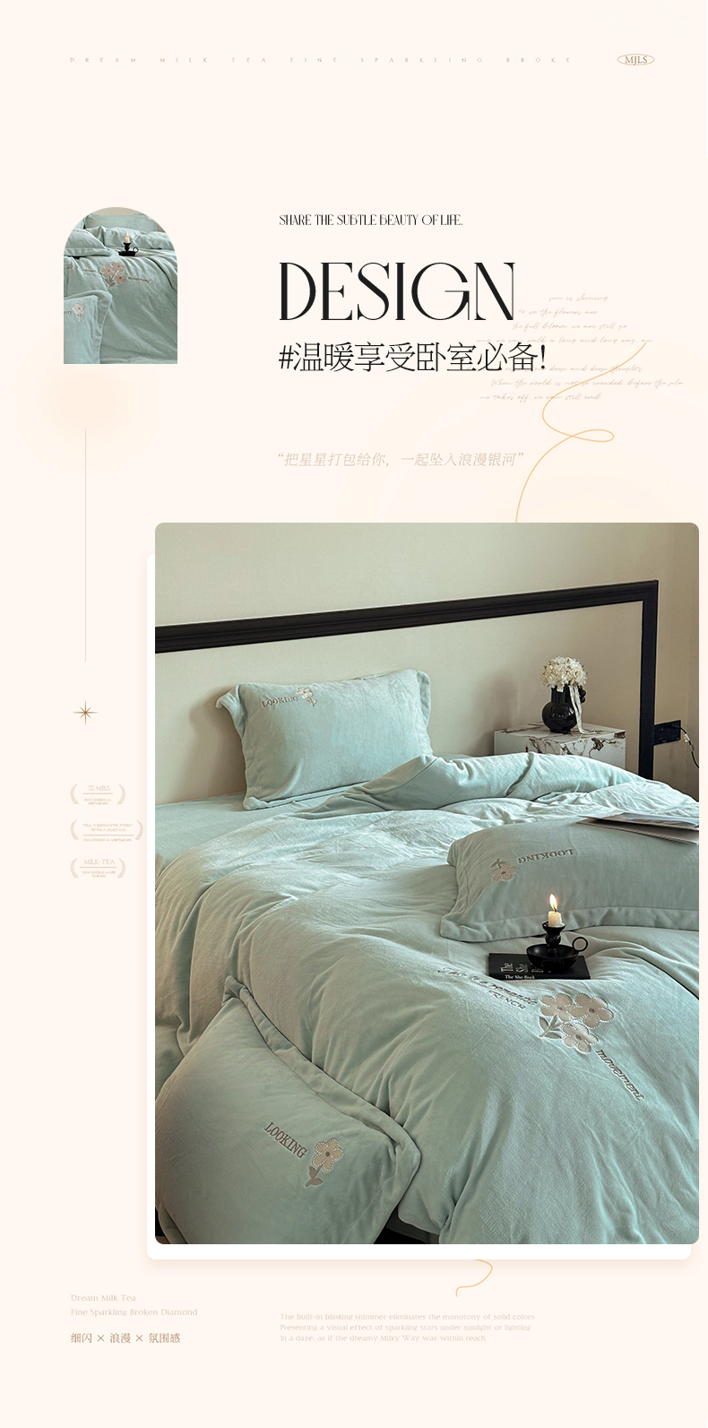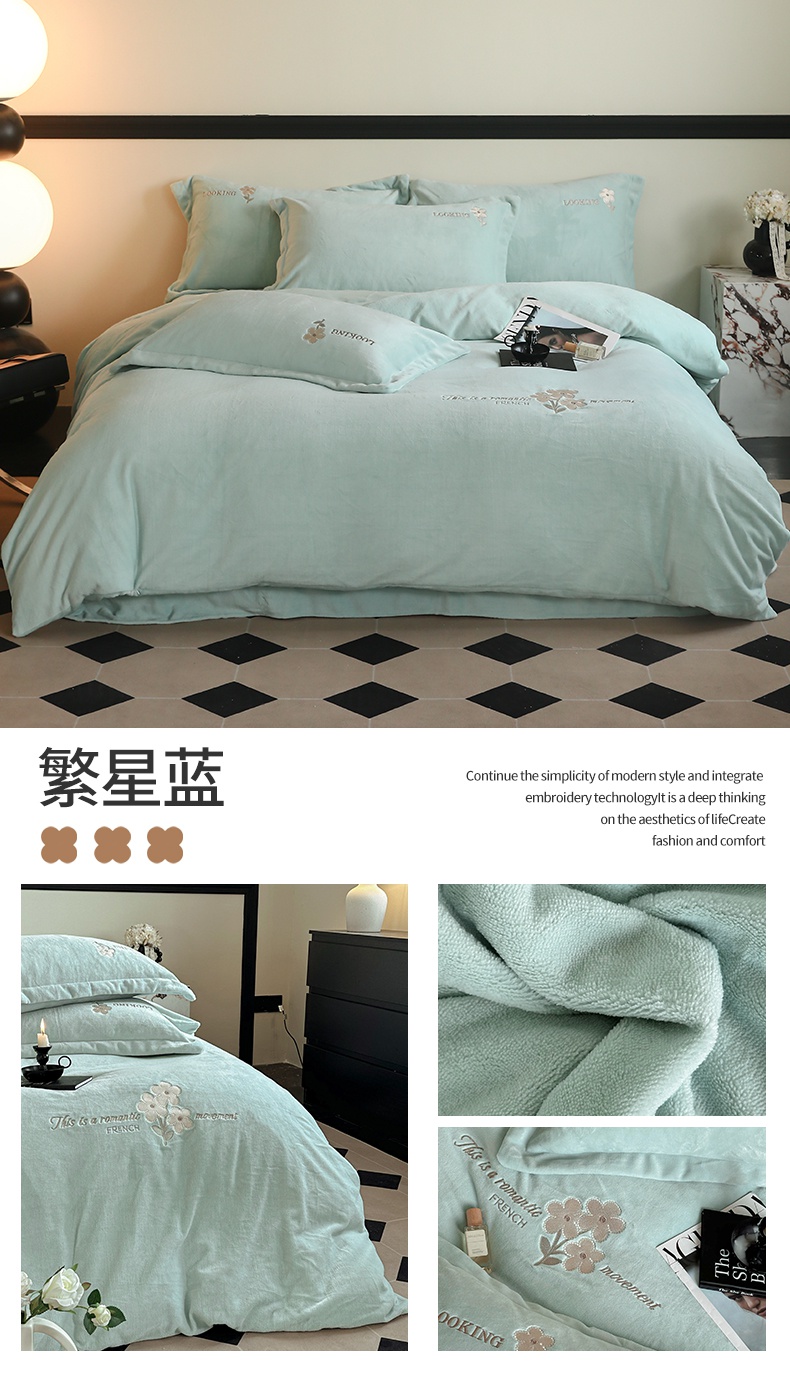 商品名称:泽西家纺 2024秋冬新款加厚保暖A类小清新刺绣牛奶绒四件套-米娅 繁星蓝