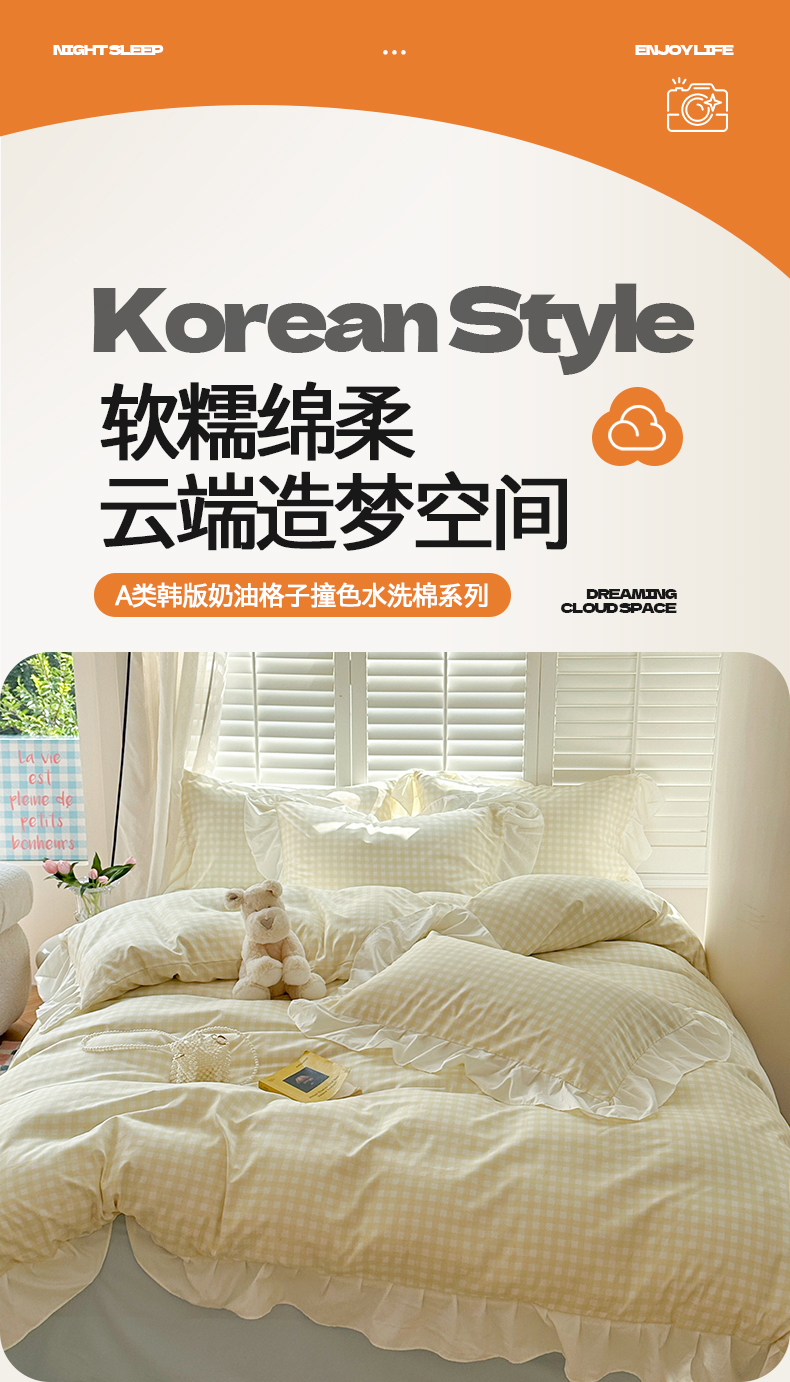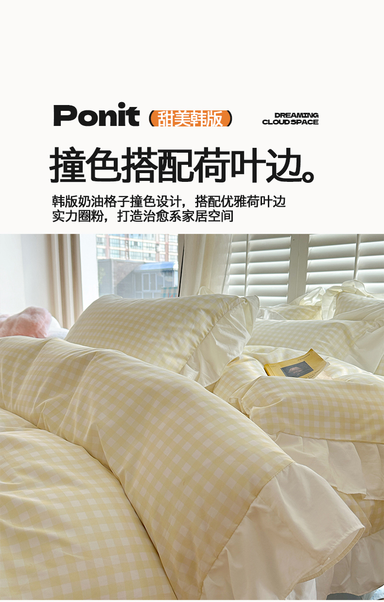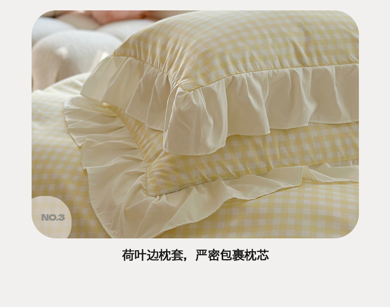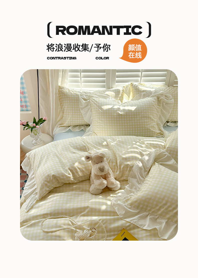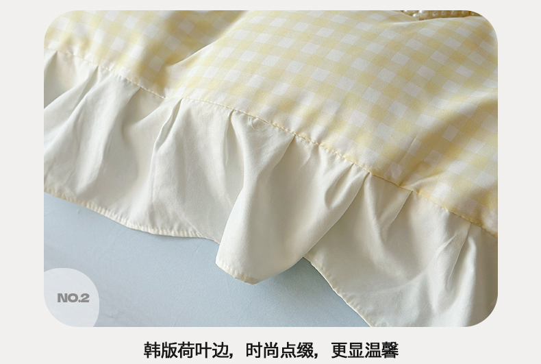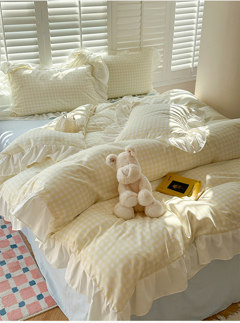 当前位置: 91家纺网 > 商品网购 > 床品套件 > 四件套 > 水洗棉四件套 > 桃心家居 2024新款A类亲肤舒适软糯云柔水洗棉化纤韩版奶油格子撞色水洗棉系列四件套 水洗棉花边-H奶黄格蓝