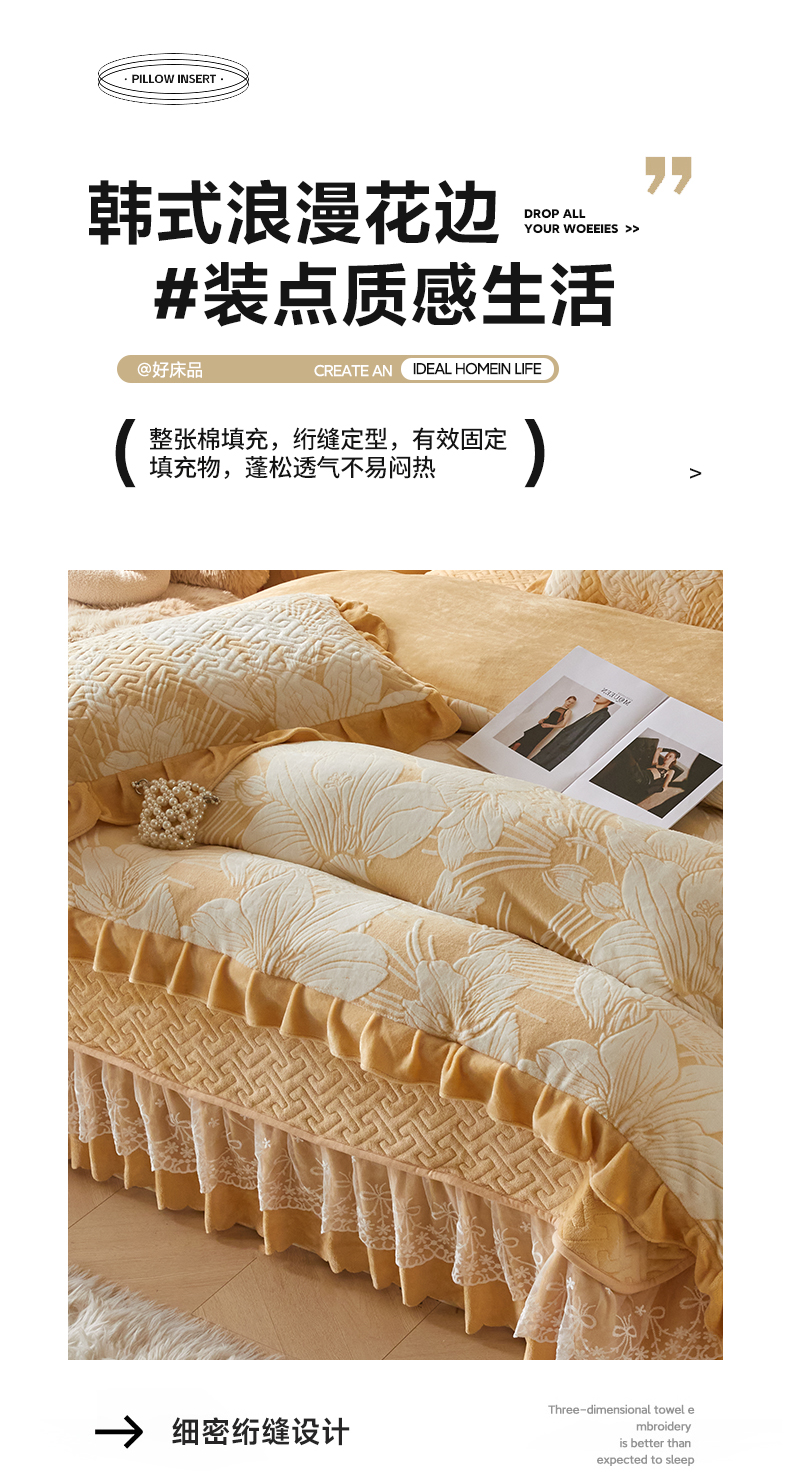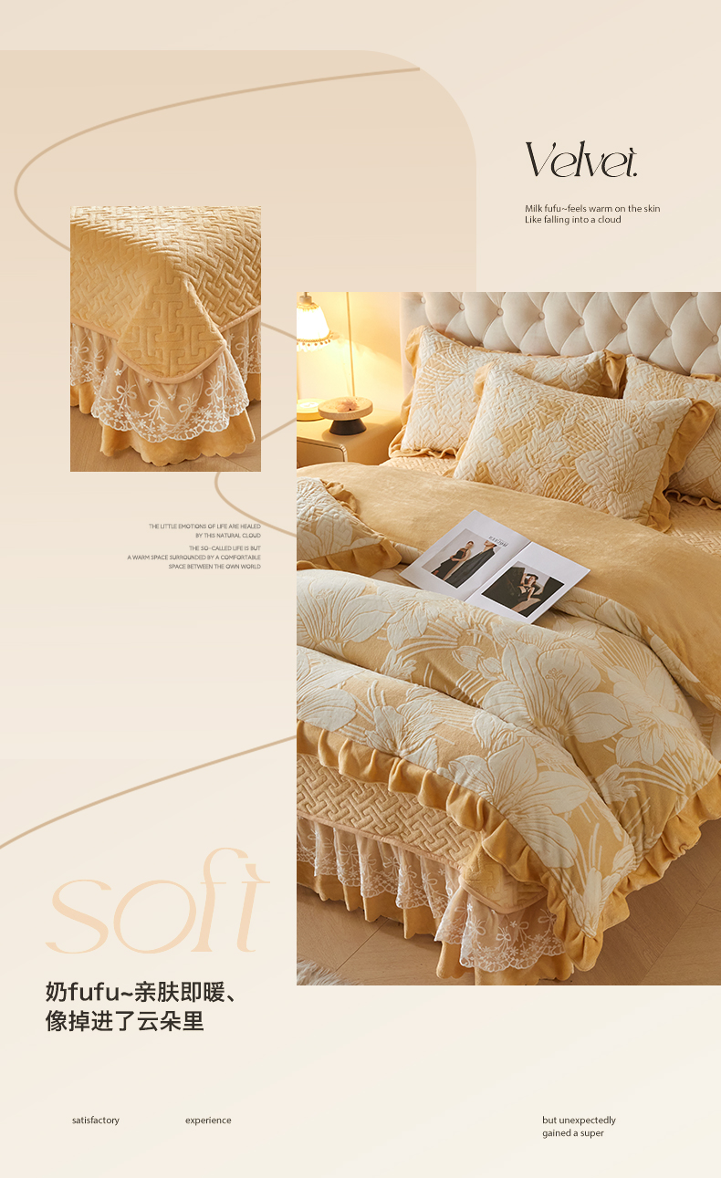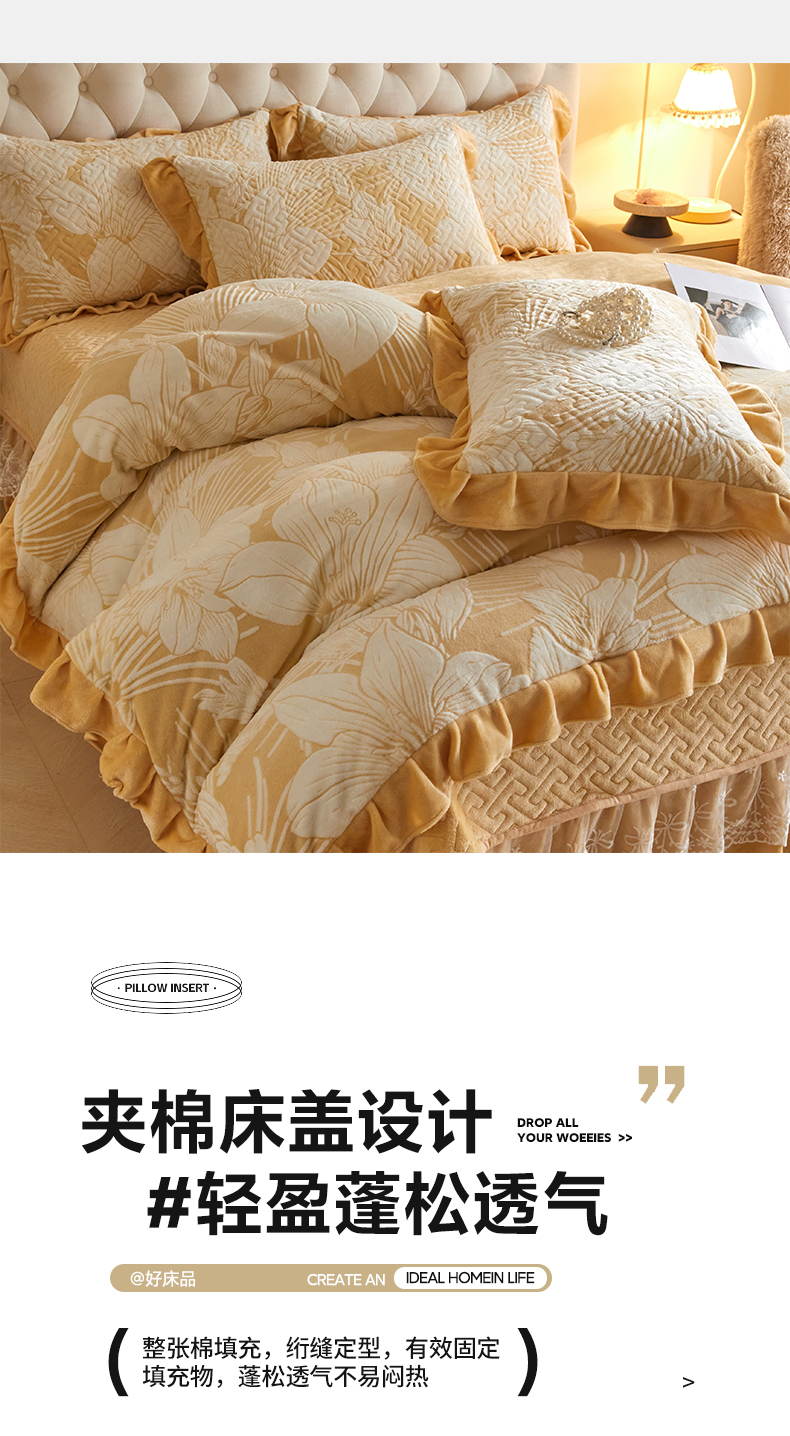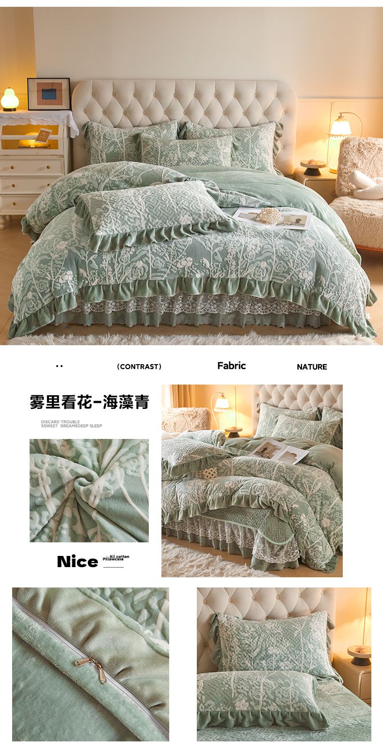 商品名称:畅畅家纺 2024新款11斤高克重新款韩版烂花牛奶绒床盖四件套系列 幽兰-嫩黄
