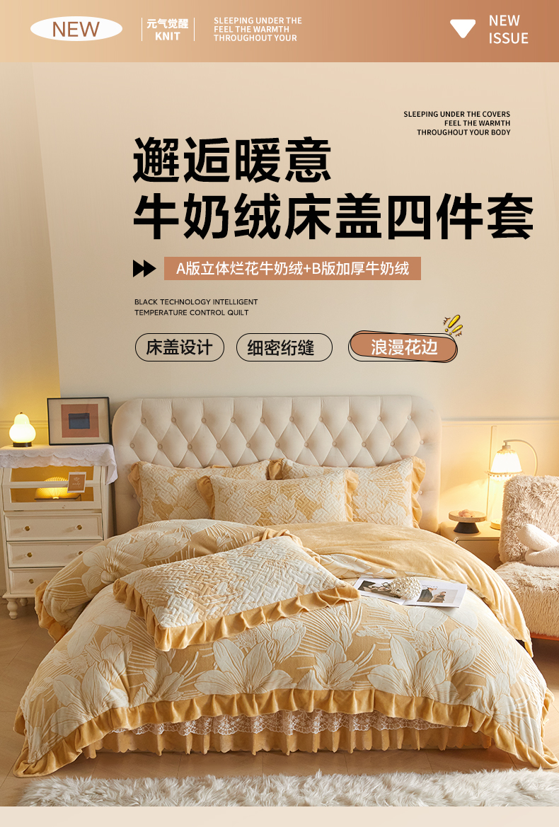 畅畅家纺 2024新款11斤高克重新款韩版烂花牛奶绒床盖四件套系列 幽兰-嫩黄