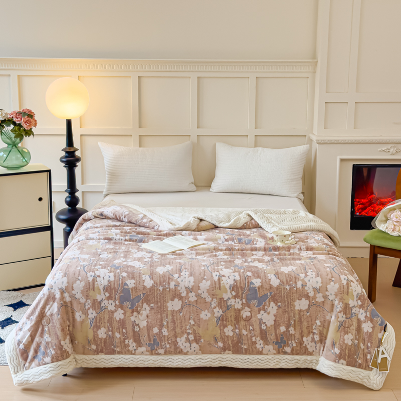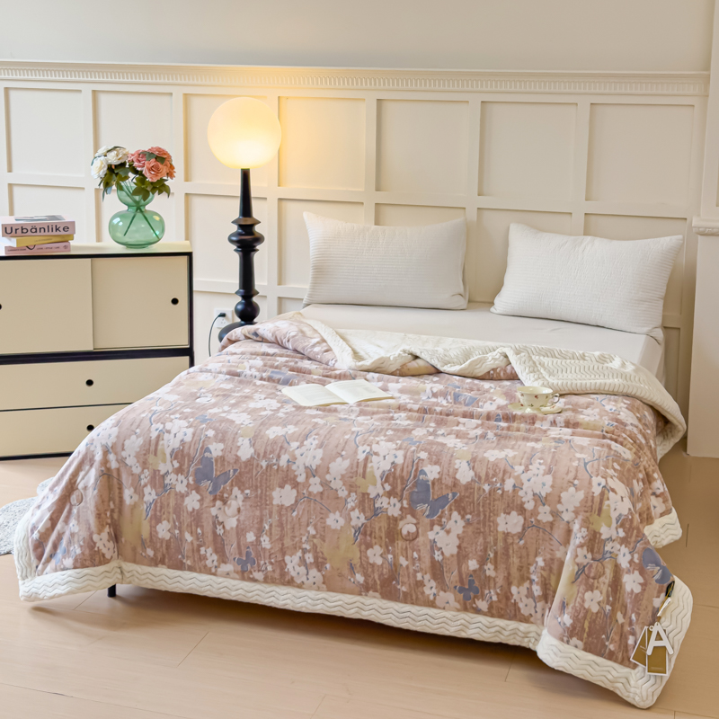 商品名称:金丝鸟 2024加厚240g立体雕花牛奶绒夹棉绗缝手包毛毯毯子 蝴蝶花咖 手包毯
