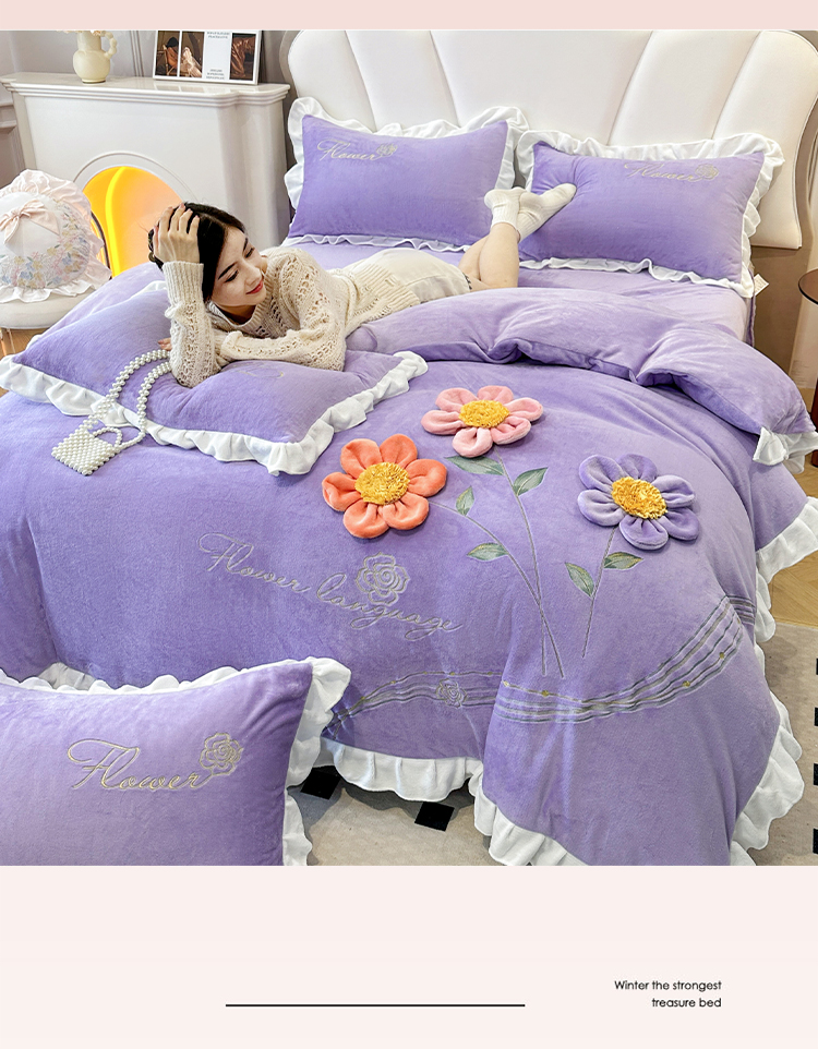 9斤高端韩版少女心法式公主风贴布绣花牛奶绒四件套小清新绒兔毛绒法莱绒床盖被套丝绒兔毛绒法莱绒床盖被套 潘多拉—梦幻紫