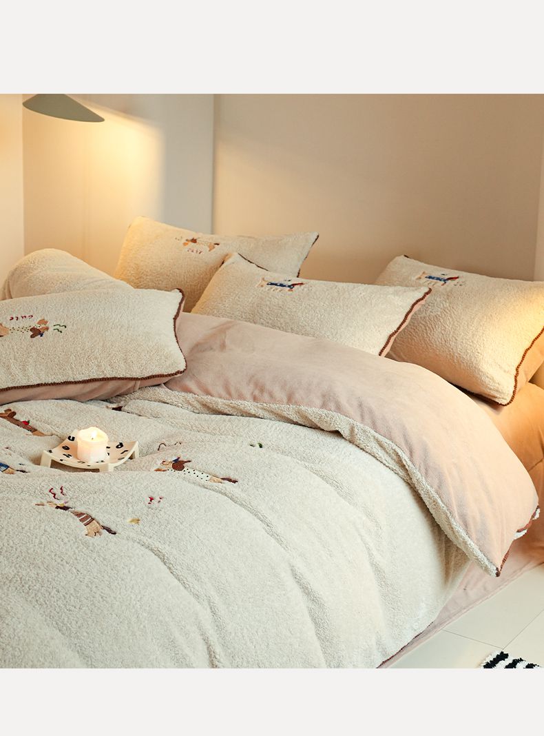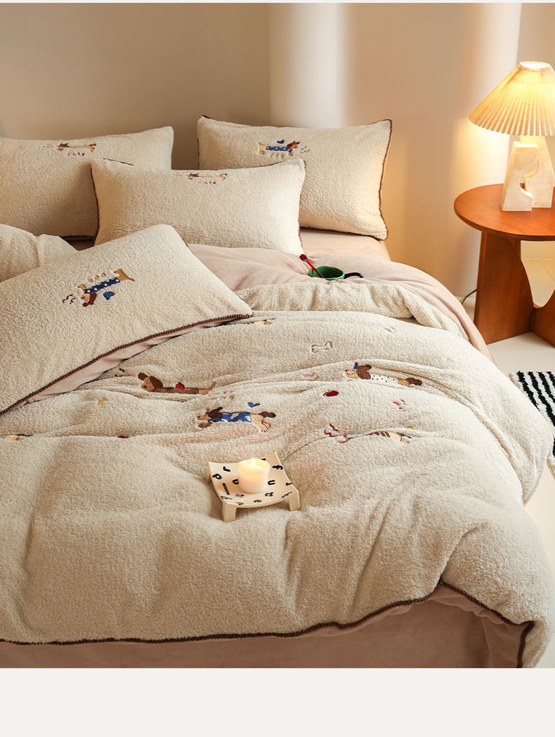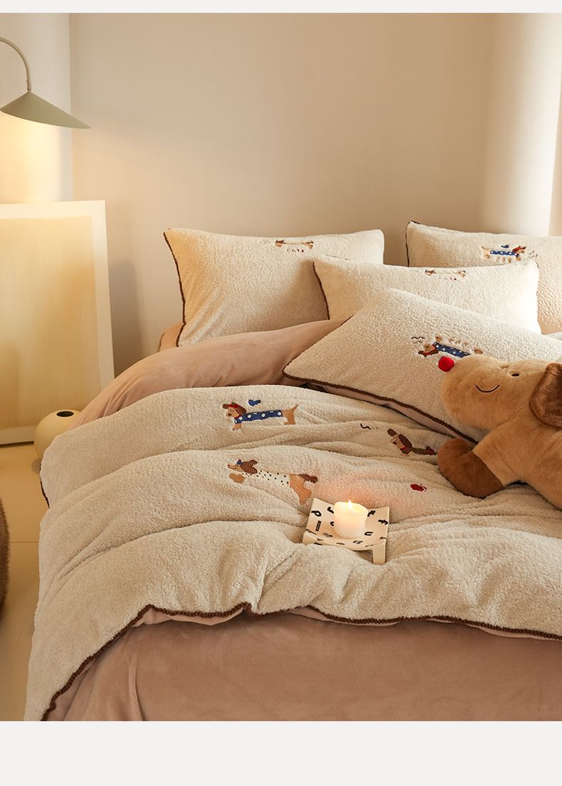 秀色家纺 2025新款少女心高克重绵羊绒牛奶绒床上四件套冬季毛巾绣被套原创卡通ins风 腊肠Dog