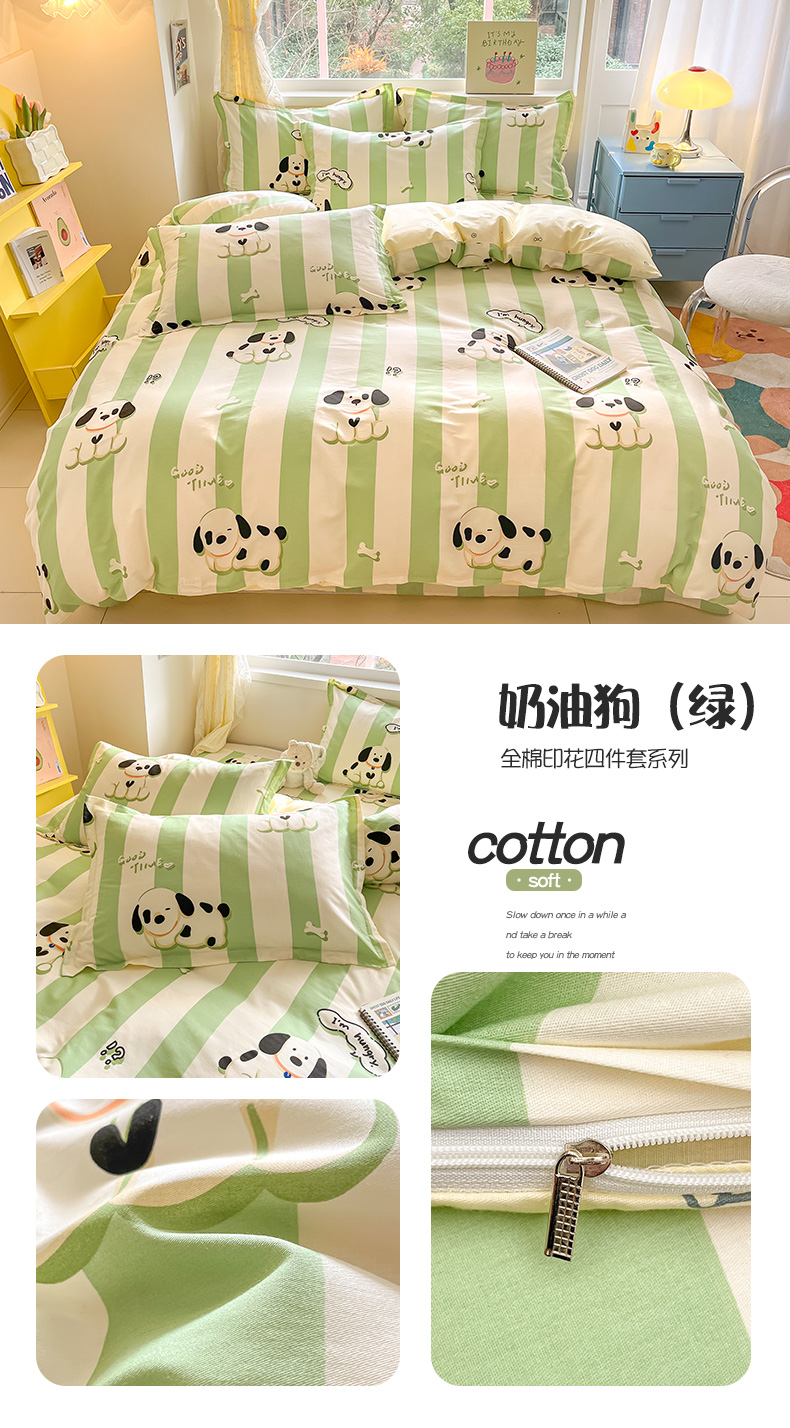 绵庭家纺 2024新款全棉印花四件套 奶油狗 绿