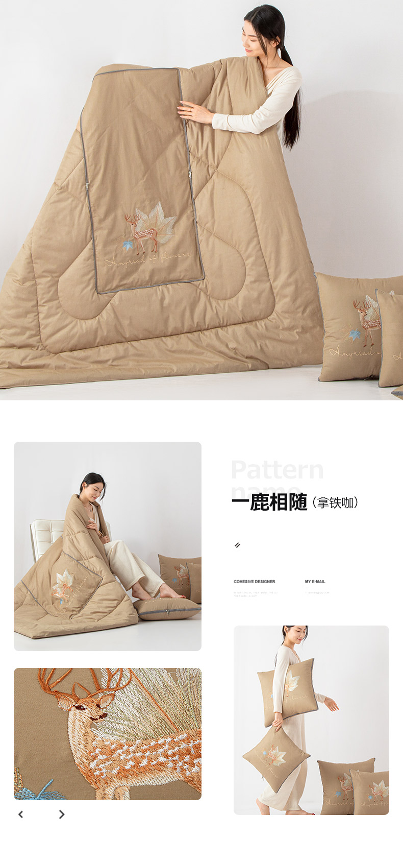 商品名称:雷人家纺 2023新款全棉喷气13*72刺绣抱枕被 一鹿相随(拿铁咖)