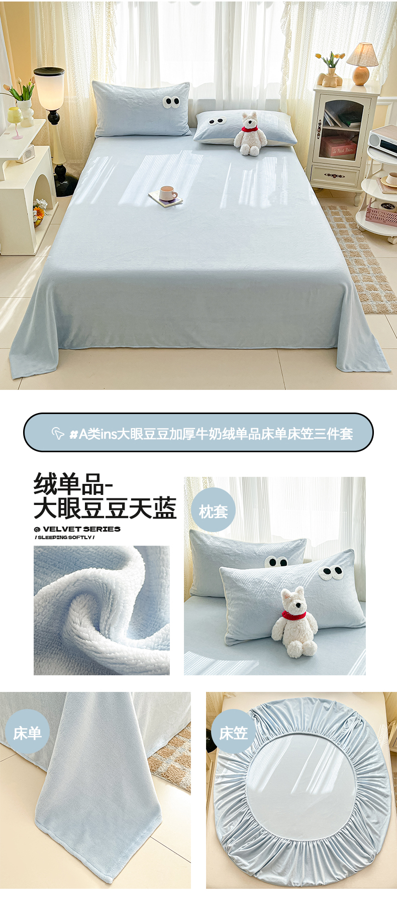 • 91家纺网 家纺一手货源 找家纺 桃子家居  2025新款A类ins大眼豆豆加厚牛奶绒单品床单床笠三件套系列 绒单品-大眼豆豆天蓝床笠