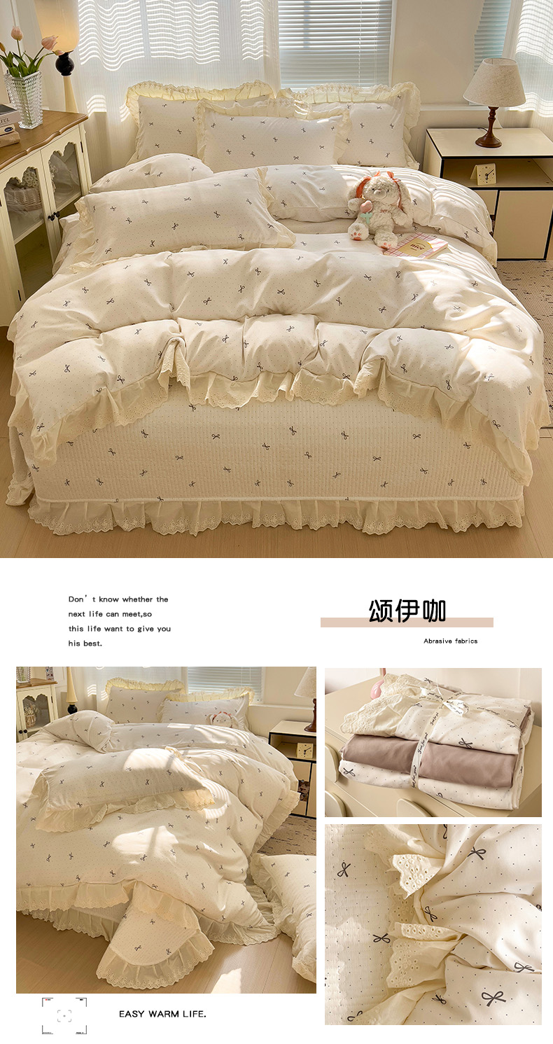 当前位置: 91家纺网 > 商品网购 > 床品套件 > 四件套 > 双层纱四件套 > 富米莱(原臻工厂) 2025新款A类针织双层纱花边款四件套床盖四件套 颂伊咖