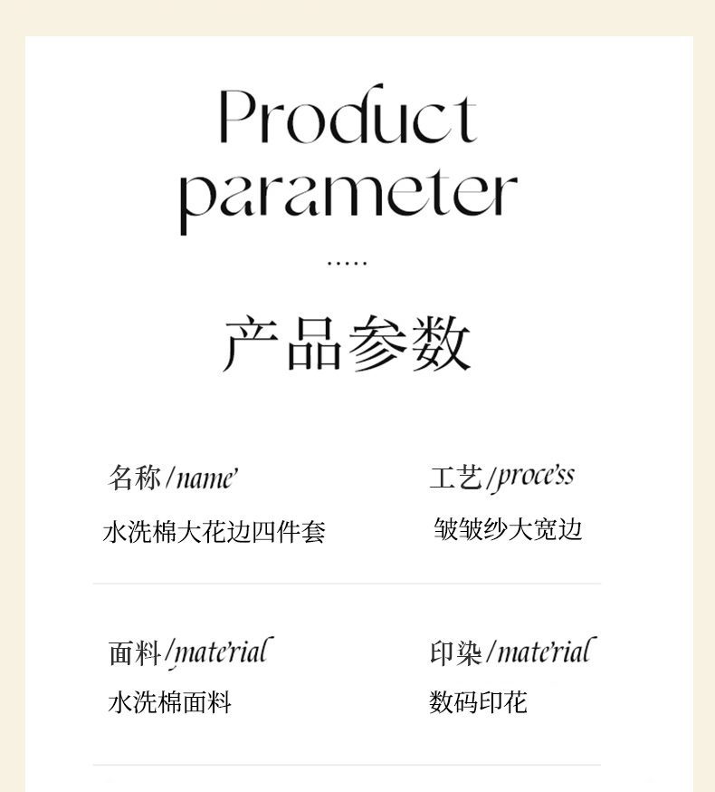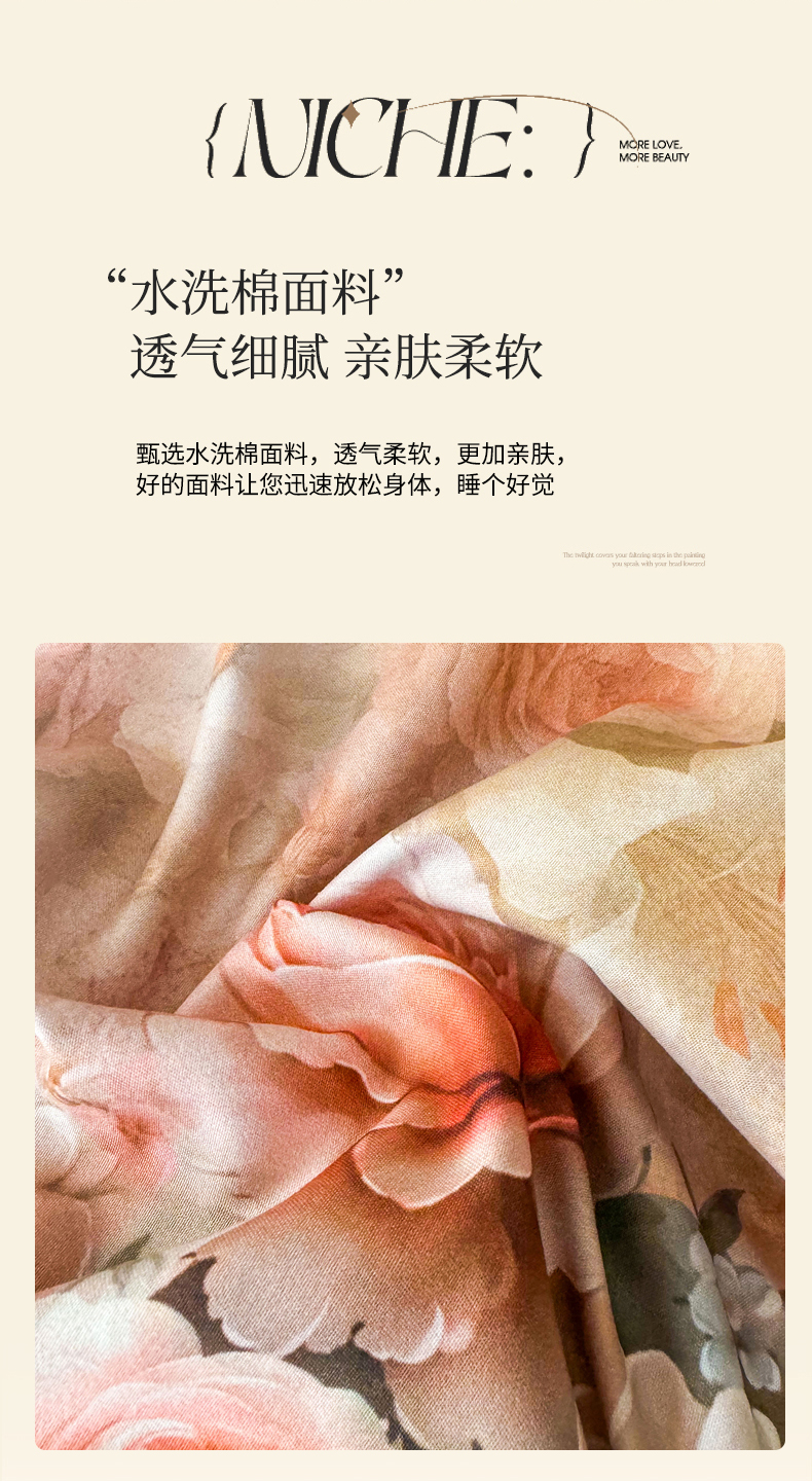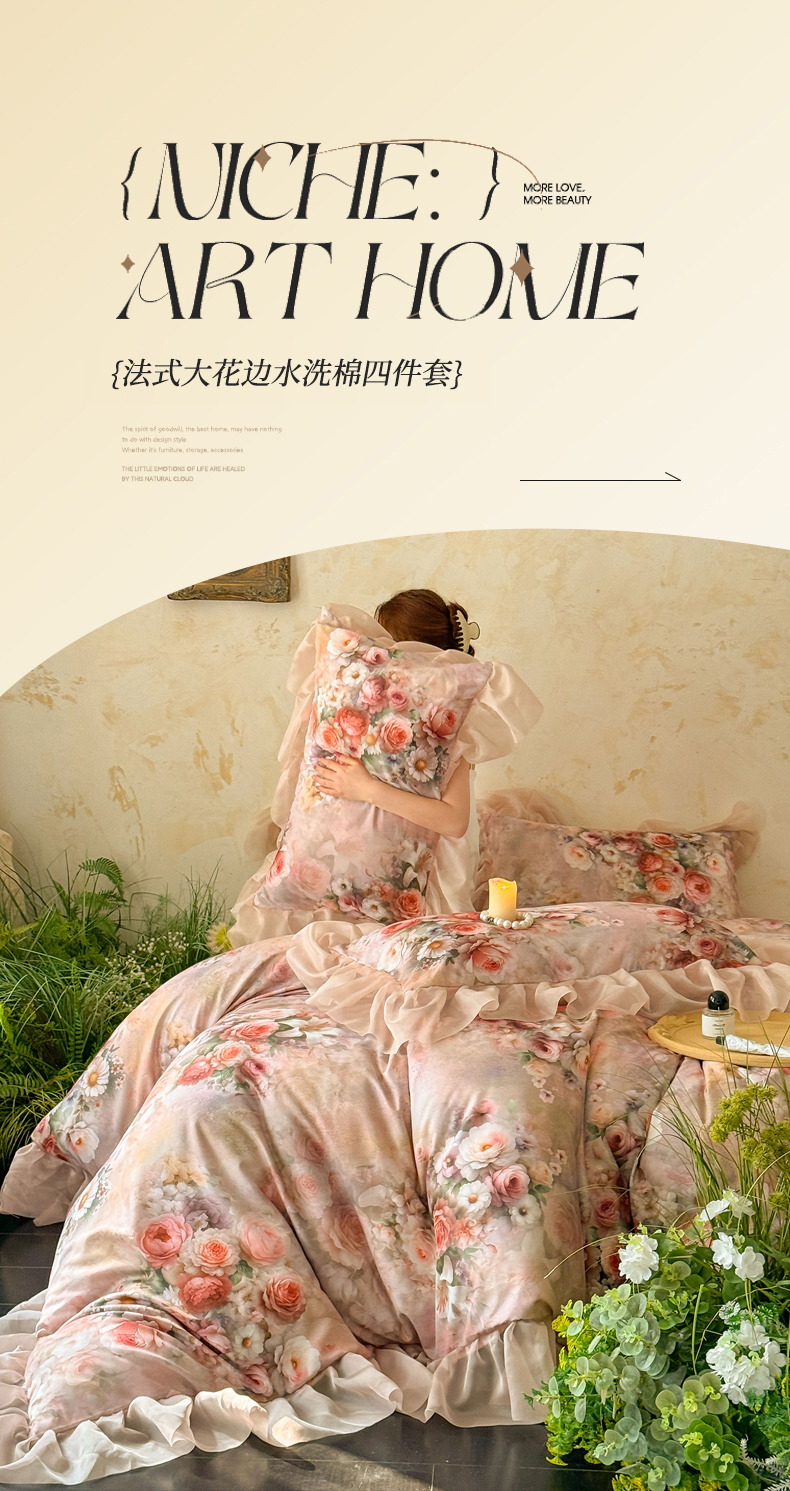 当前位置: 91家纺网 > 商品网购 > 床品套件 > 四件套 > 水洗棉四件套 > (总)你好美丽 2025新品水洗棉皱皱纱大宽边印花四件套
