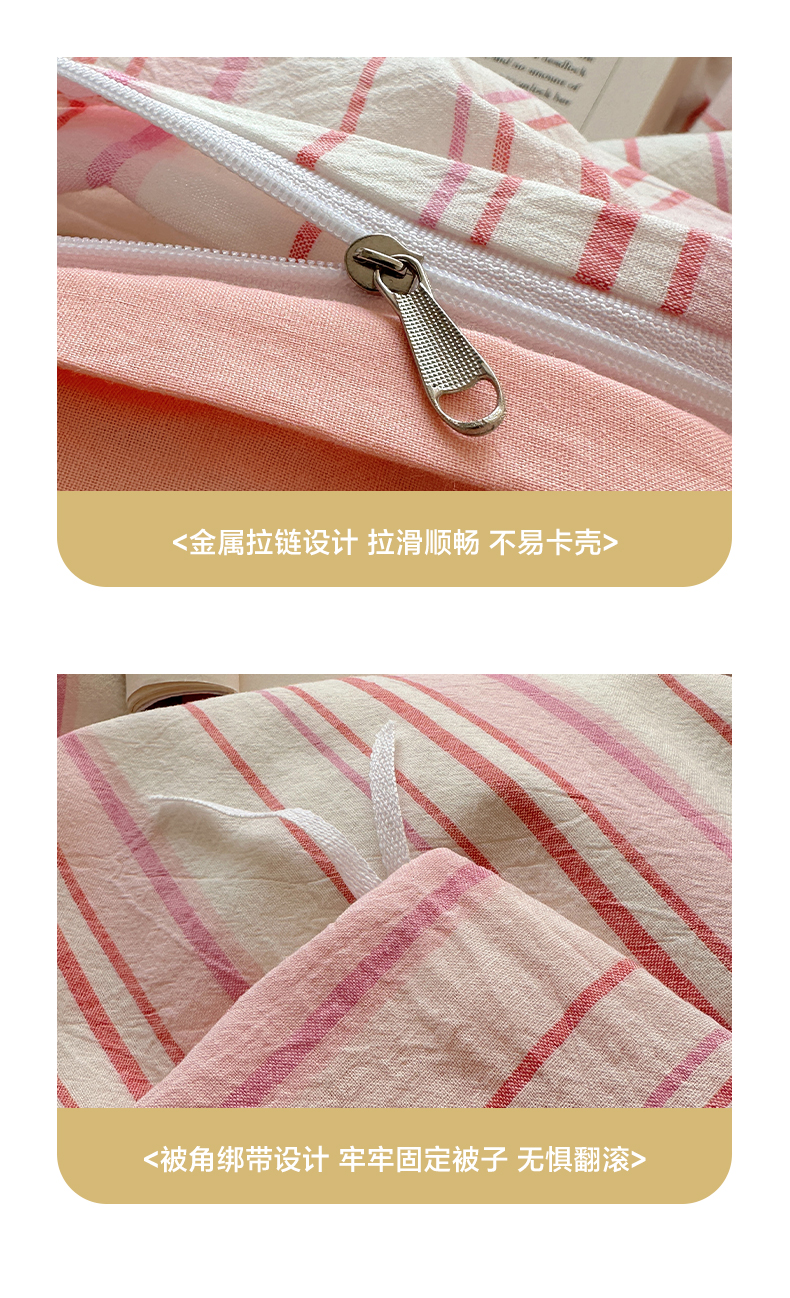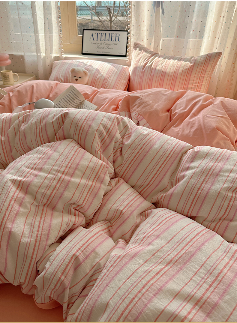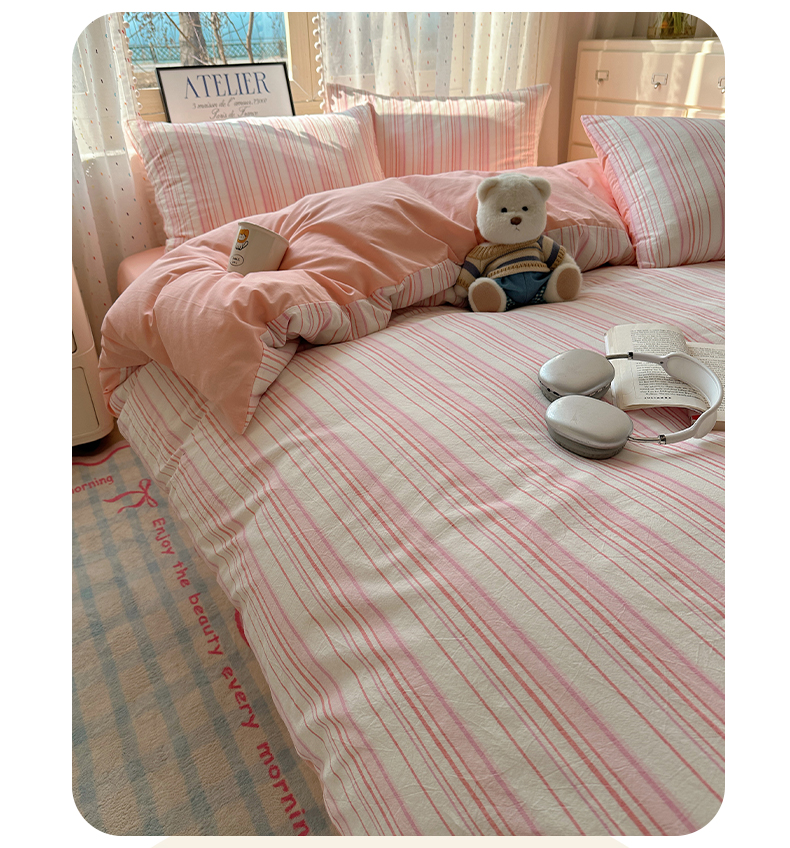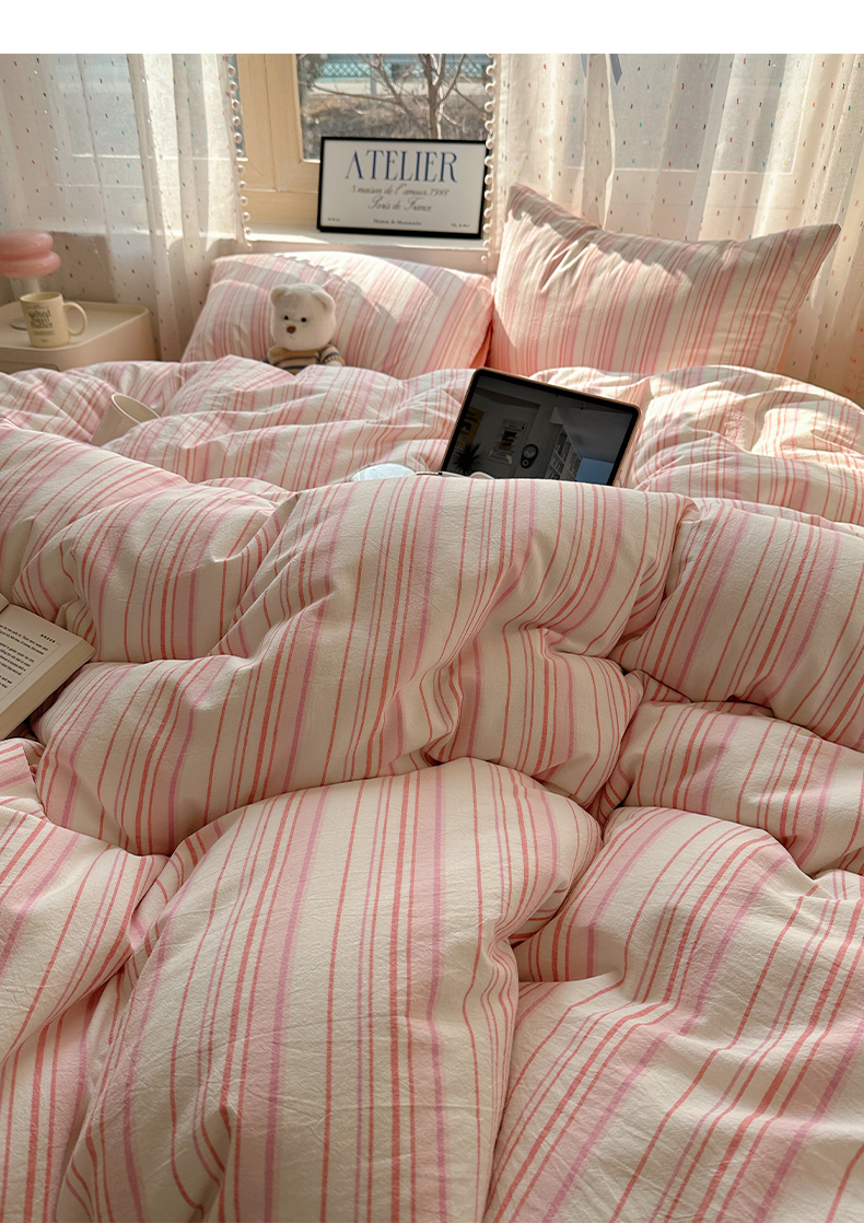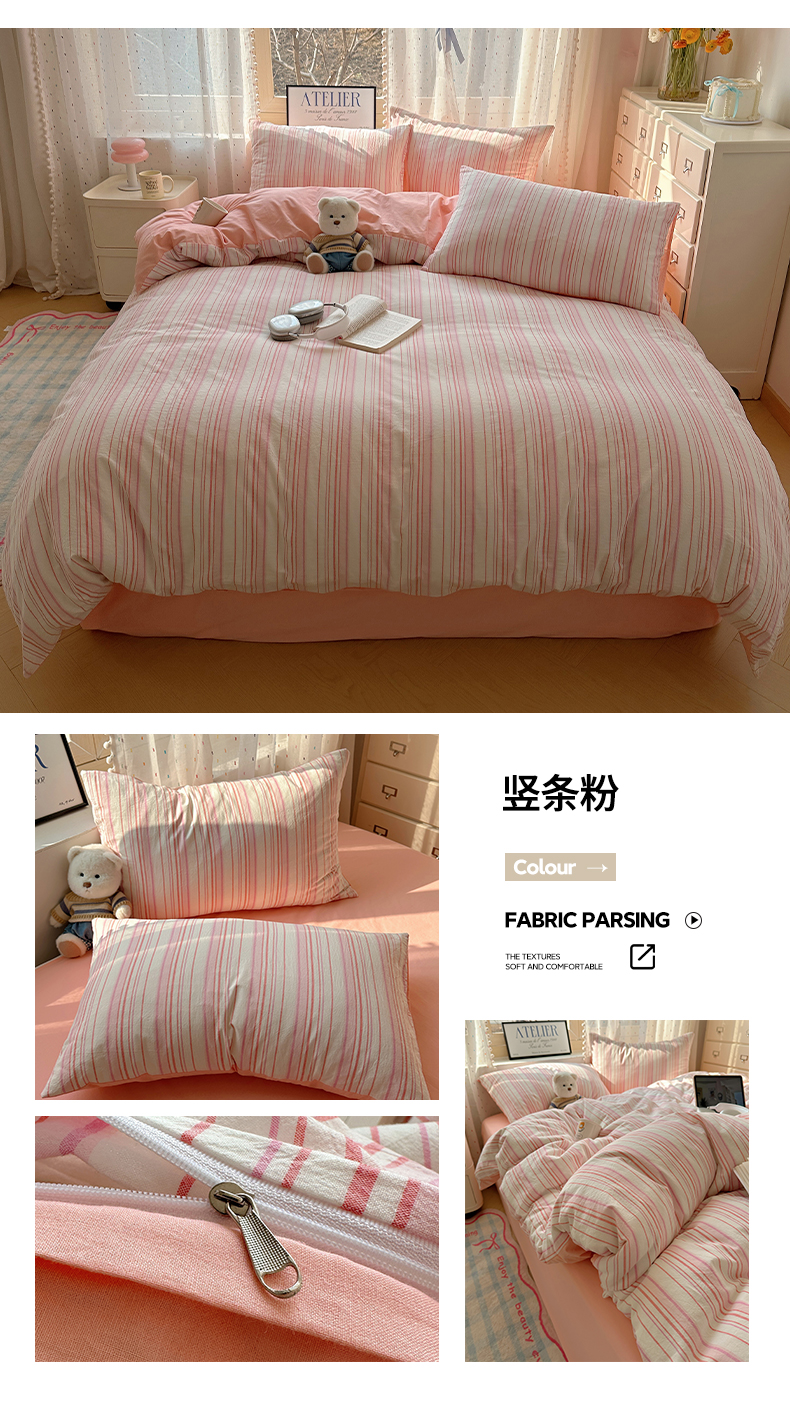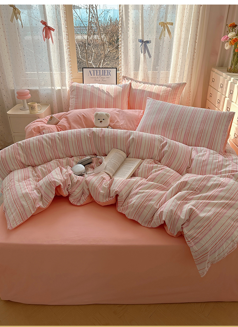 当前位置: 91家纺网 > 商品网购 > 床品套件 > 四件套 > 全棉普通四件套 > 雅居纺家纺 2025全棉色织水洗棉四件套 竖条粉