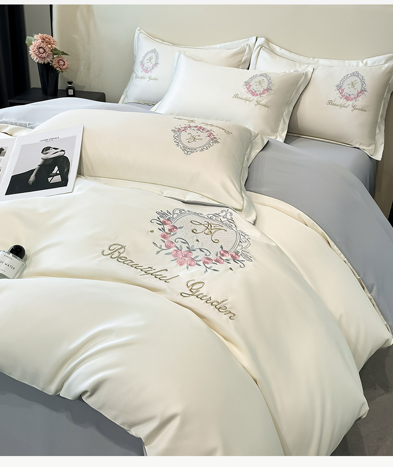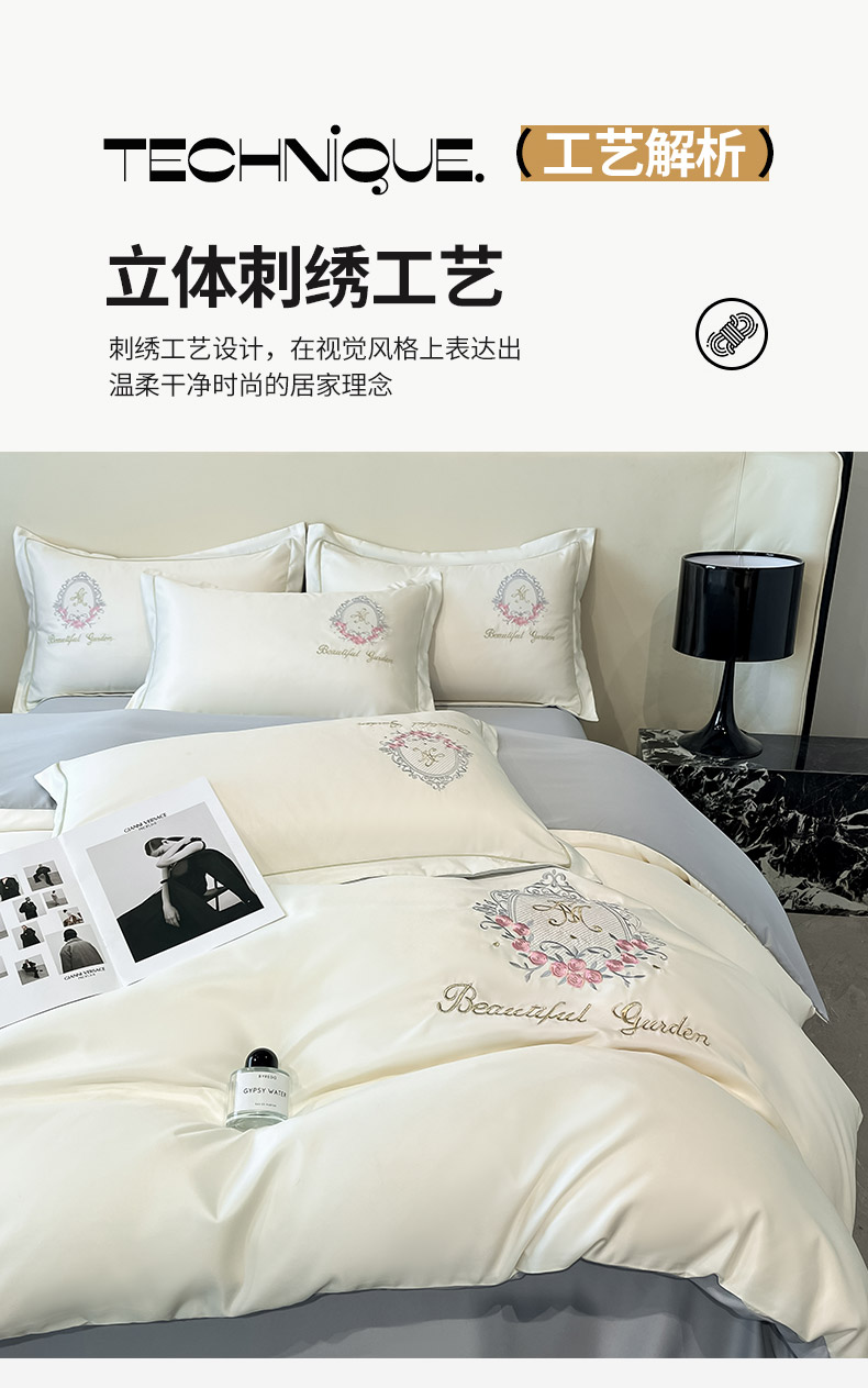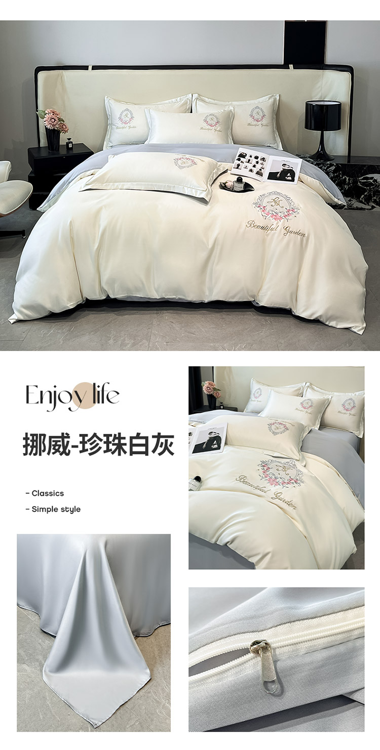 金阳光 2025新款大花轻奢刺绣款水洗天丝四件套 挪威-珍珠白灰