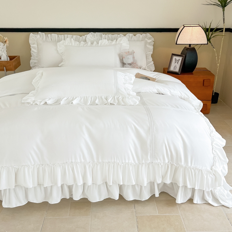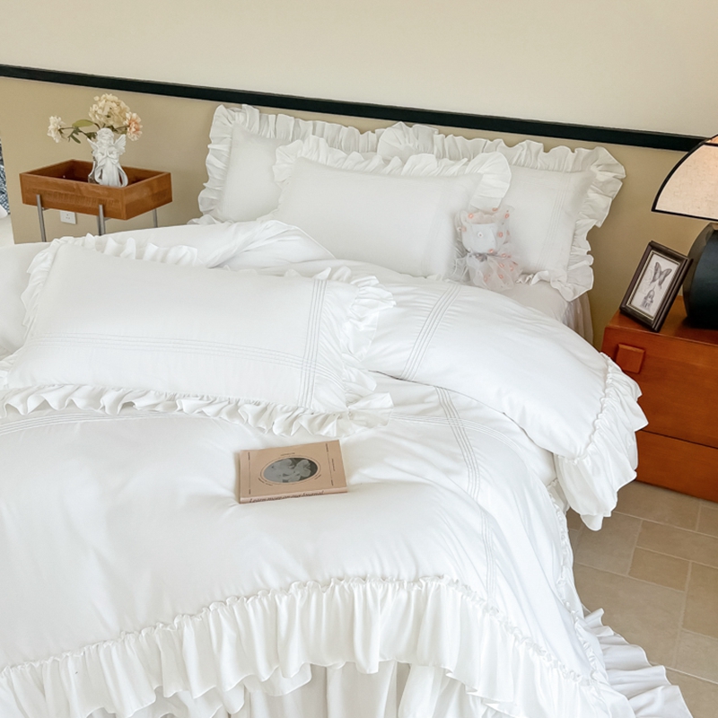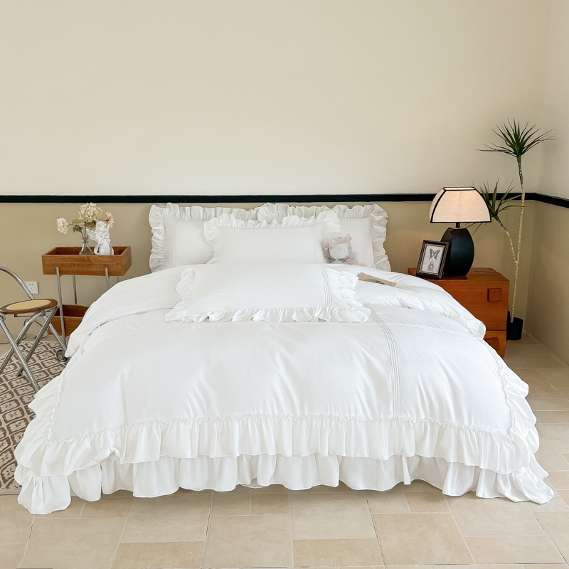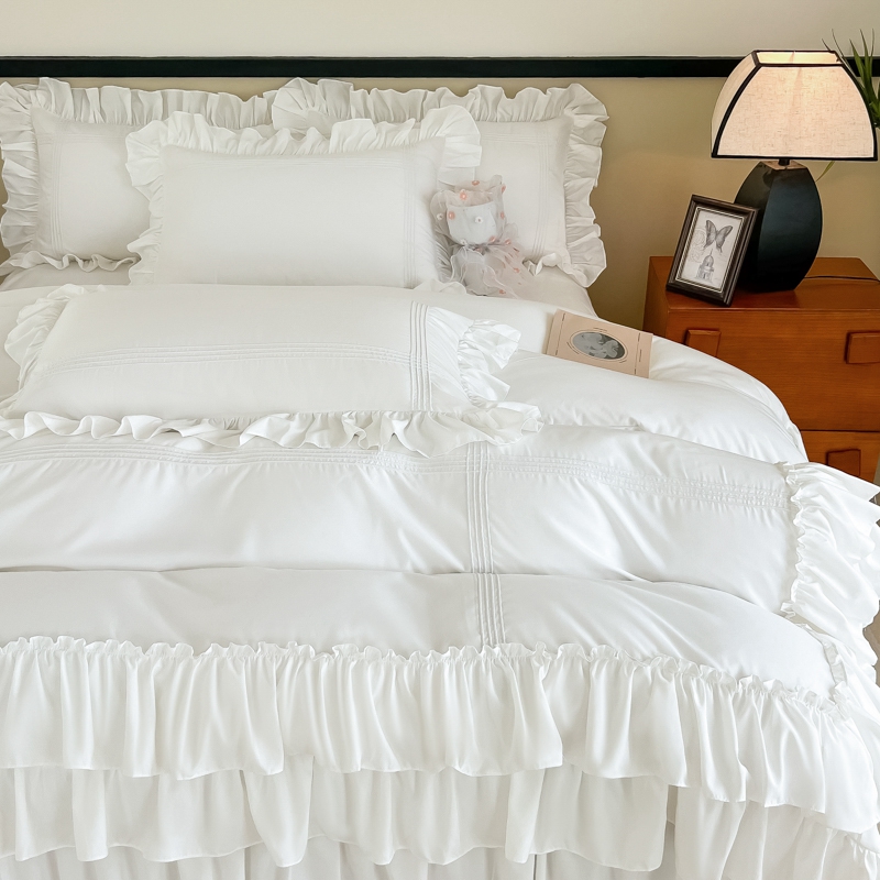 当前位置: 91家纺网 > 商品网购 > 床品套件 > 四件套 > 化纤普通四件套 > 乐卧家居2026新款法式浪漫经典直条褶边双层荷叶边四件套飘逸系列 飘逸-白