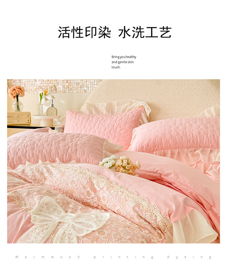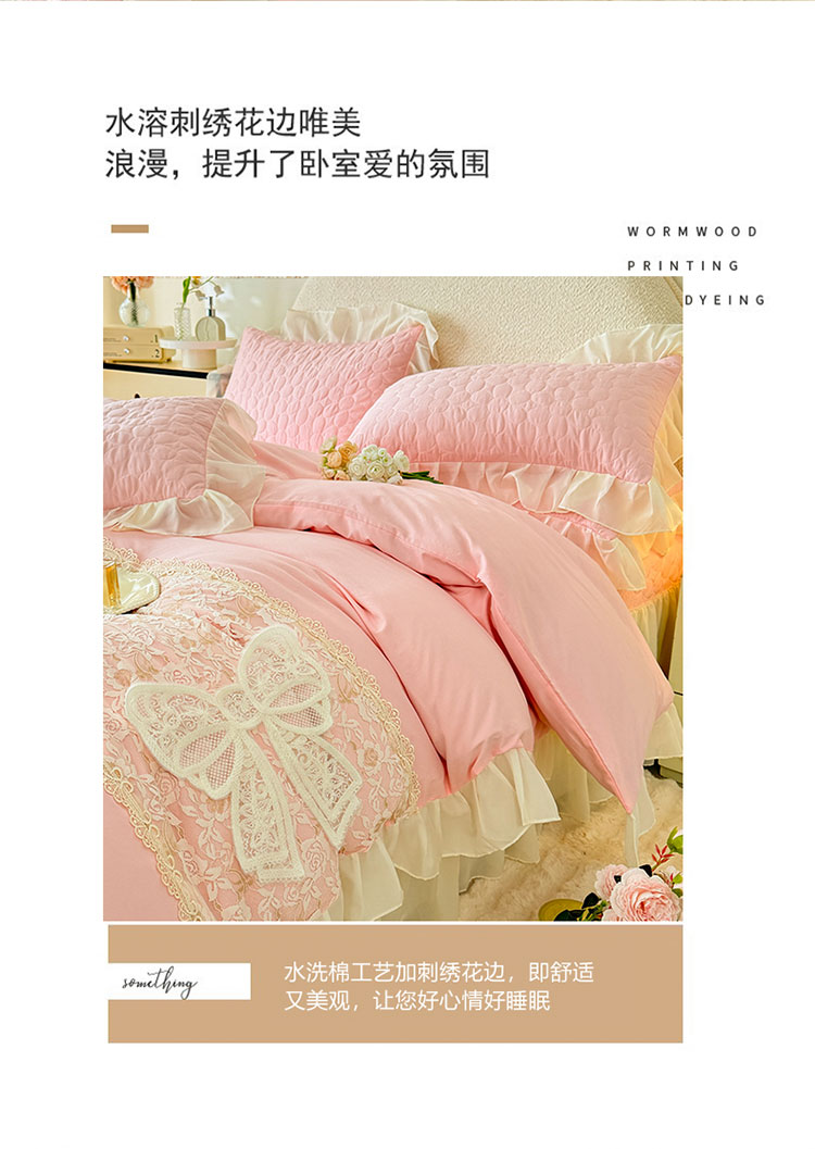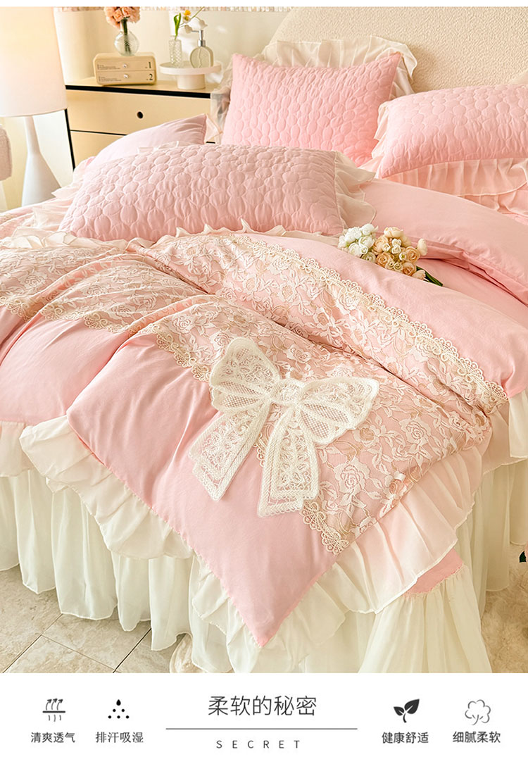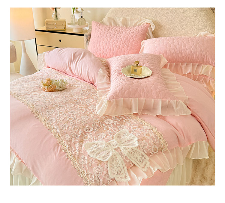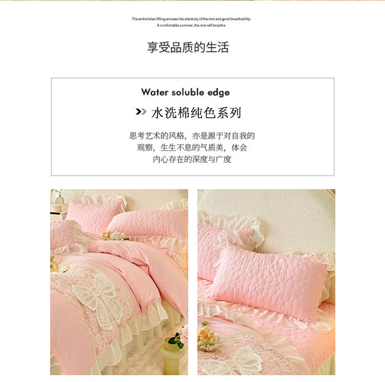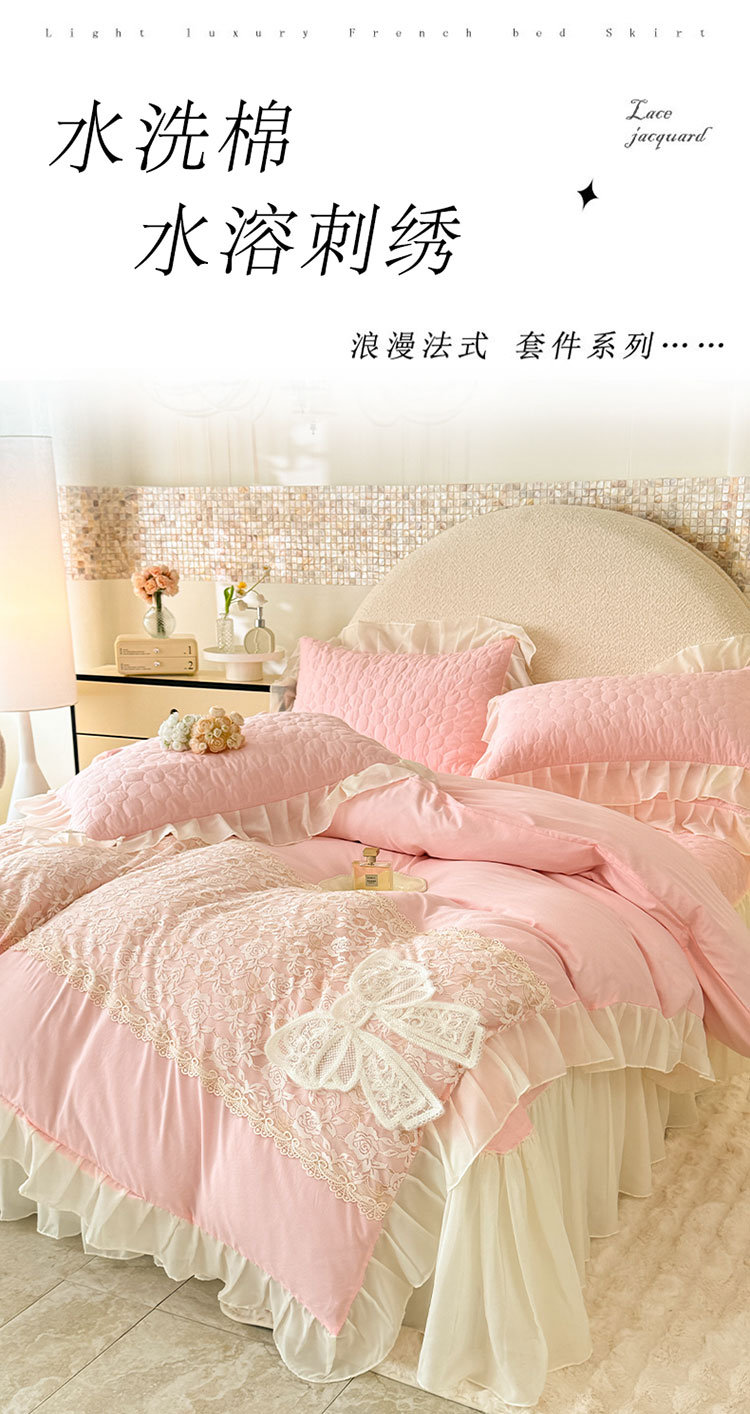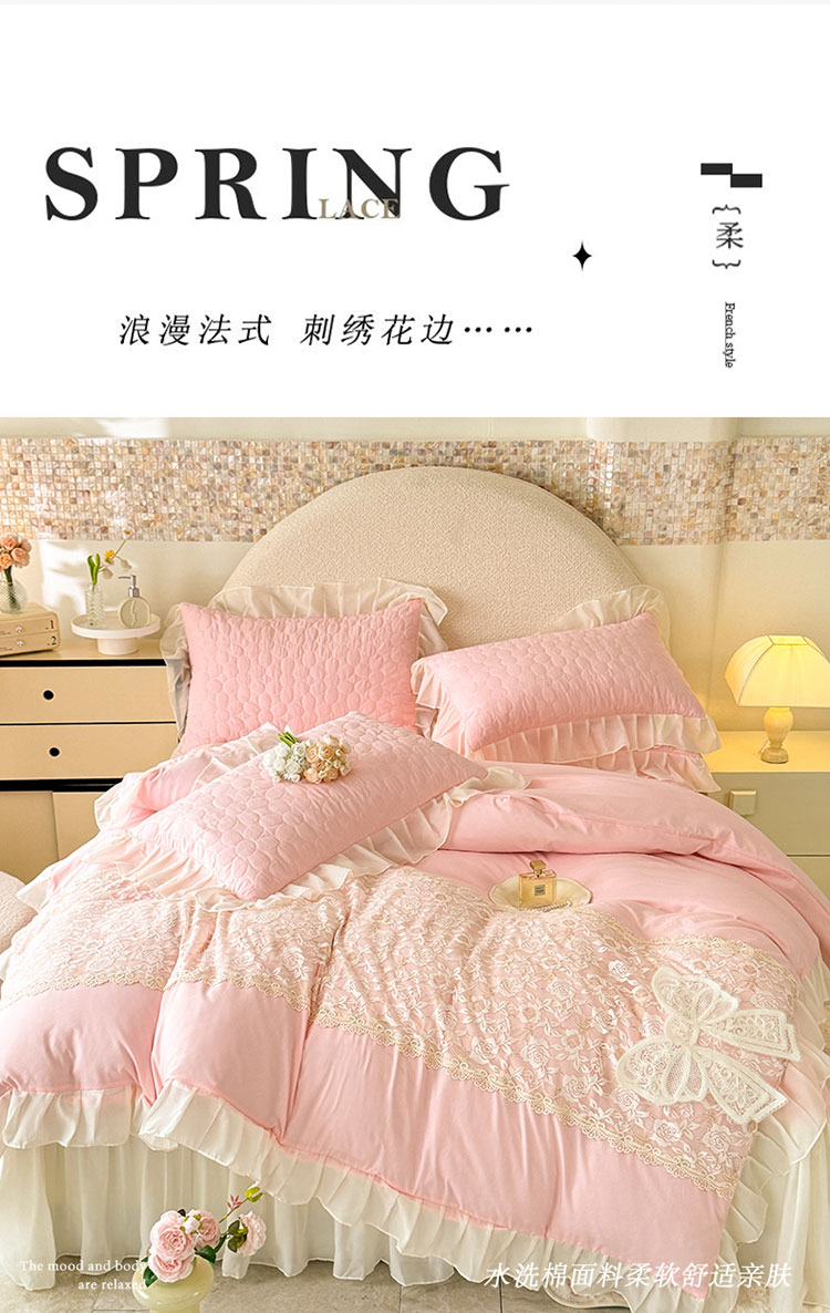 商品名称:2025韩版法式公主风水洗棉立体花绣花床盖款四件套蕾丝床盖款夏被四件套 法派甜心—樱花粉