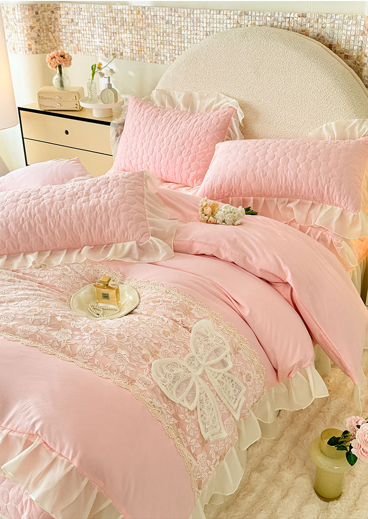 2025韩版法式公主风水洗棉立体花绣花床盖款四件套蕾丝床盖款夏被四件套 法派甜心—樱花粉