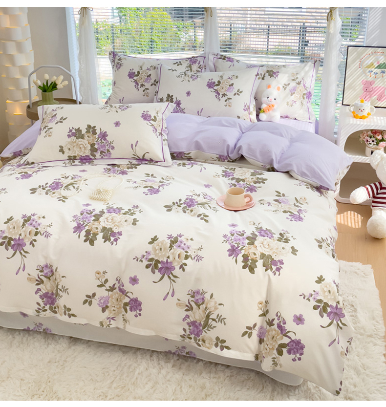 铭博家纺 新款直播爆款网红全棉四件套13070印花吊边一字绣纯棉被套工艺款 淡雅花资