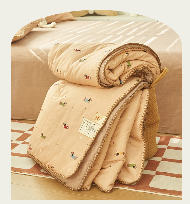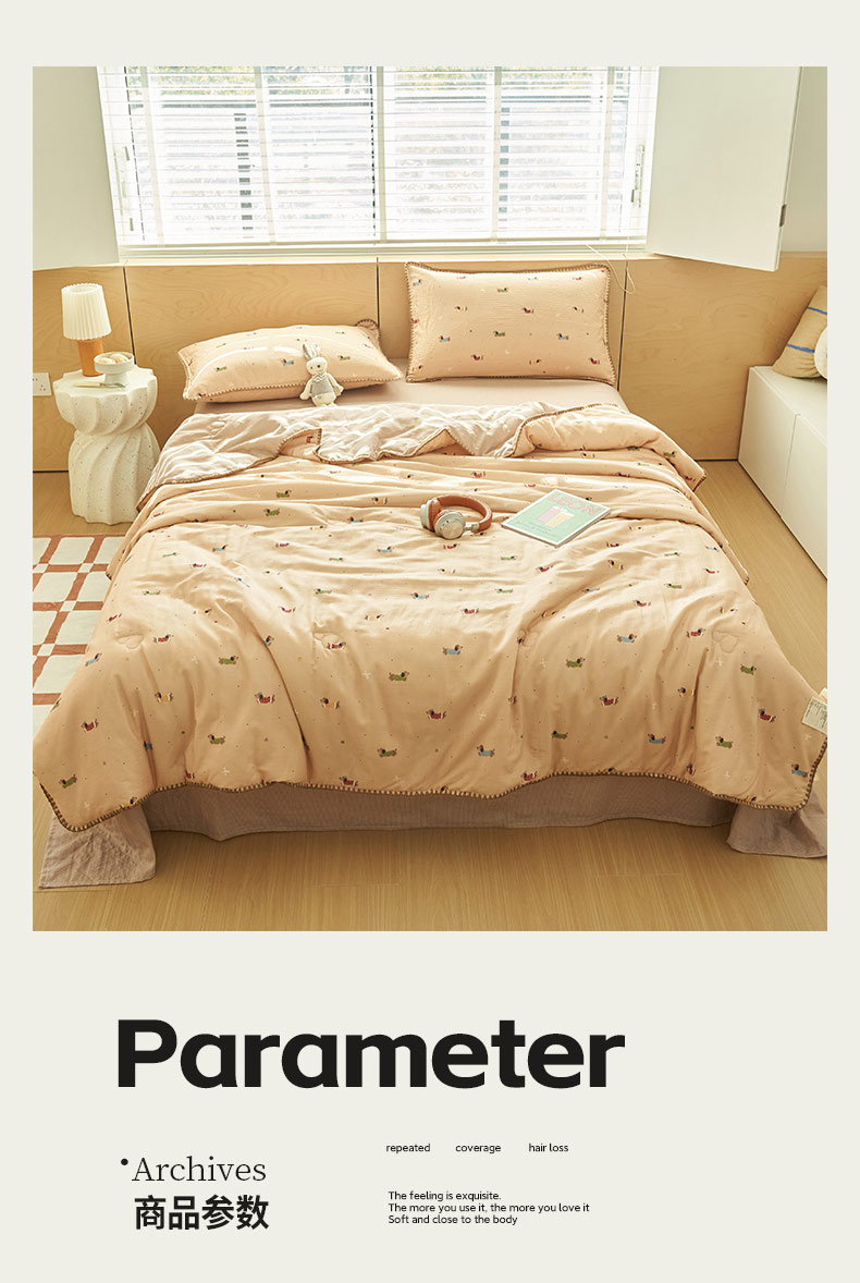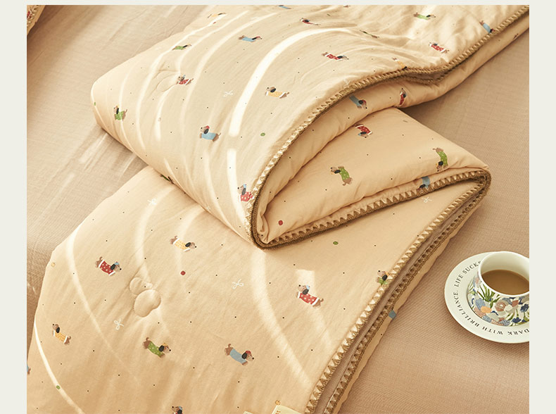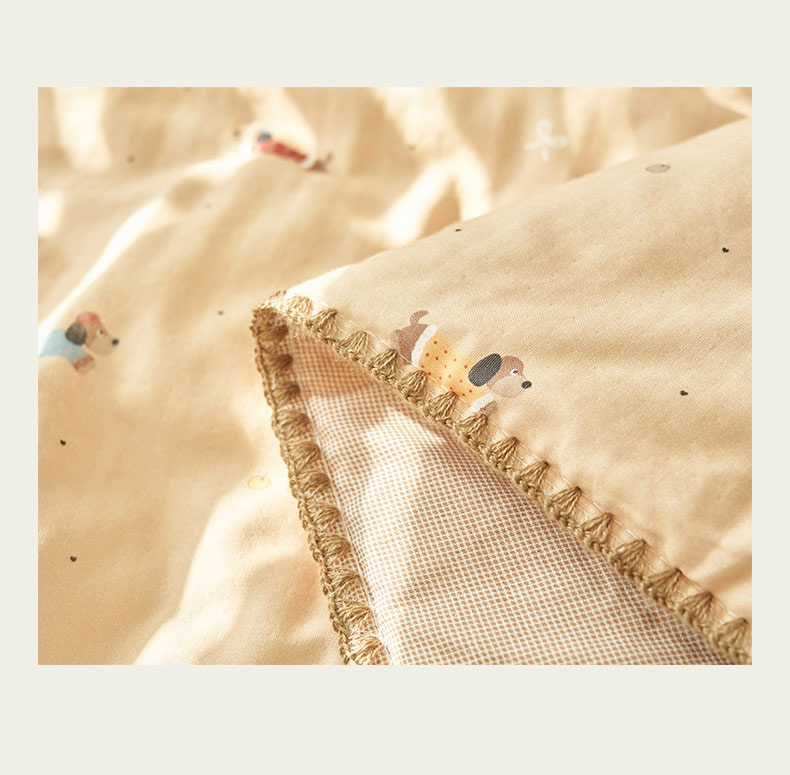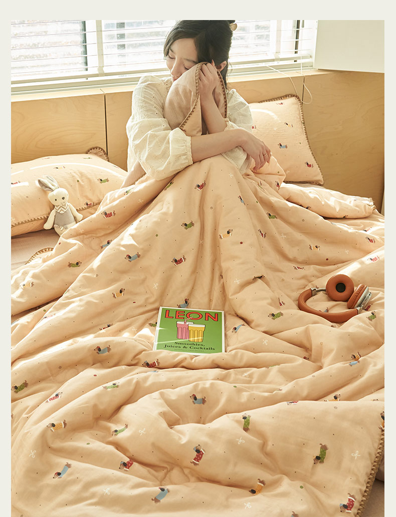 • 91家纺网 家纺一手货源 找家纺 寐绸家纺 2025新款纯棉双层纱印花大豆纤维夏被四件套 双层纱-腊肠狗