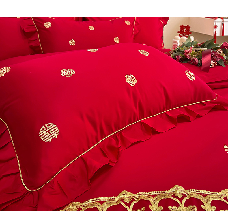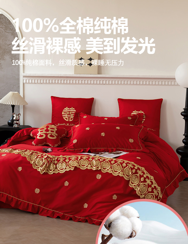 商品名称:甜咪咪婚庆 2025新款纯棉全棉面料刺绣结婚 婚庆 四件套 多件套 小红书推荐热款 一路有喜全棉