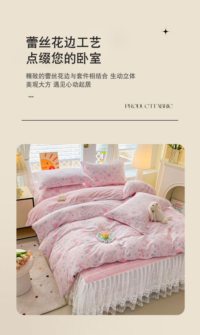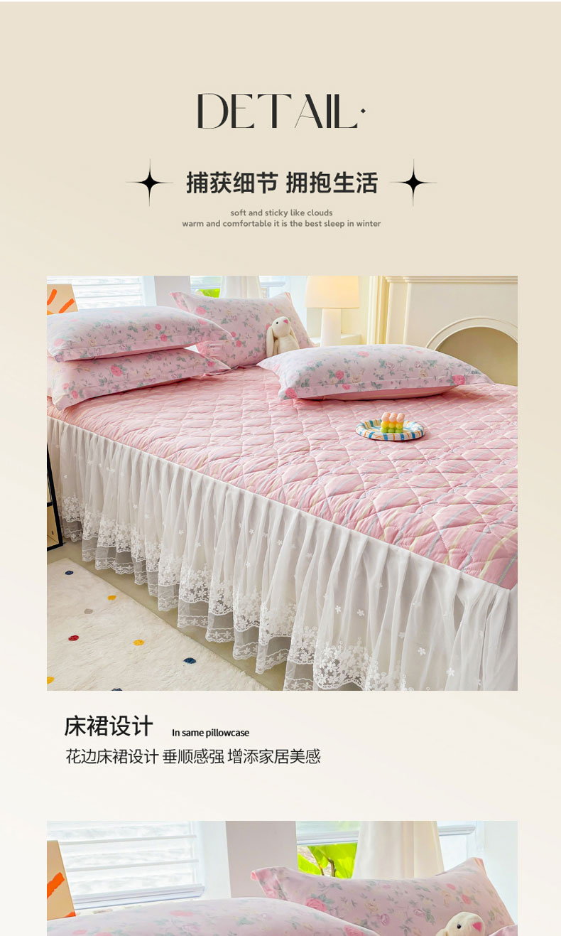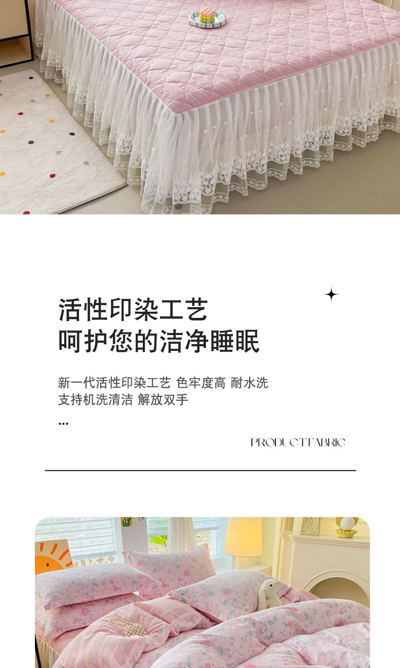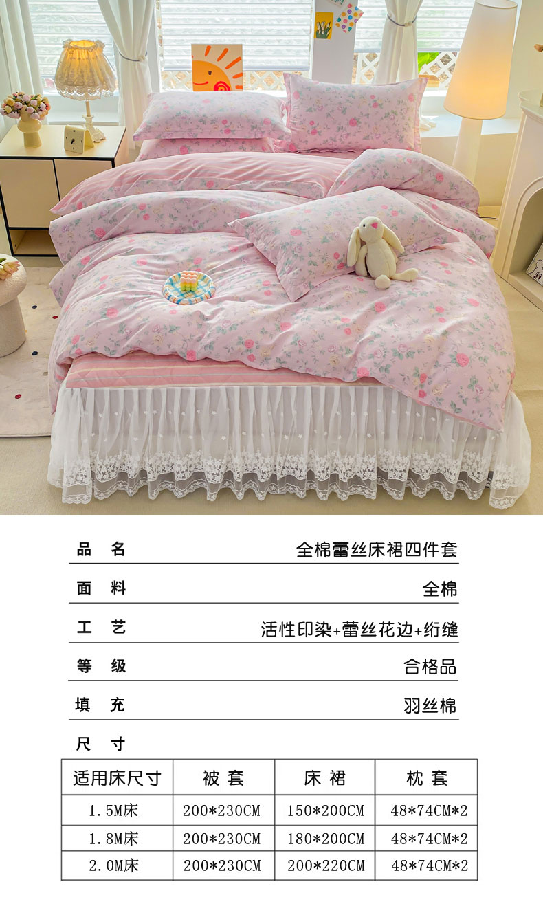 商品名称:提花大世界 2025直播爆款全棉活性印花夹棉床盖床裙花边四件套 美琳庄园-粉