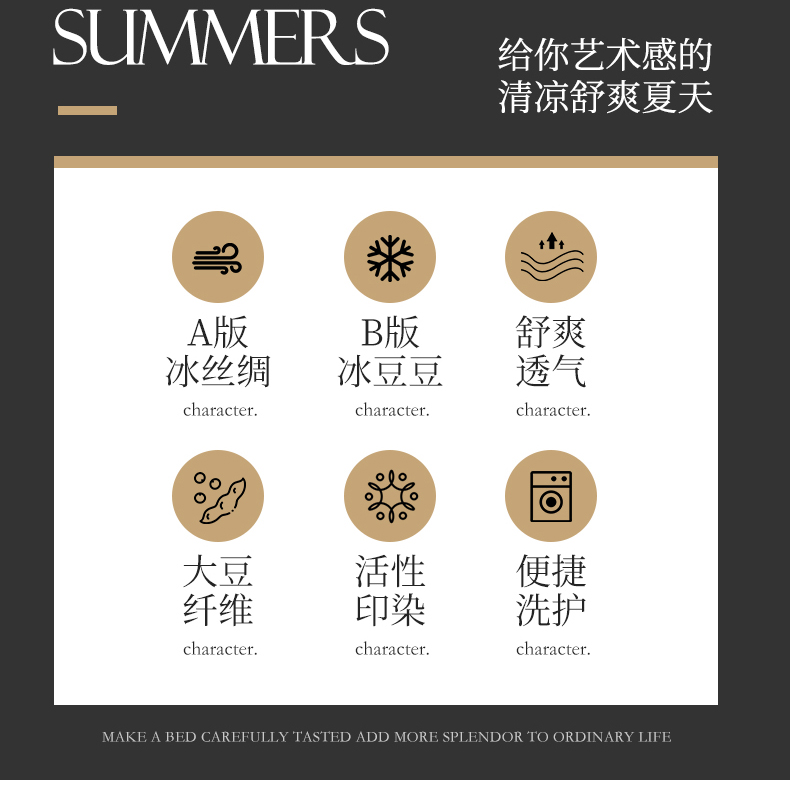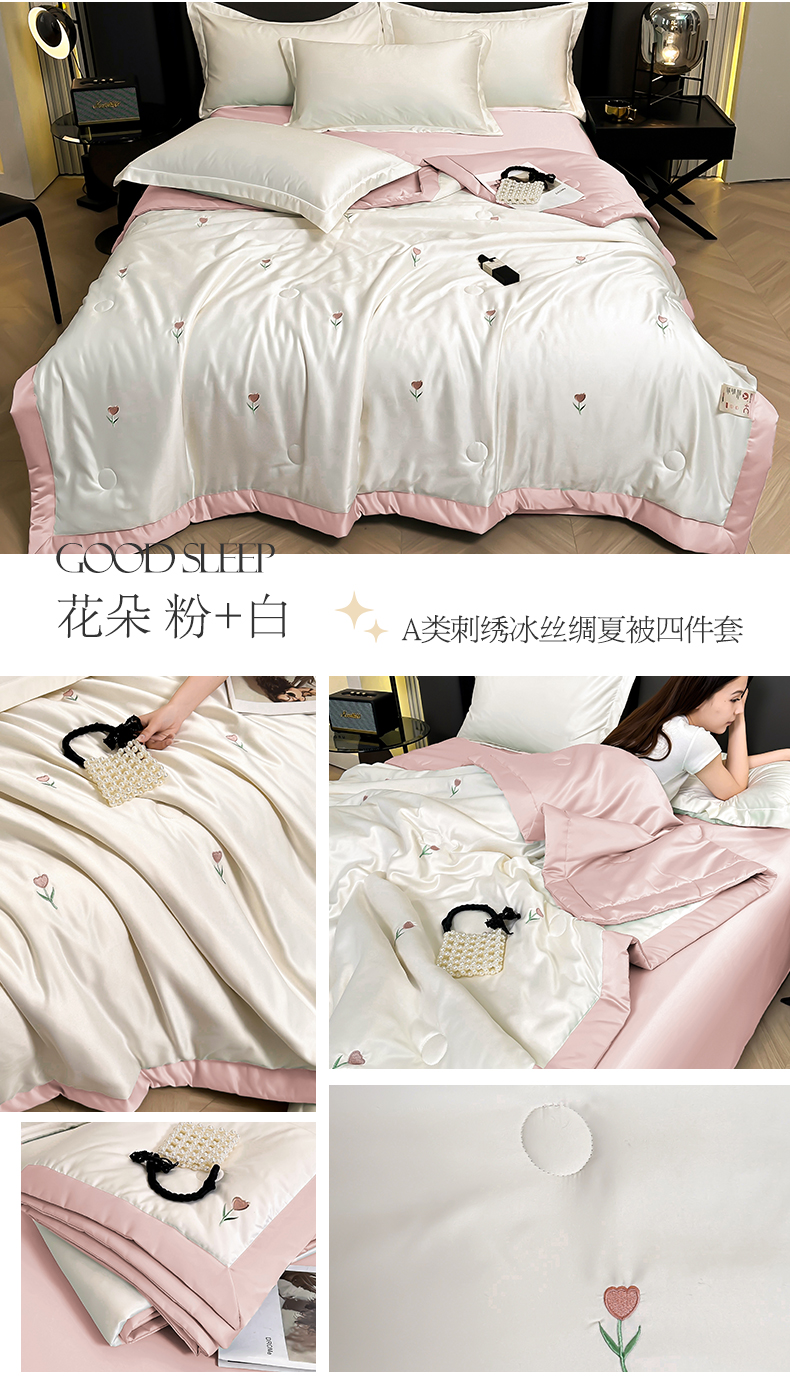 当前位置: 91家纺网 > 商品网购 > 床品套件 > 四件套 > 夏被四件套 > 满羽家纺 2025热款冰丝绸冰豆豆被夏被四件套凉感空调被(踩棉工艺)(吊边床单)-印花 馨语浅黄