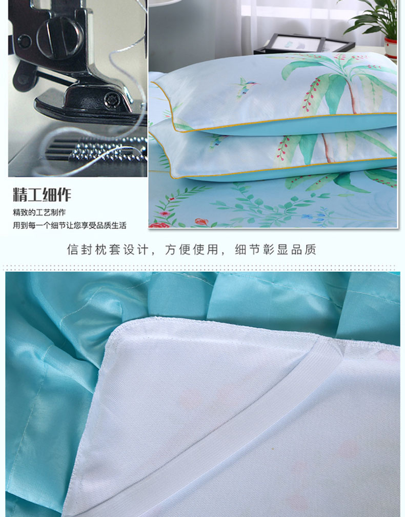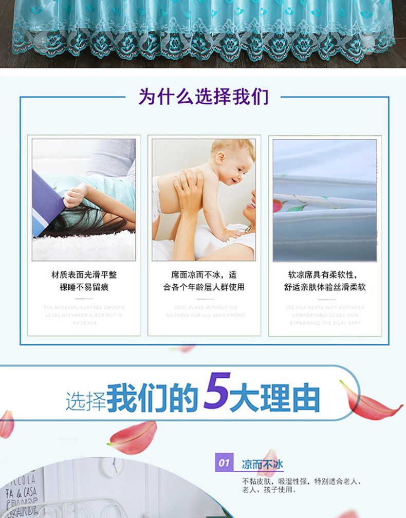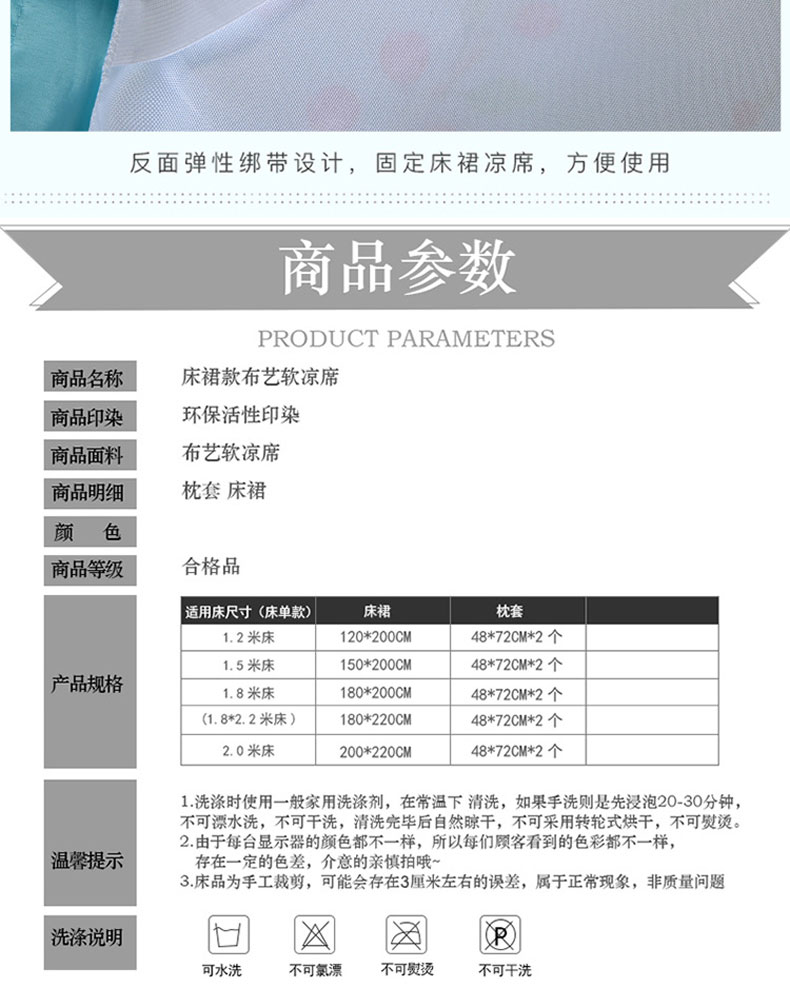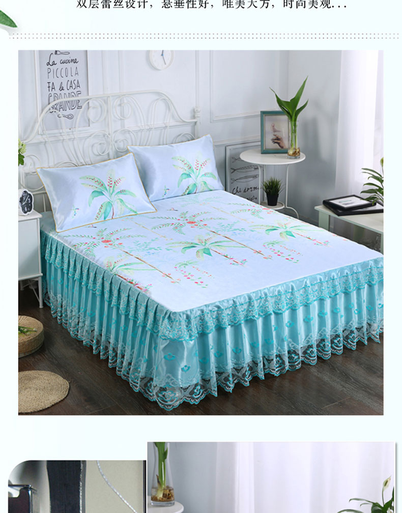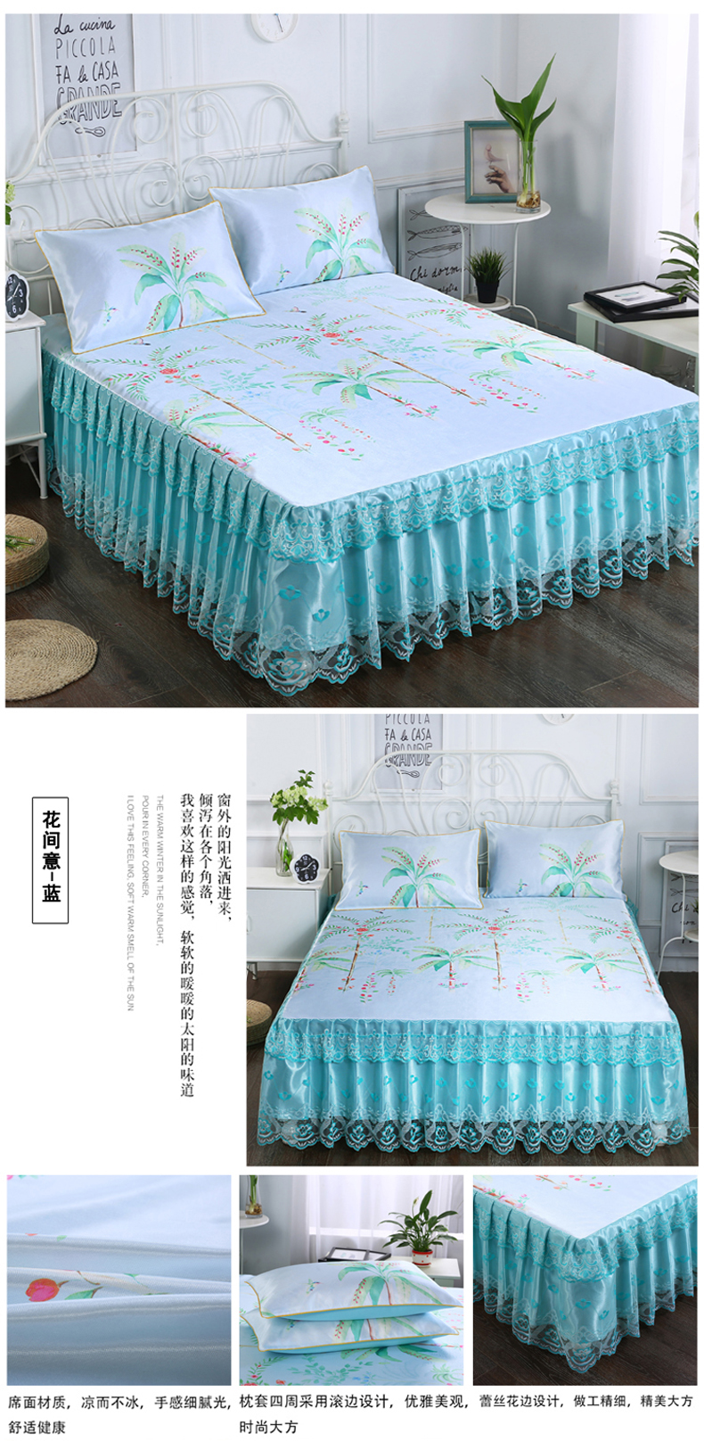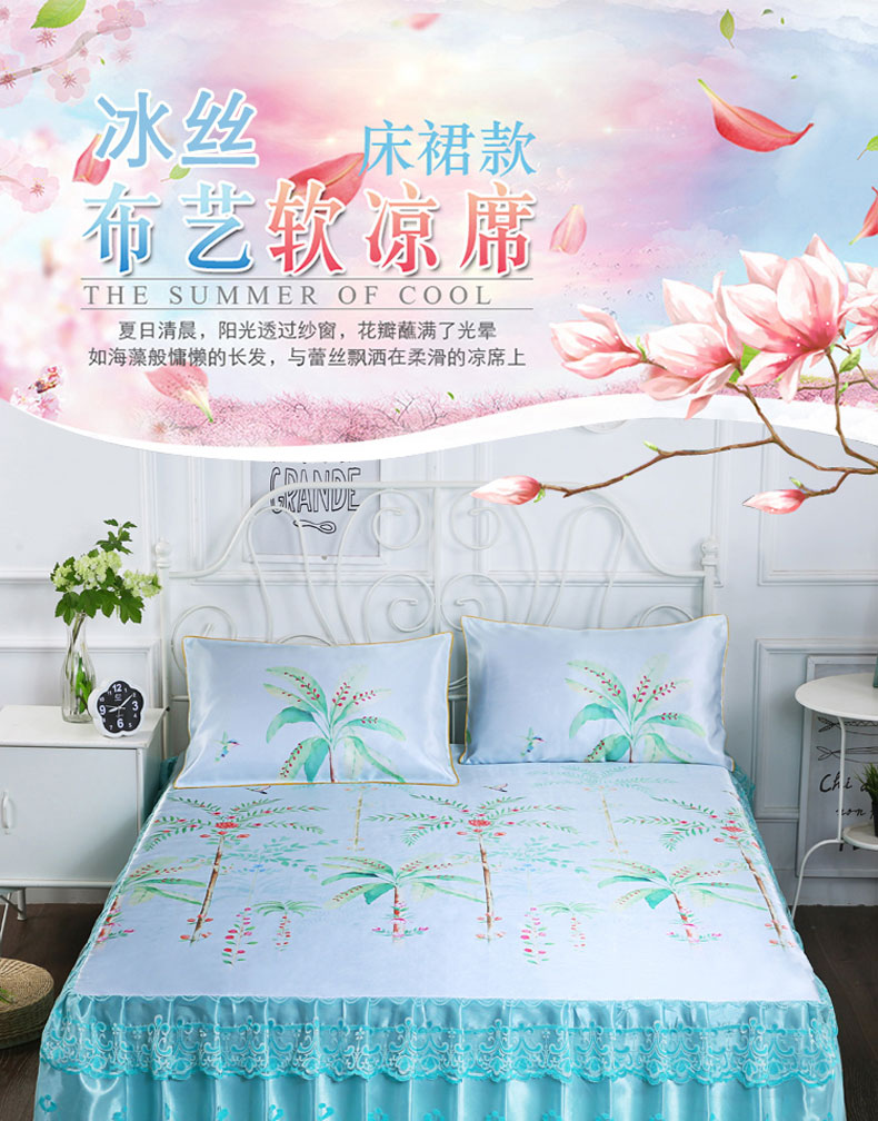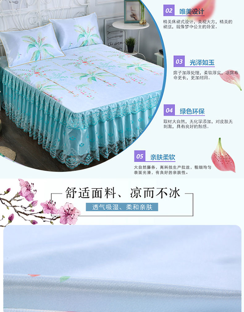 商品名称:情恒家纺2025新款床裙款冰丝布艺软凉席三件套 花间意-蓝