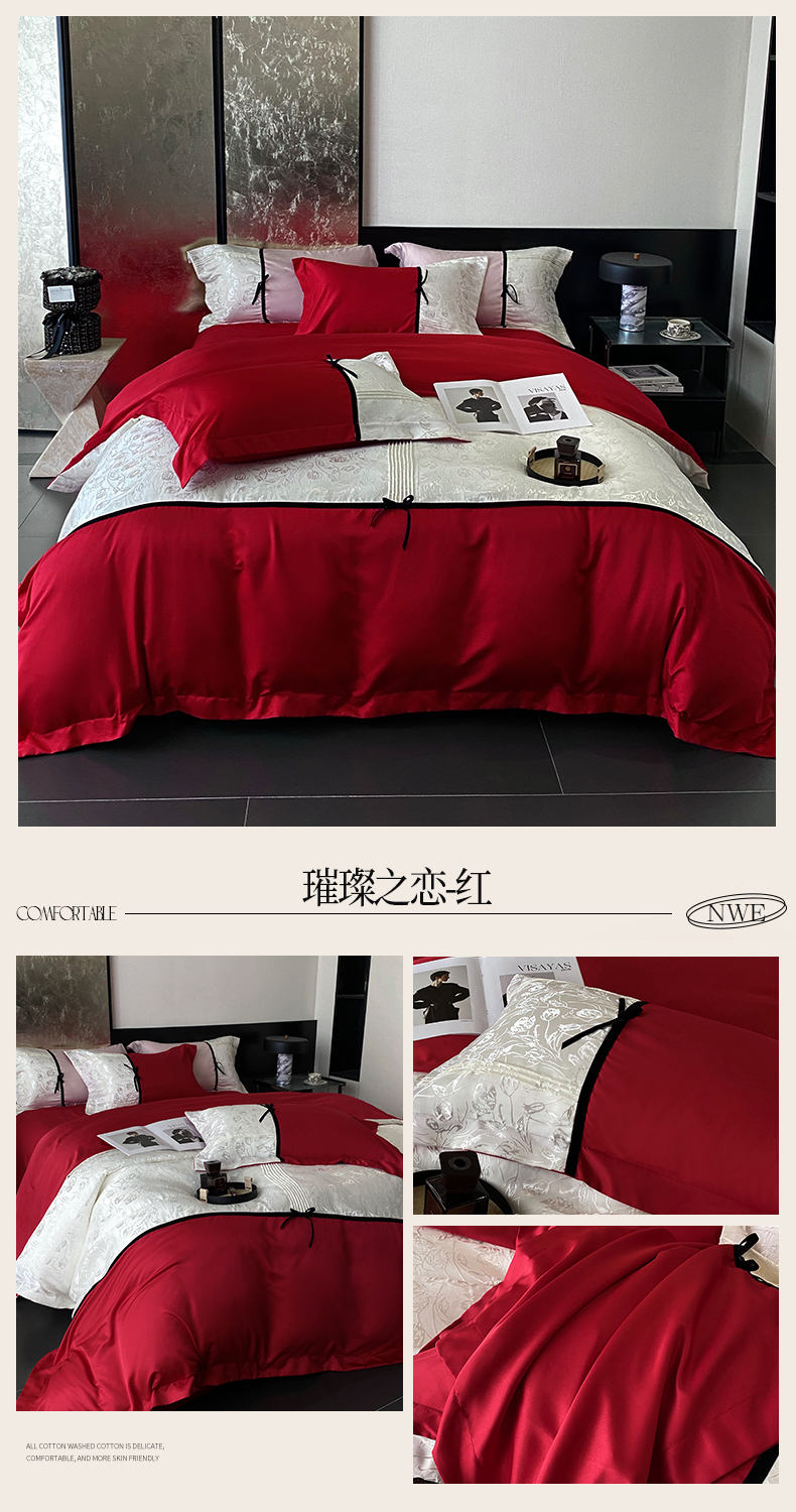 优悦生活馆 2025年新款工艺款冰丝浮雕拼接四件套 璀璨之恋-红
