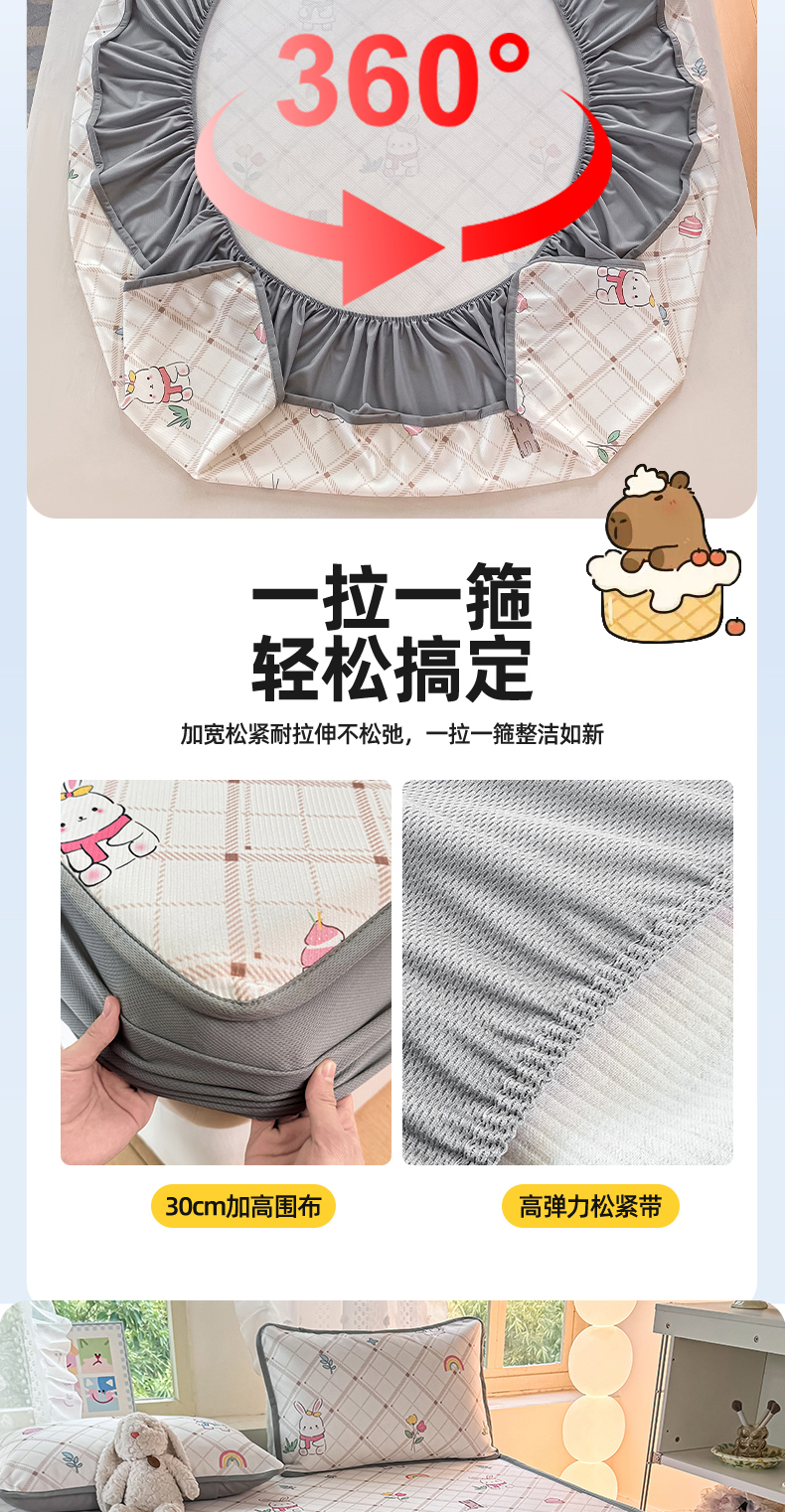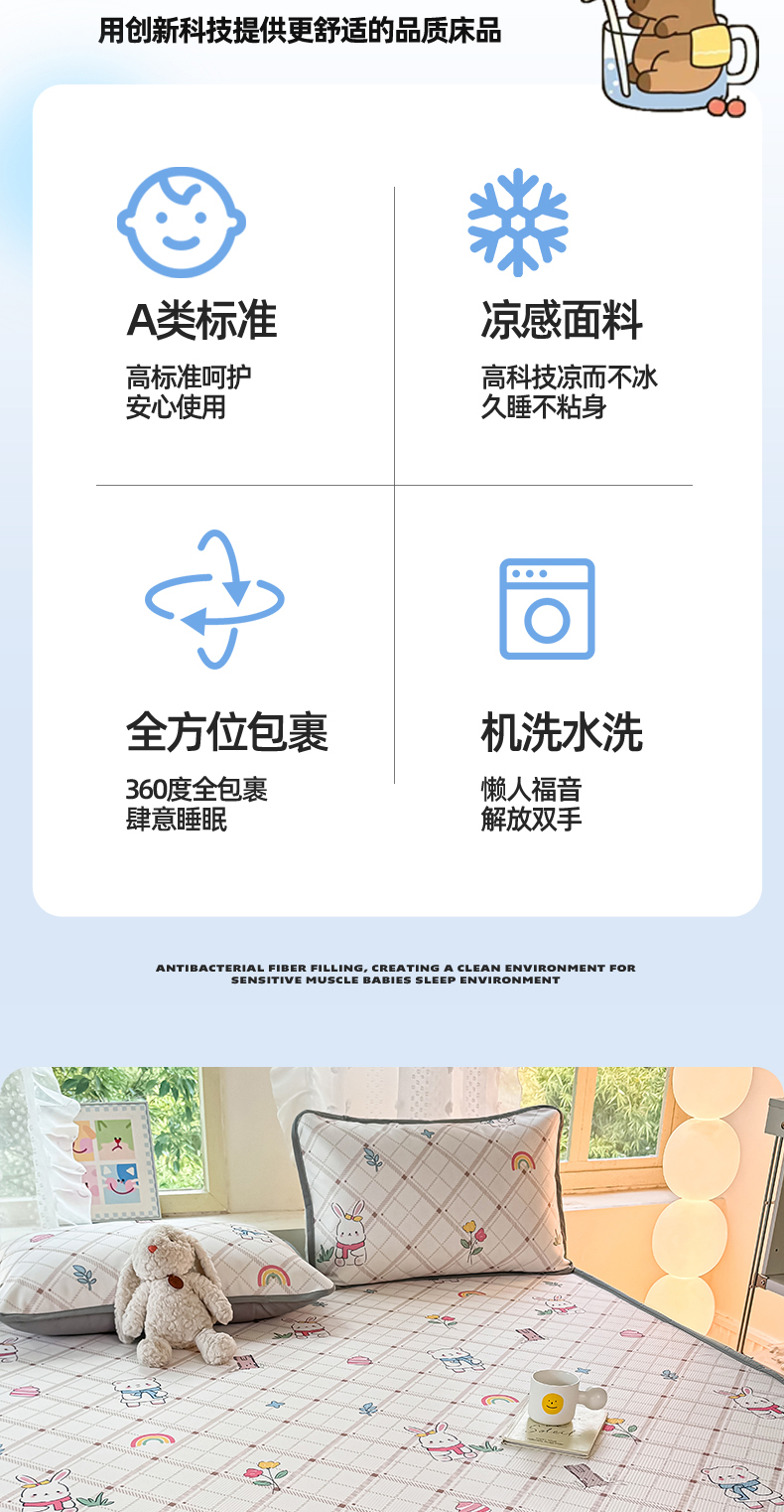 • 91家纺网 家纺一手货源 找家纺 慕梵家居 2025新款冰豆豆斜纹数码印花床笠款凉席席子三件套 彩虹小兔