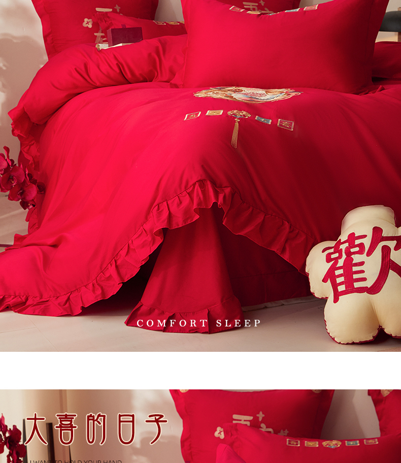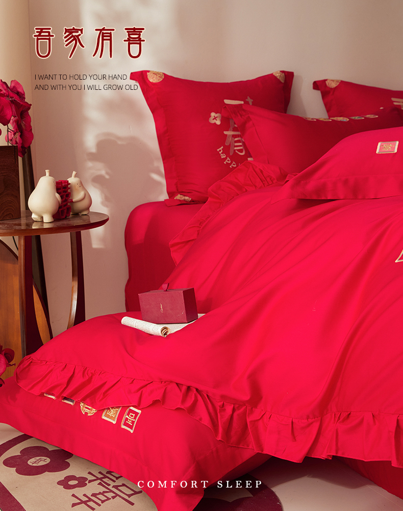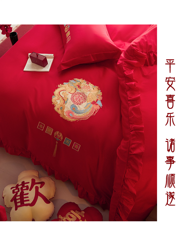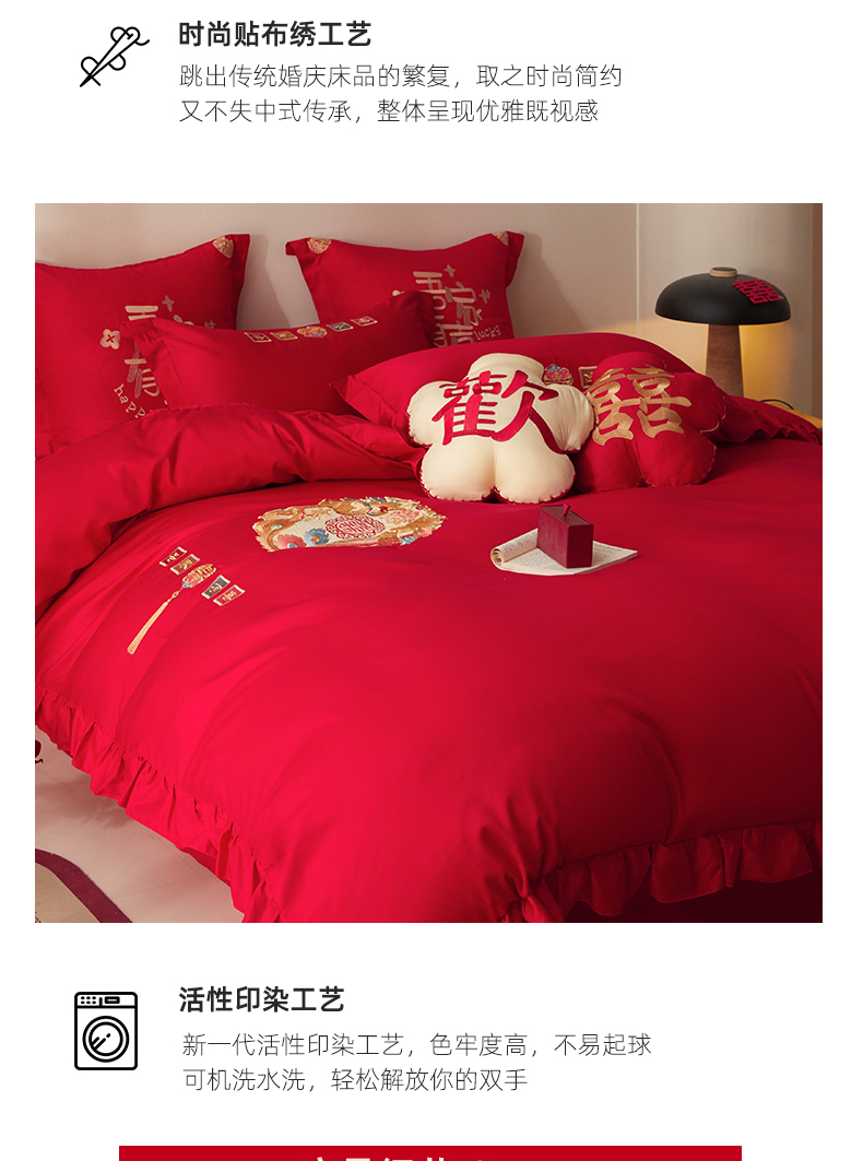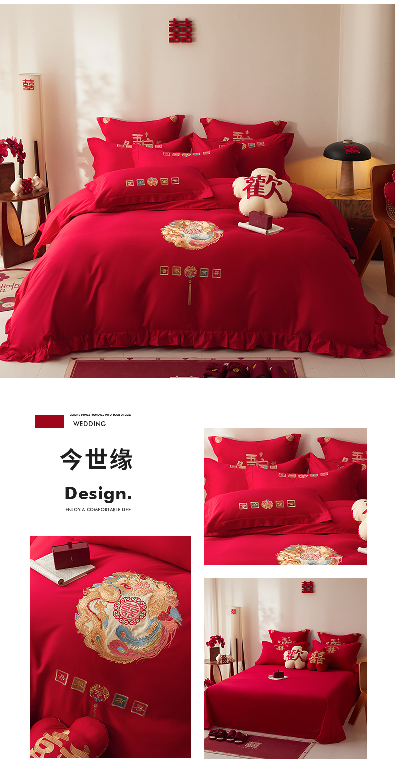 当前位置: 91家纺网 > 商品网购 > 床品套件 > 四件套 > 长绒棉四件套 > 玉雅家纺 2025新款长绒棉花边款刺绣时尚婚庆四件套 花边款-今世缘