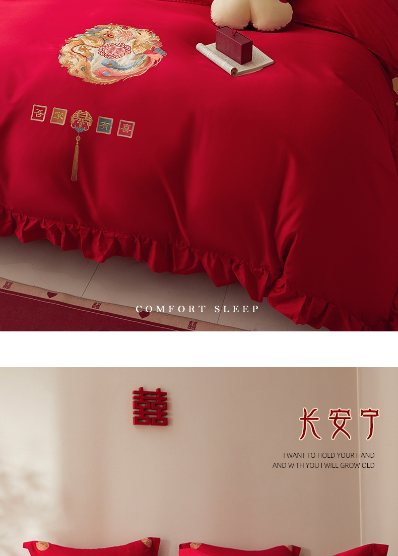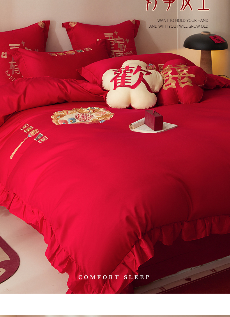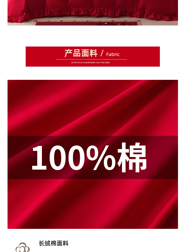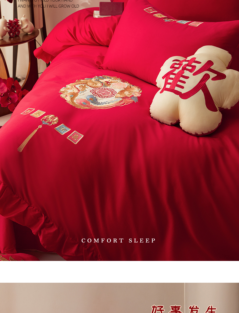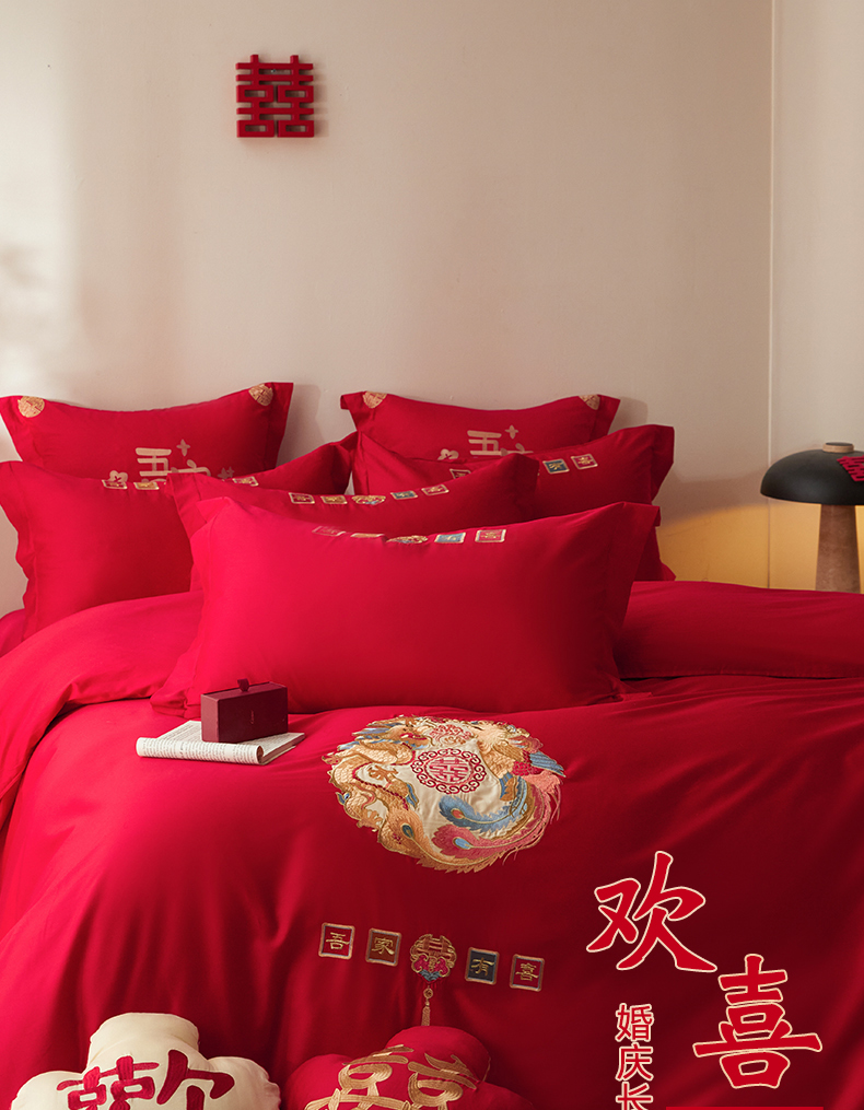 当前位置: 91家纺网 > 商品网购 > 床品套件 > 四件套 > 长绒棉四件套 > 玉雅家纺 2025新款长绒棉花边款刺绣时尚婚庆四件套 花边款-今世缘
