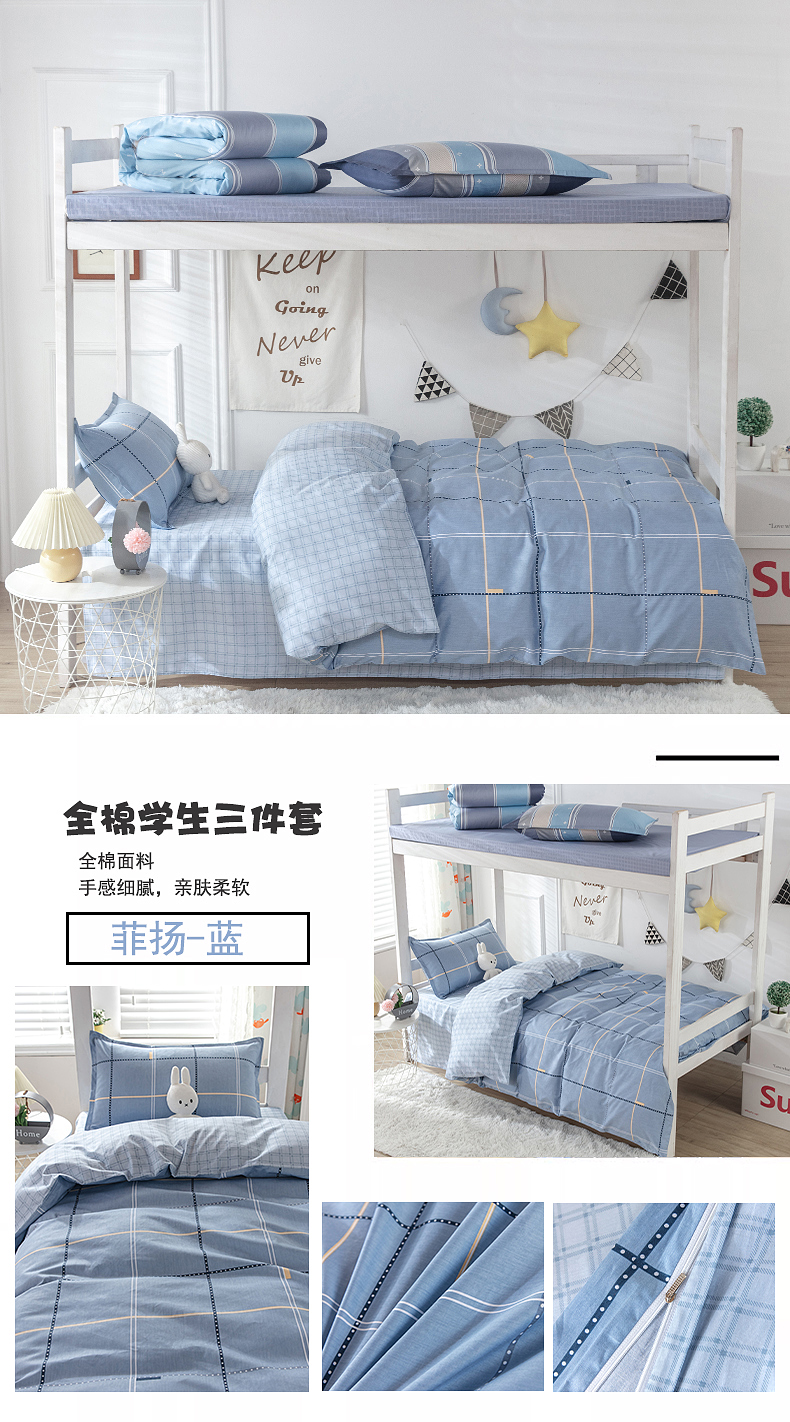 当前位置: 91家纺网 > 商品网购 > 床品套件 > 三件套 > 提供买家秀爆款花型不断货)2025新款全棉AB版13372学生宿舍印花三件套双面纯棉床单款上下铺单人 卡特-蓝