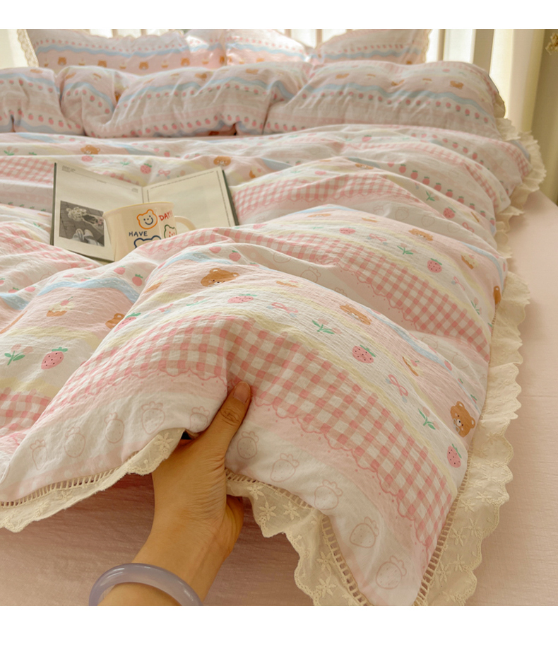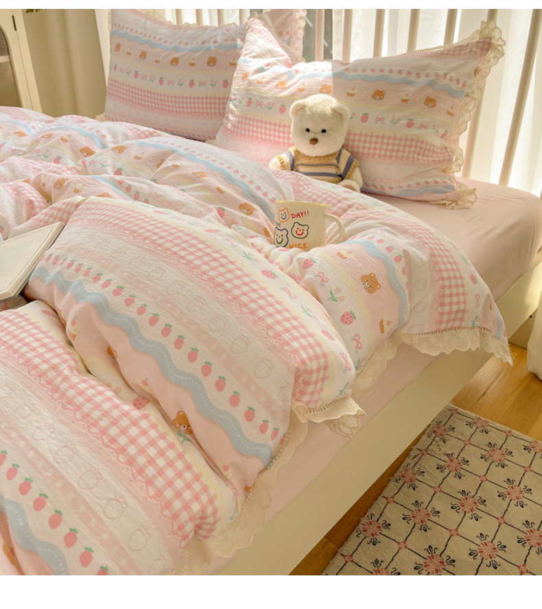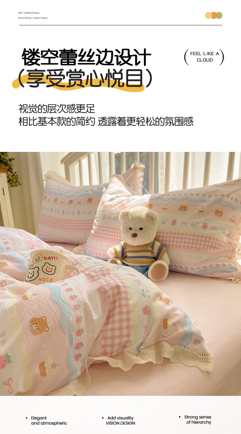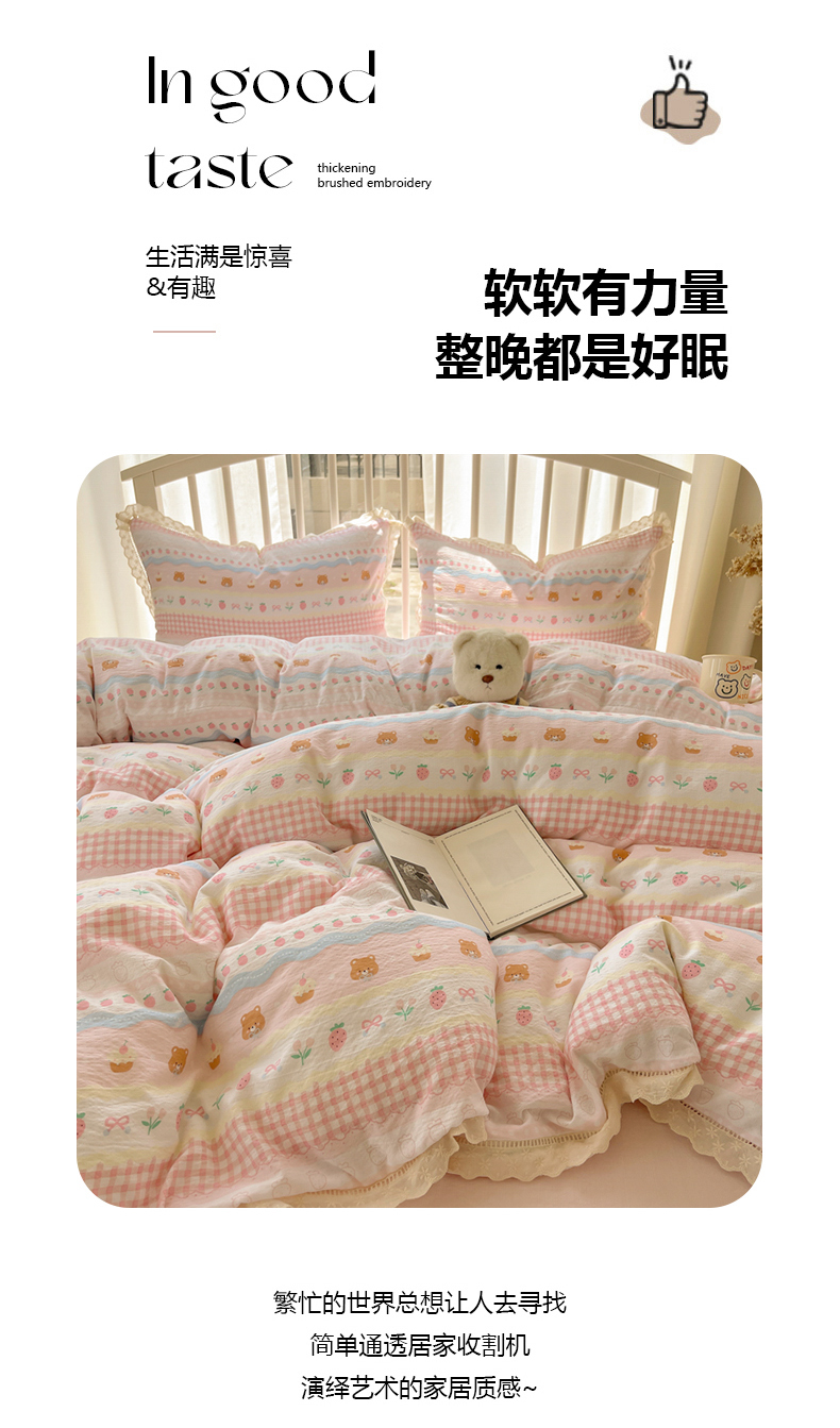 当前位置: 91家纺网 > 商品网购 > 床品套件 > 四件套 > 其它四件套 > 繁花家居 2025新款镂空白色花边直播热款四件套 软萌草莓熊