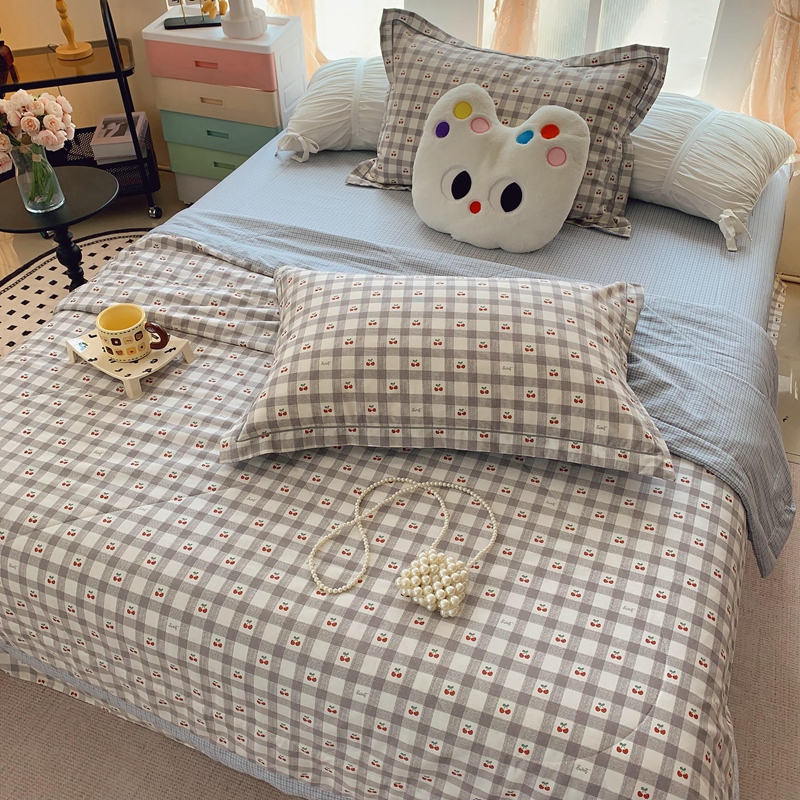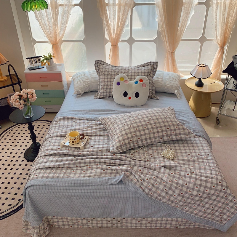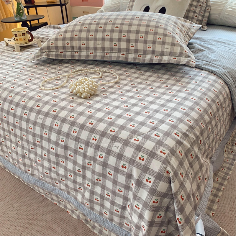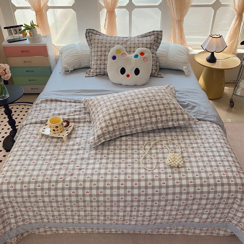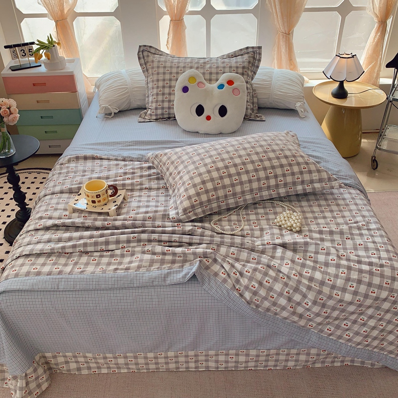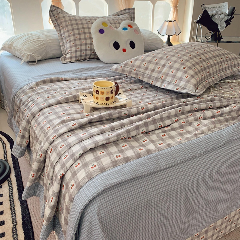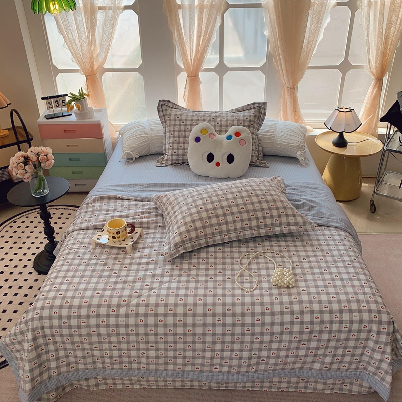 莱豫家纺 2025春夏新款纯棉全棉夏被夏凉被四件套 格子樱桃灰