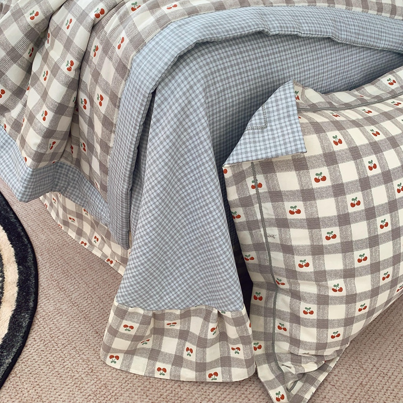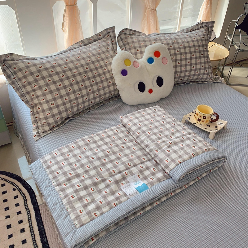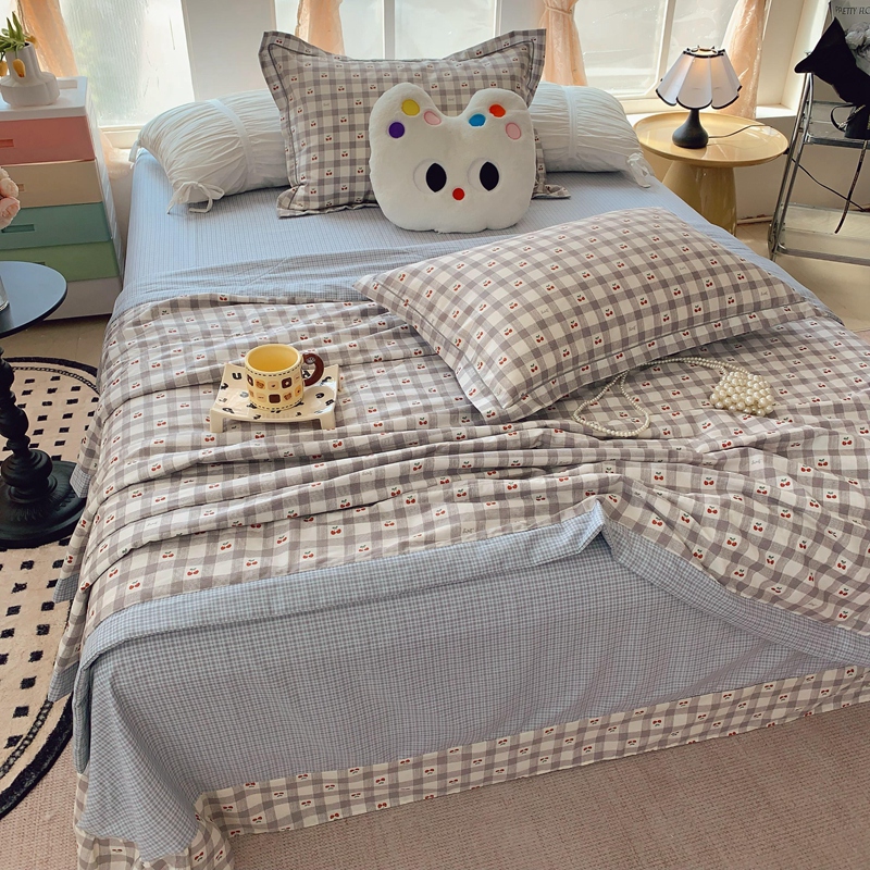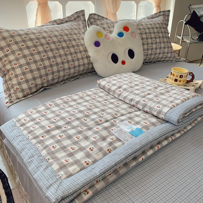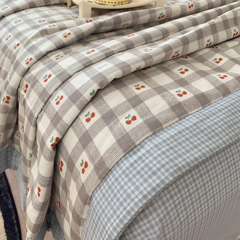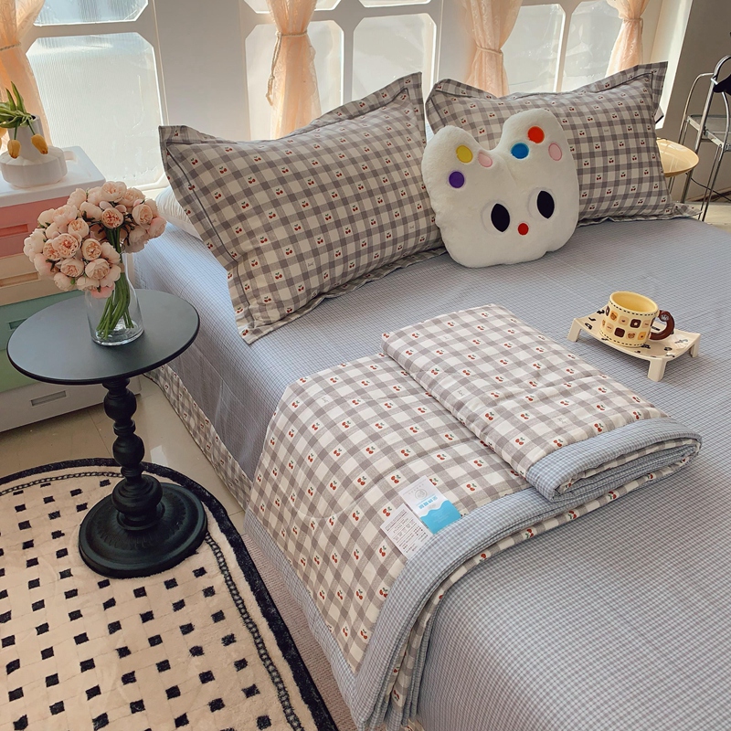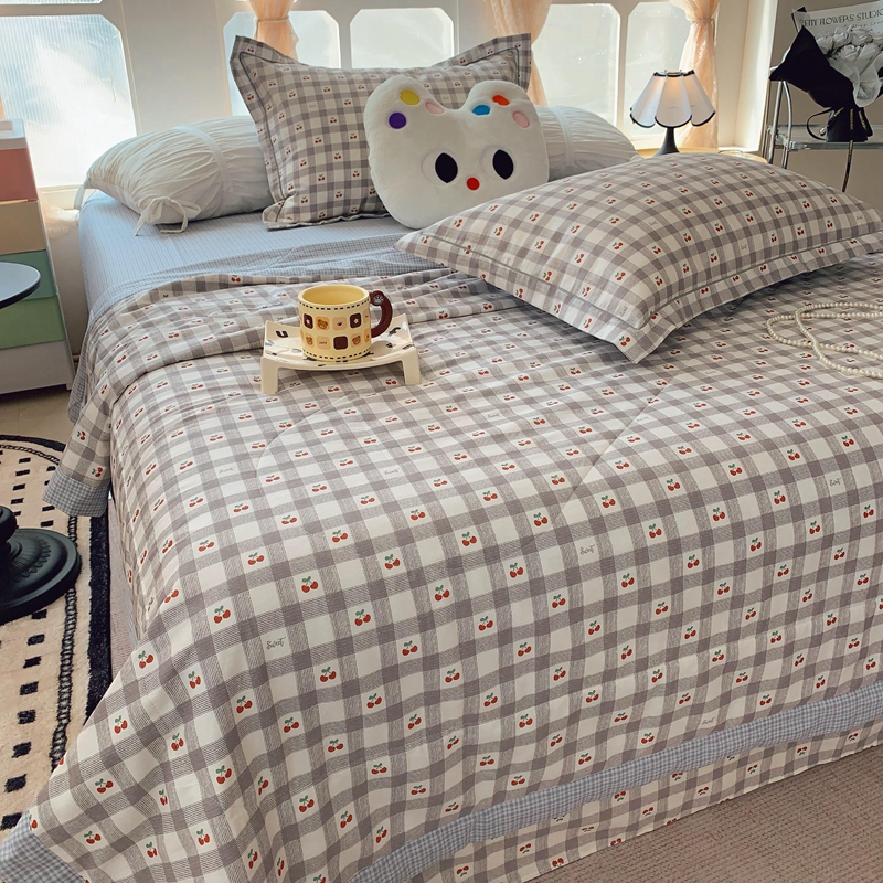 莱豫家纺 2025春夏新款纯棉全棉夏被夏凉被四件套 格子樱桃灰