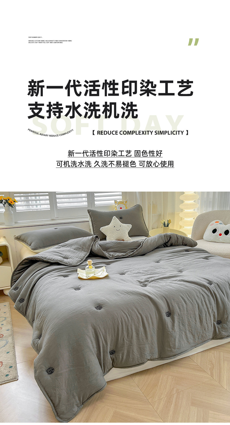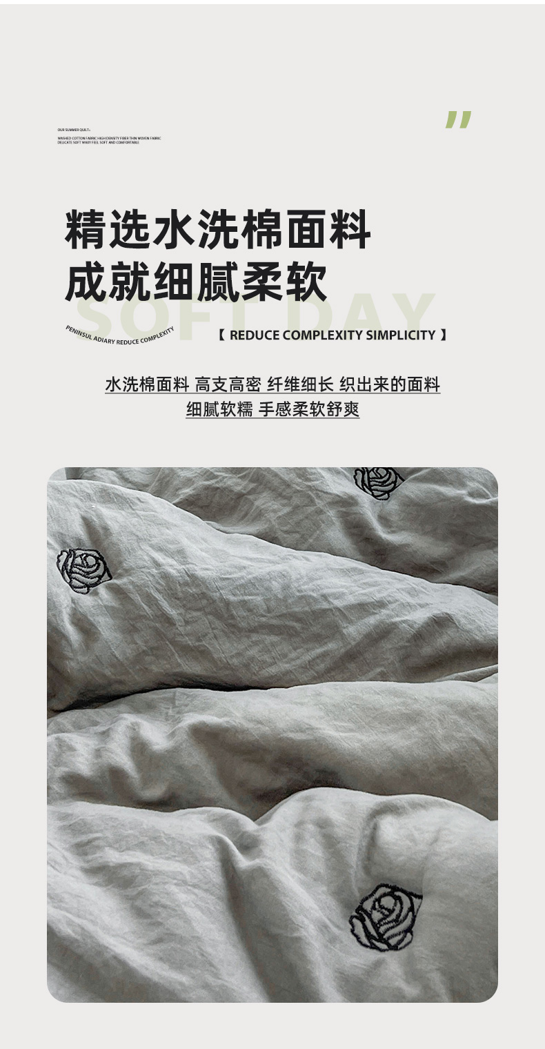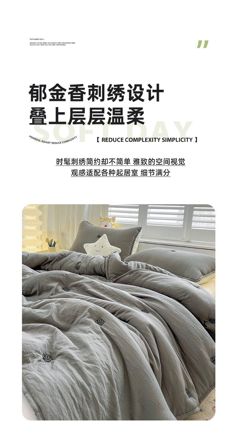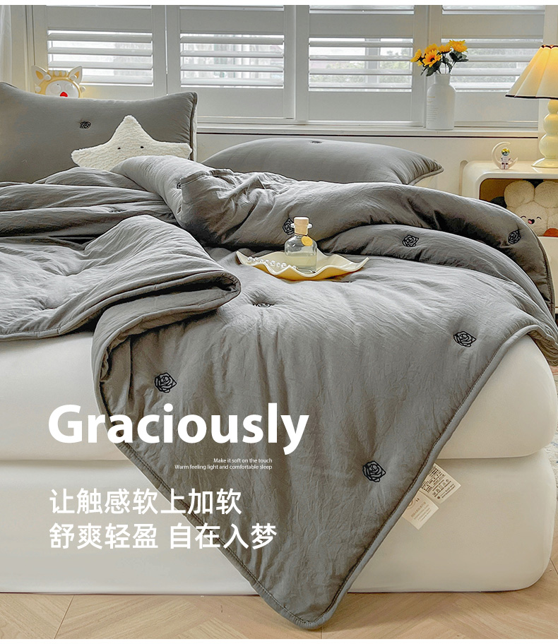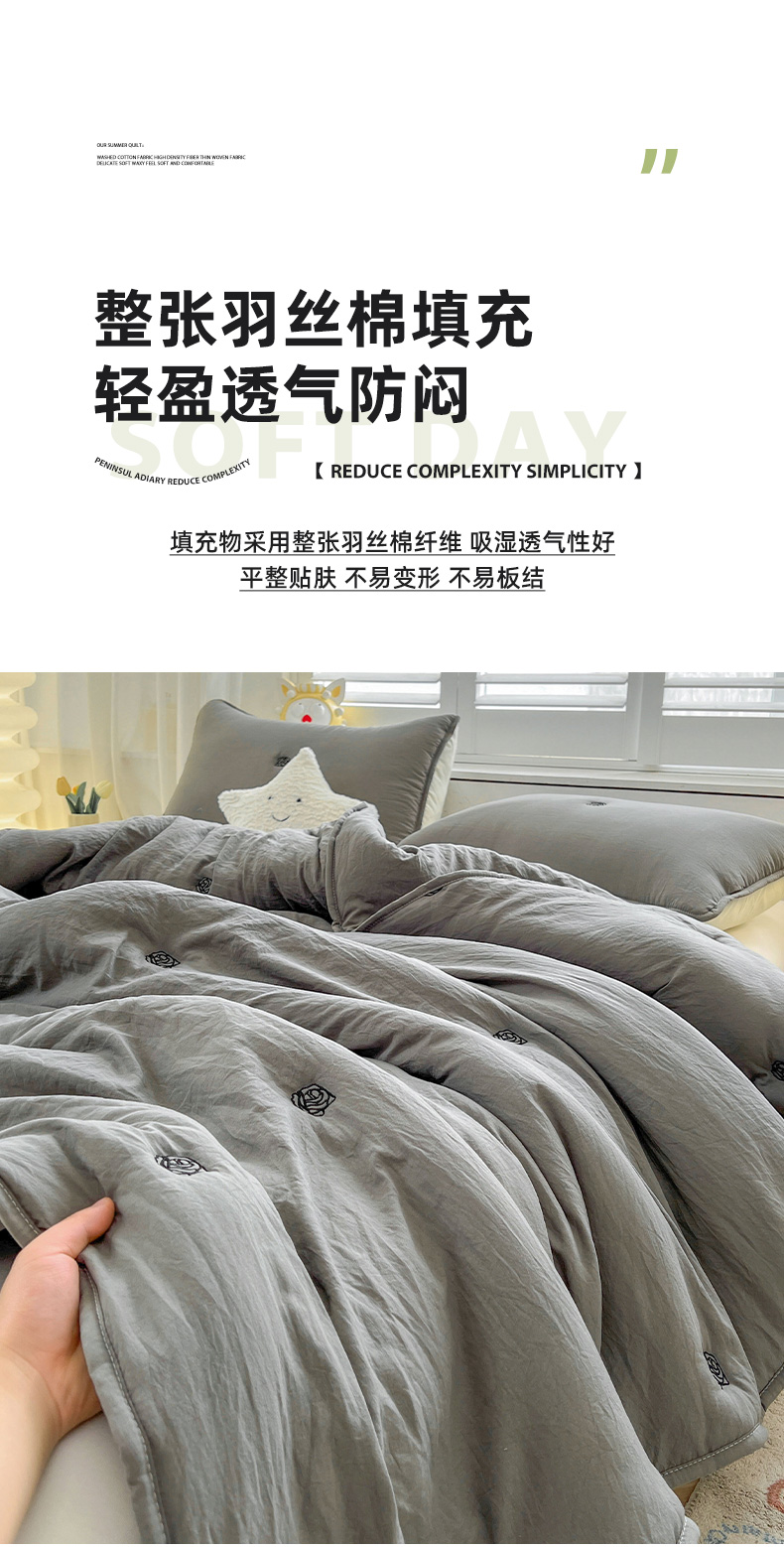 商品名称:推推家纺 2025新款水洗棉玫瑰刺绣夏被 玫瑰-灰色