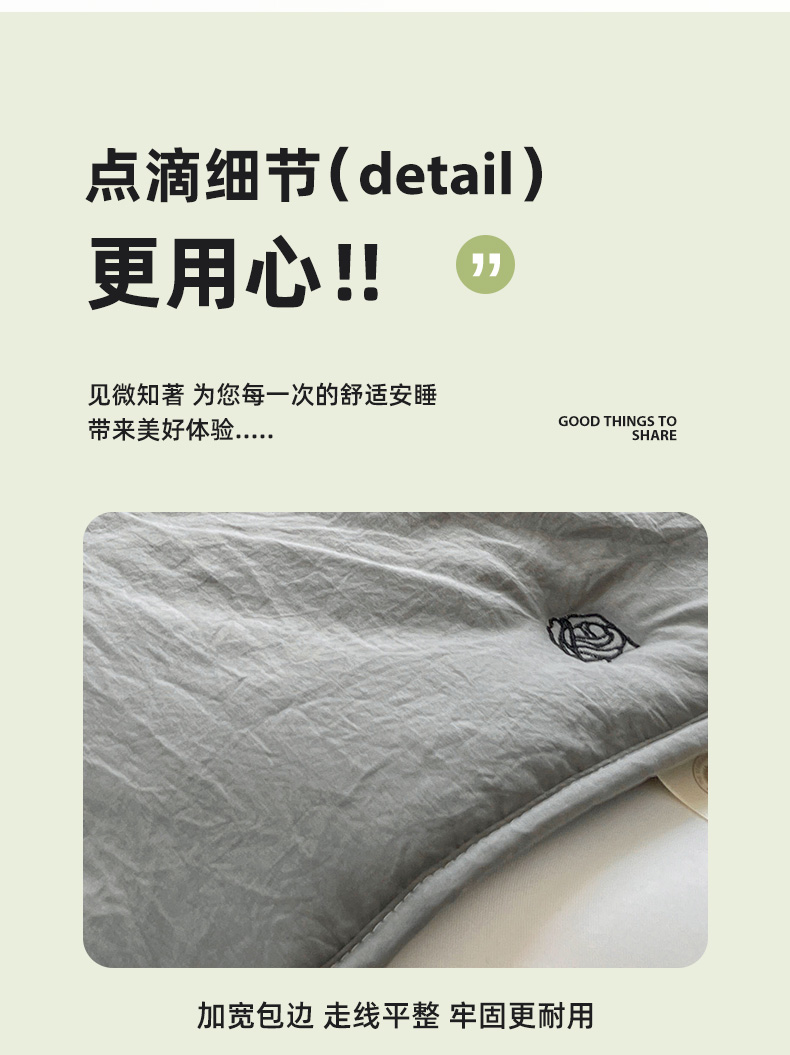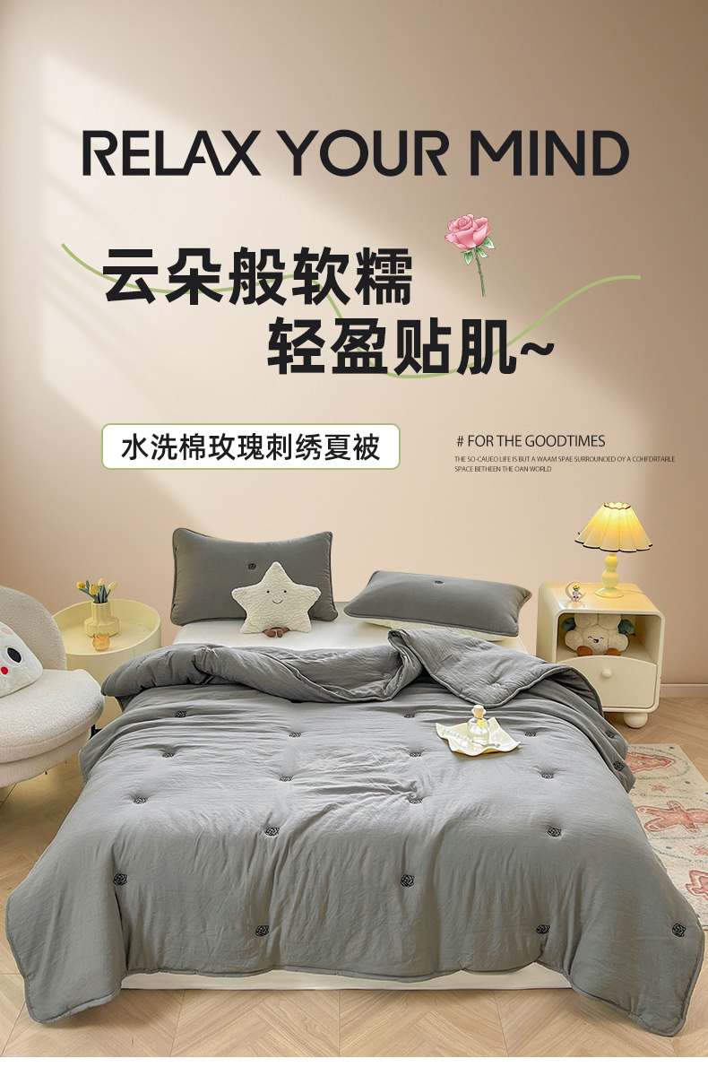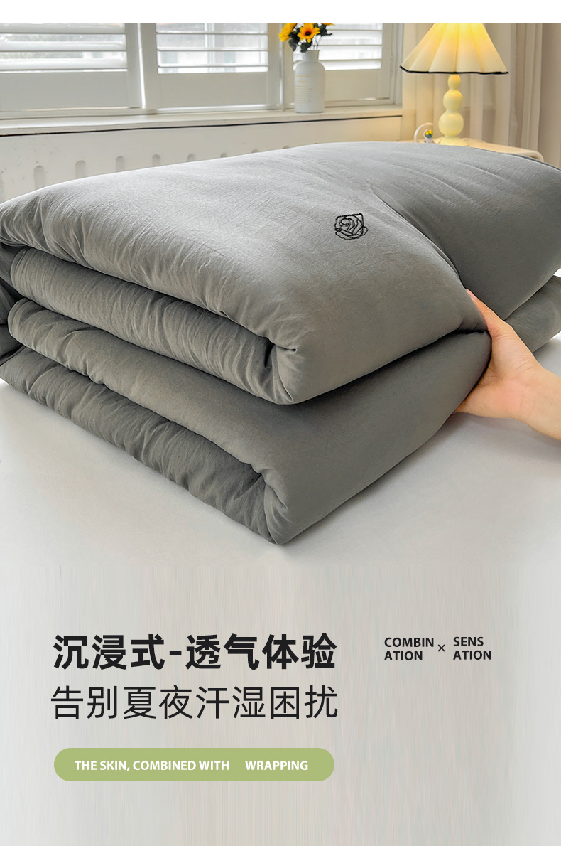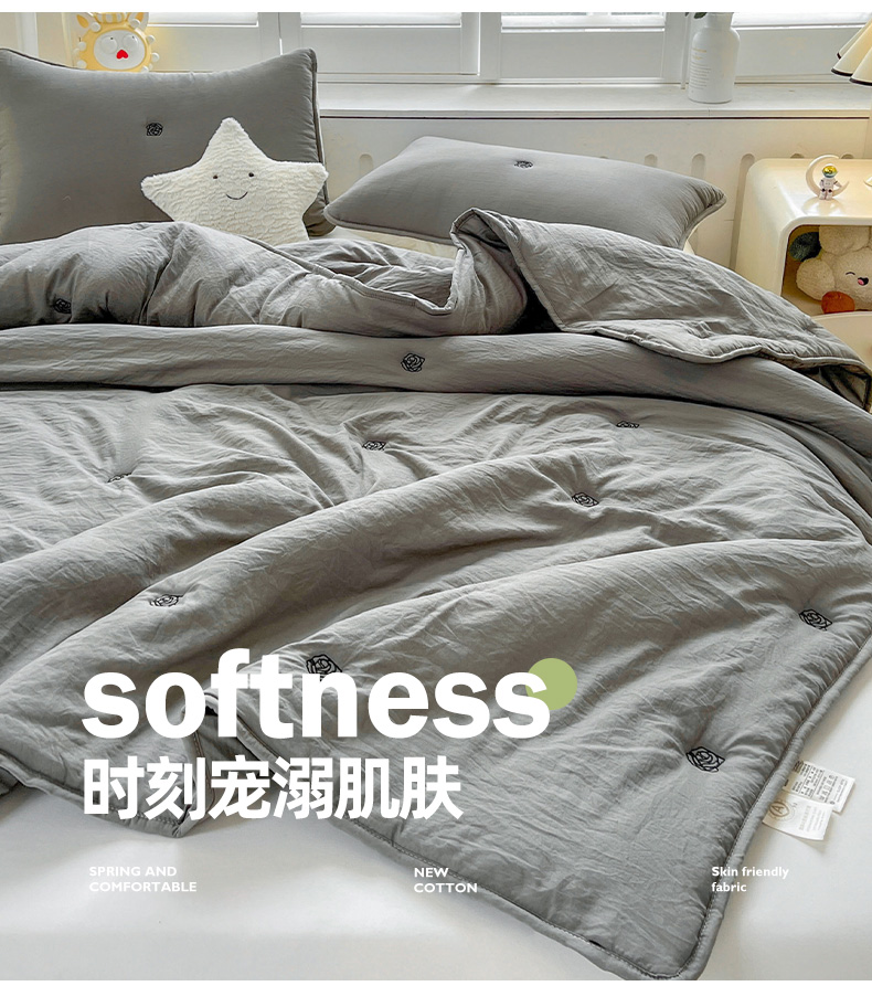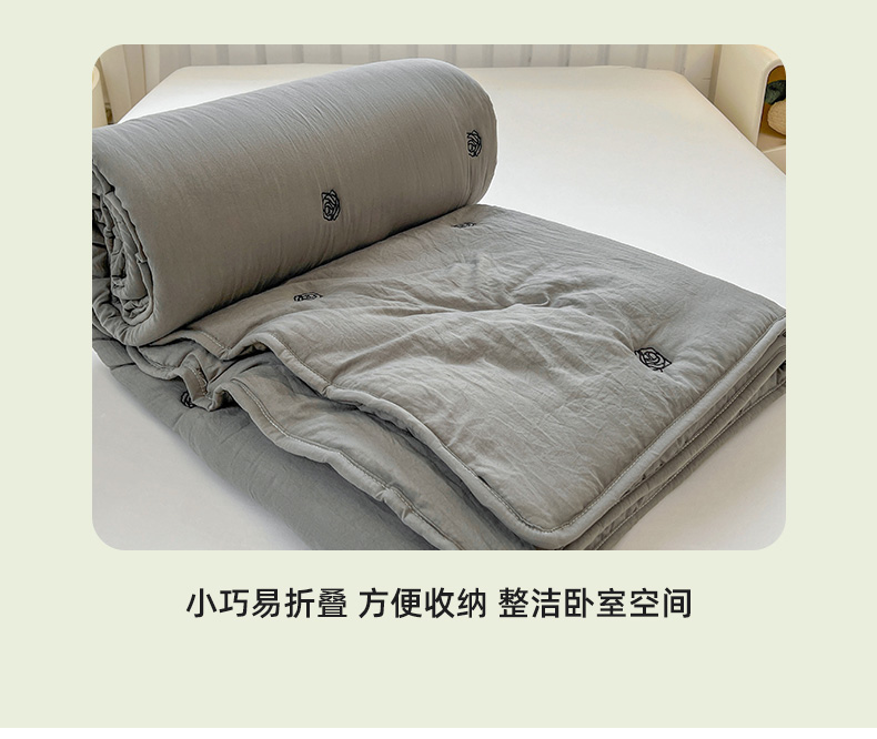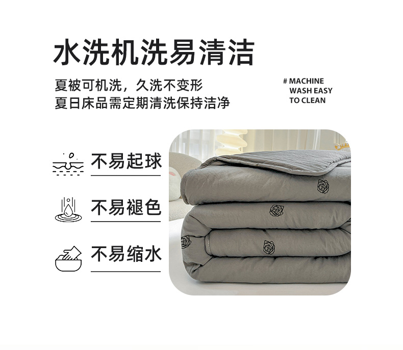推推家纺 2025新款水洗棉玫瑰刺绣夏被 玫瑰-灰色