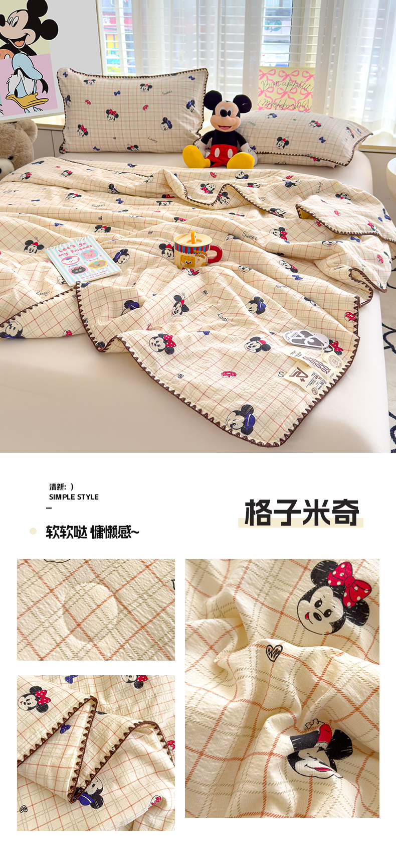 星巴k家纺 2025新款贝壳绣三角针花边工艺款贝壳边夏被夏凉被空调被四件套【可提供买家秀】 格子米奇