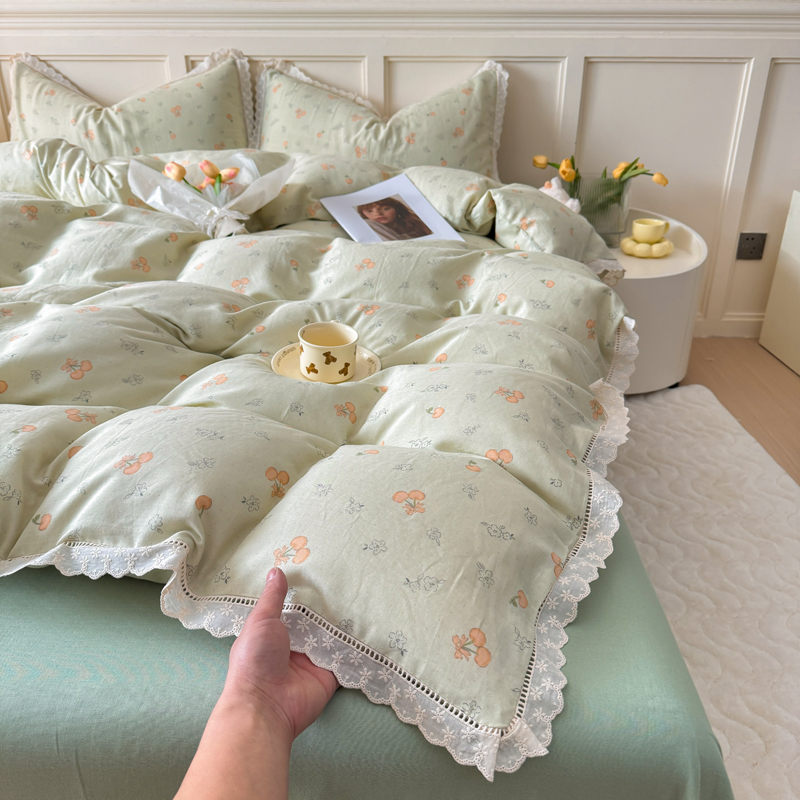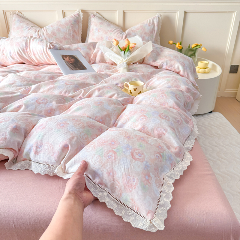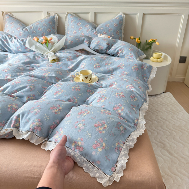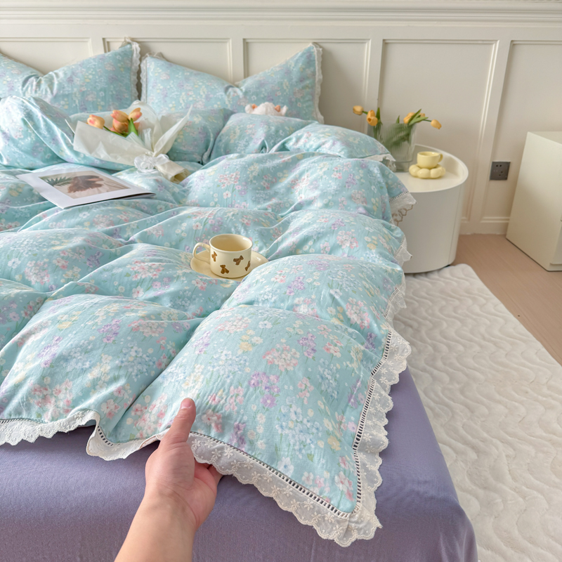 商品名称:(总)【苏东来】2025韩版蕾丝花边纯棉全棉双层纱四件套全棉纯棉小碎花印花四件套法式赫本公主风韩系皱皱纱花边四件套针织棉四件套件