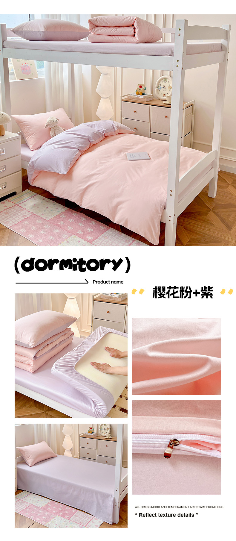 商品名称:泽西家纺 2025新款A类加密全棉40支13376简约风宿舍双拼纯色纯棉学生三件套 樱花粉+紫