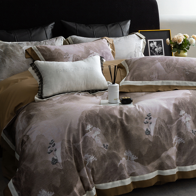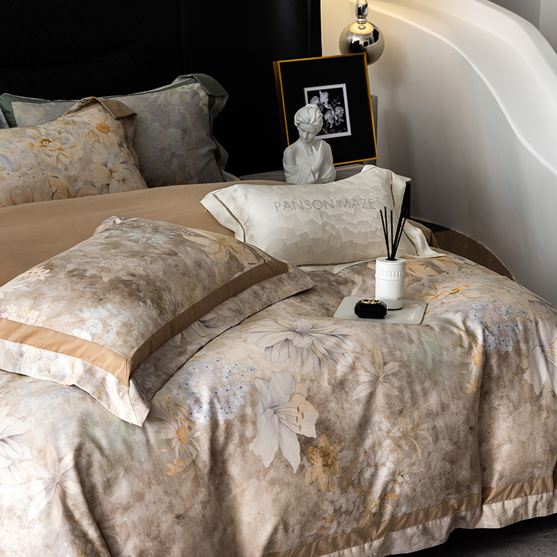 威克凯丽 2024新款长绒棉数码印花100S磨毛双拼四件套 华丽世-B浅驼