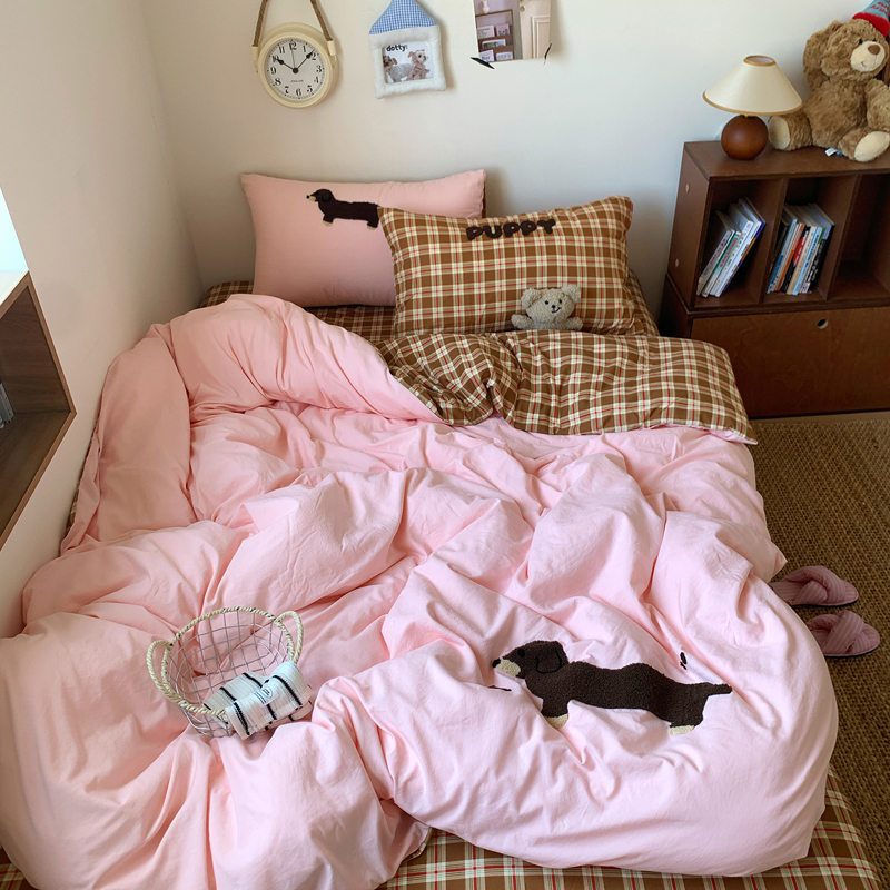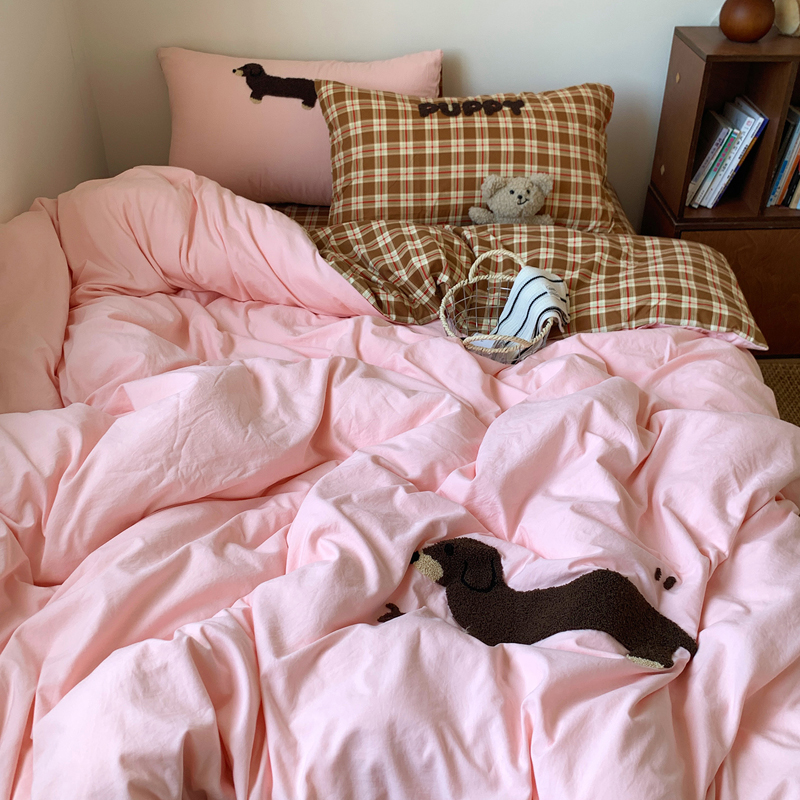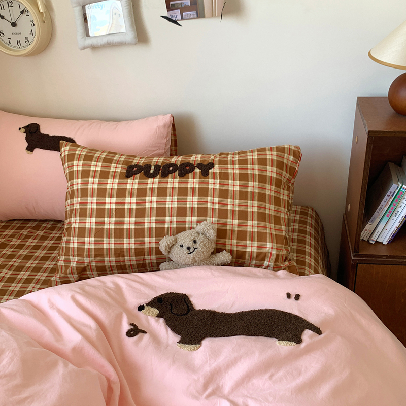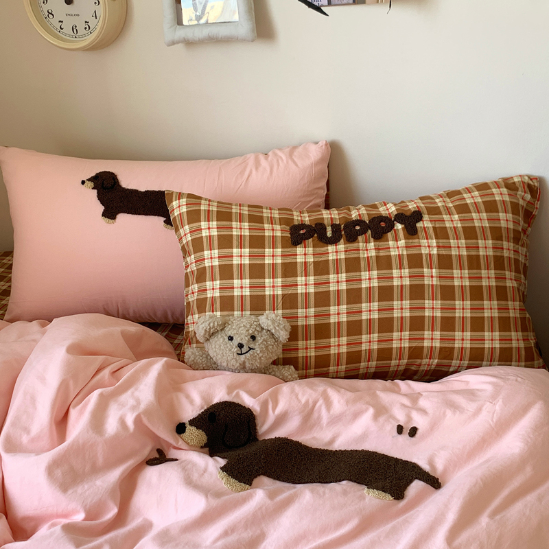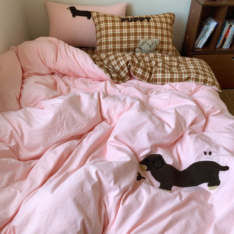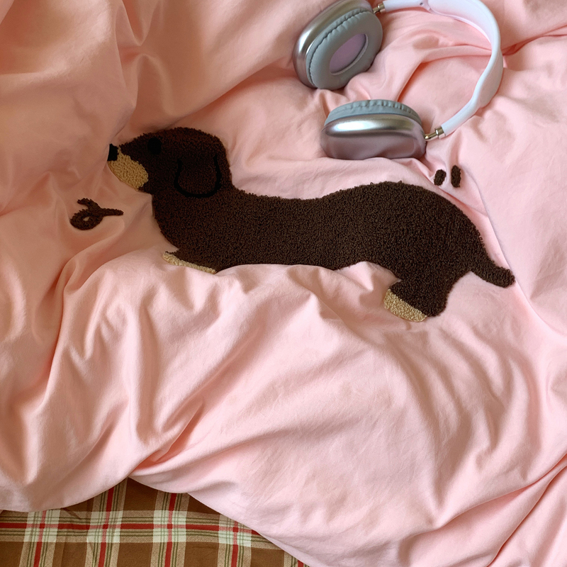 当前位置: 91家纺网 > 商品网购 > 床品套件 > 四件套 > 水洗棉四件套 > 桃喜 2025新款韩系卡通水洗棉毛巾绣四件套 粉色腊肠狗