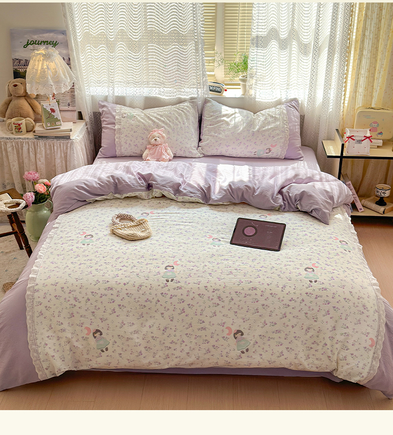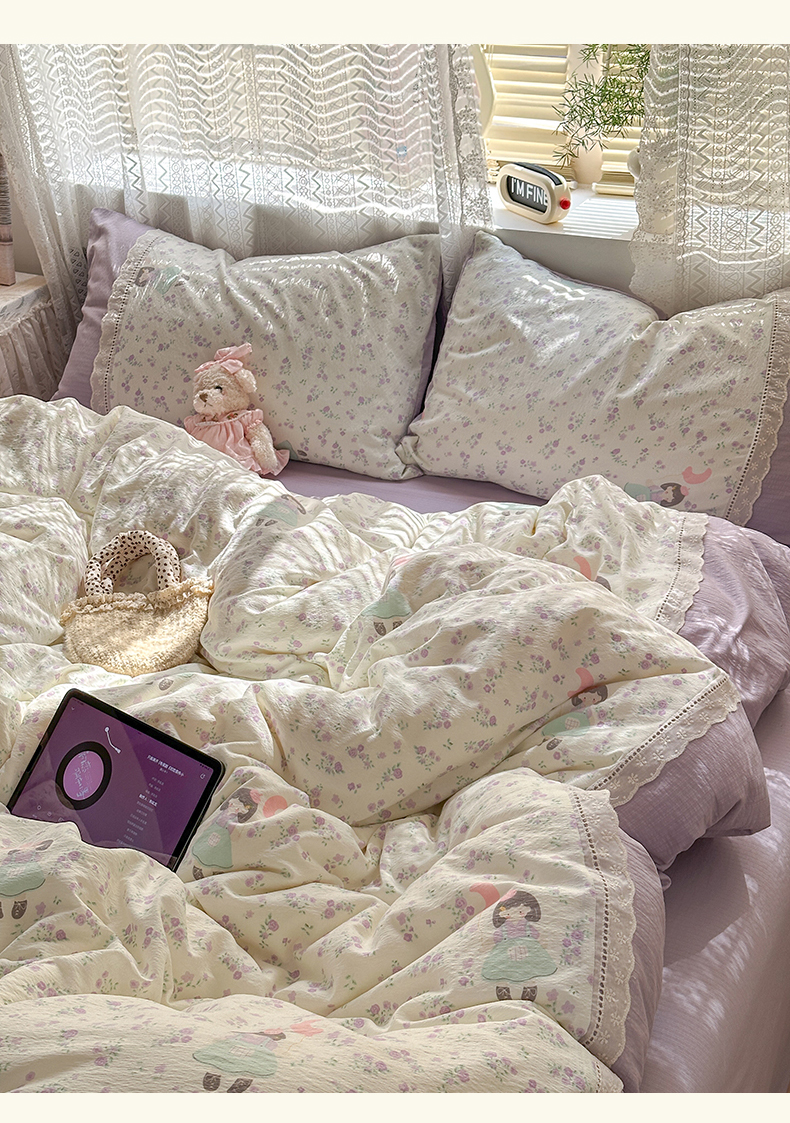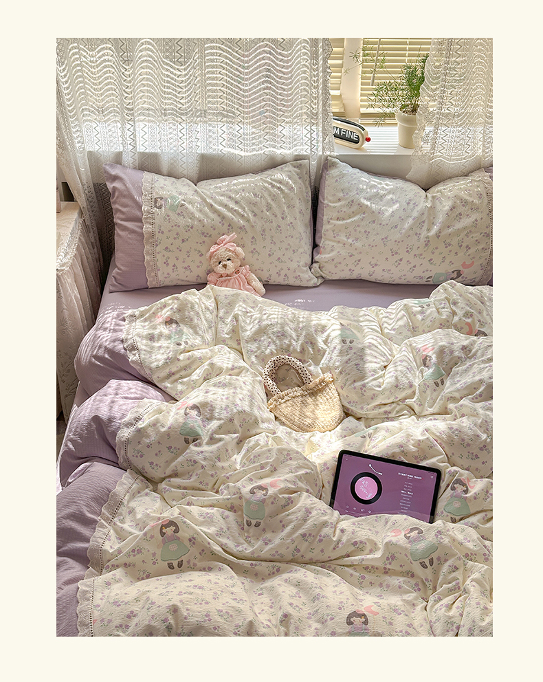 当前位置: 91家纺网 > 商品网购 > 床品套件 > 四件套 > 全棉普通四件套 > 罗亿家纺 2025新款云感双层纱全棉纯棉镂空花边四件套 梦境-思念女孩