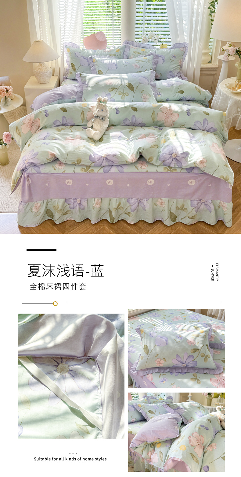(总)美达家纺 2025新款全棉AB版单层床裙,解语花,南湘,沁雨花叶,悦棠,花香梦境,夏沫浅语-蓝